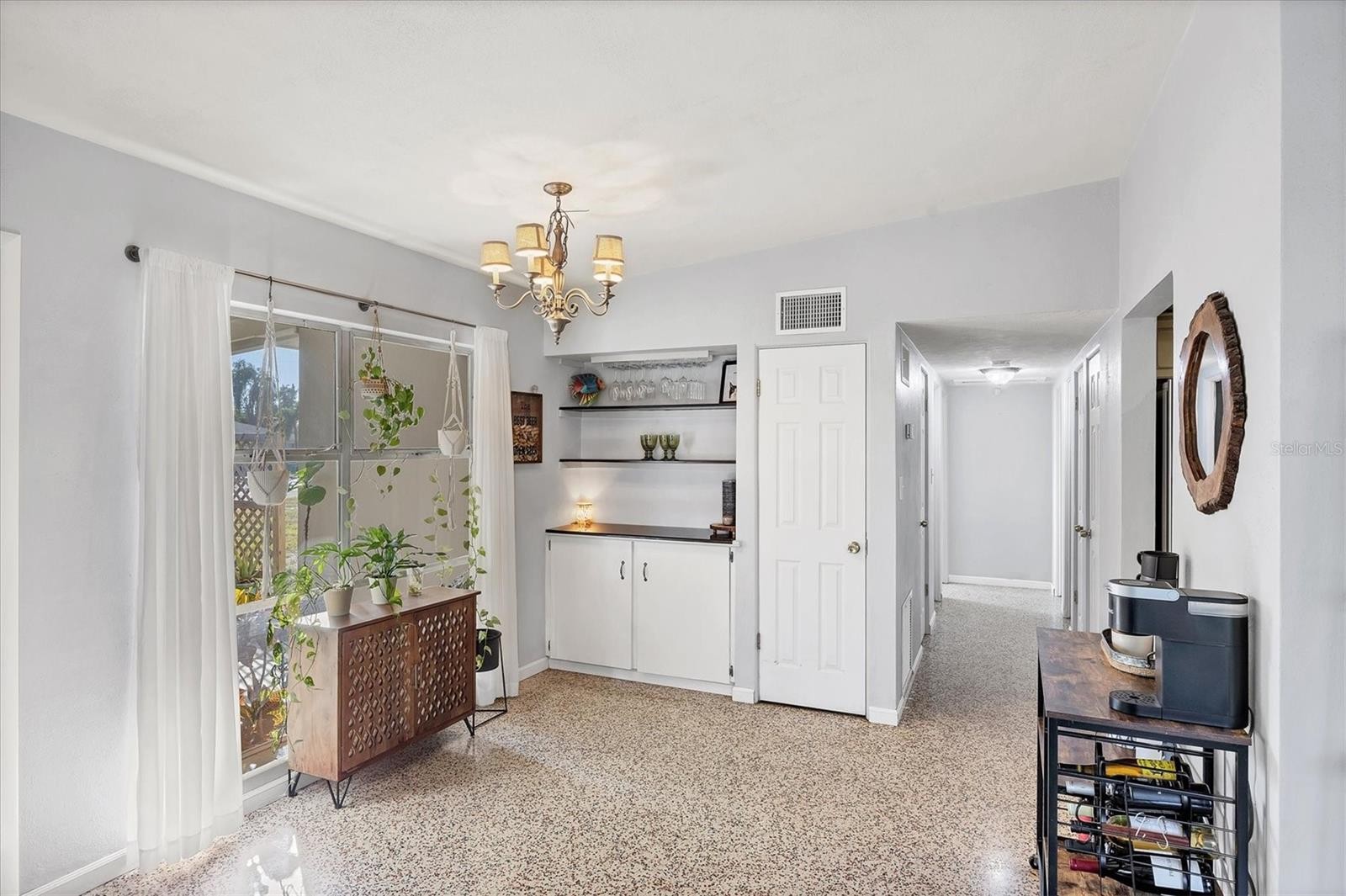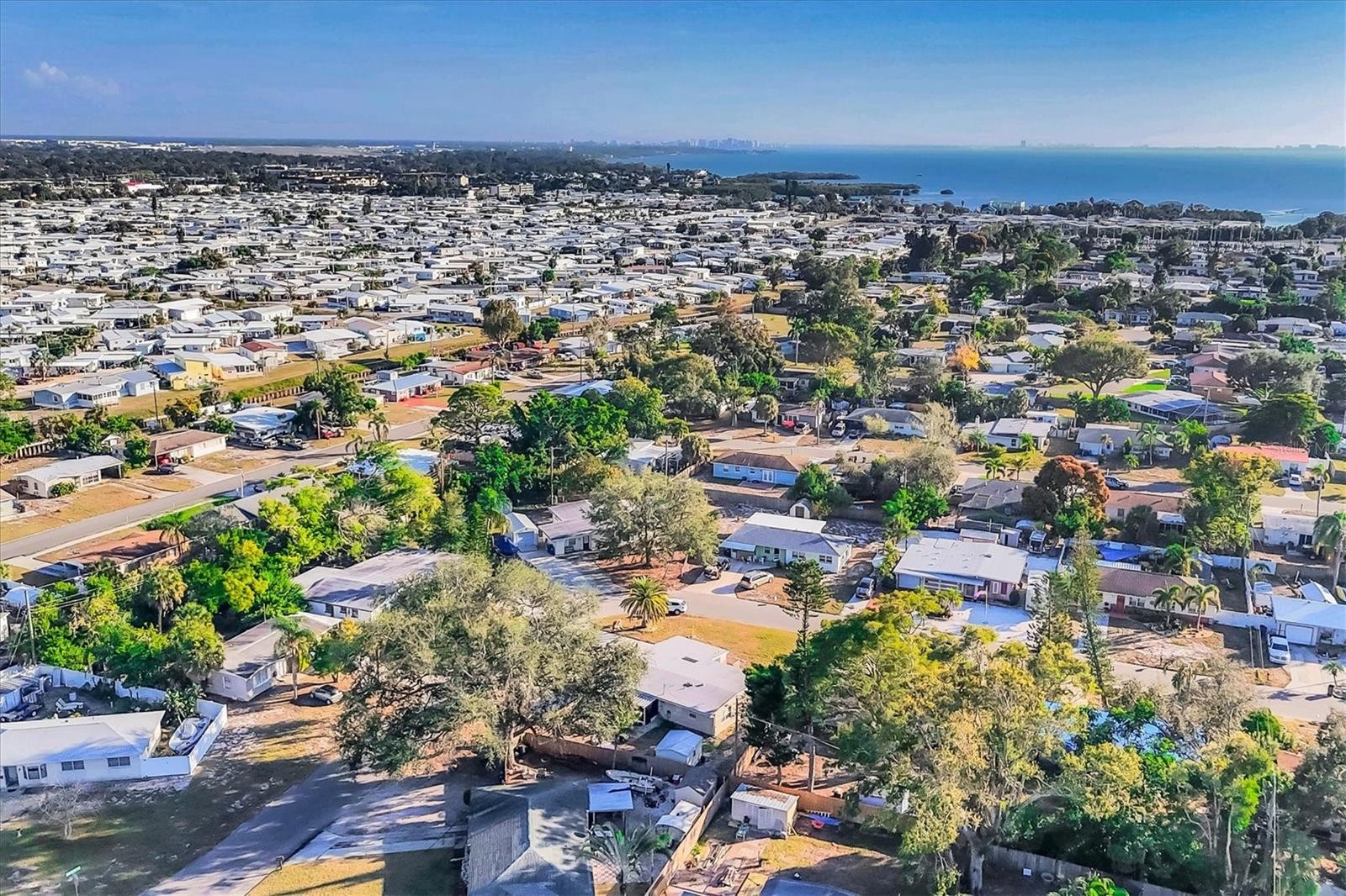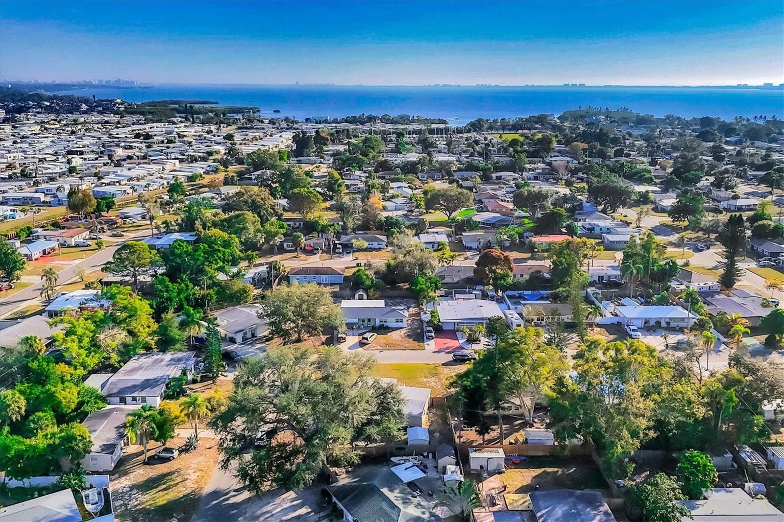 Charming mid-century modern home located on an oversized corner lot with thoughtful updates and fantastic outdoor living. This 3-bedroom, 2-bath home features a bright great-room layout with polished terrazzo floors and warm mid-century character throughout. The updated kitchen includes French-cream cabinetry, solid-surface counters, ceramic backsplash, and stainless steel appliances, with an adjoining dining area and a flexible all-seasons Florida sunroom. Major improvements were completed in 2019, including a new roof, updated plumbing, and newer A/C. Most recently (2025) the home has new exterior paint, new front windows, new backyard fence (2024) and a new garbage disposal—making this home truly move-in ready. The fenced in backyard is ideal for relaxing or entertaining with a fire pit, paver patio, and plenty of room for pets. Storage is abundant, with a backyard shed that stays, plus covered storage under the carport. Additional features: optional $10 HOA, access to the Bayshore Gardens recreation center with pool, park, marina and boat ramp, home is NOT located in a flood zone, and conveniently located near shopping, dining, and the Gulf beaches. This lovingly maintained mid-century home is ready for its next owners. Set up your showing today!