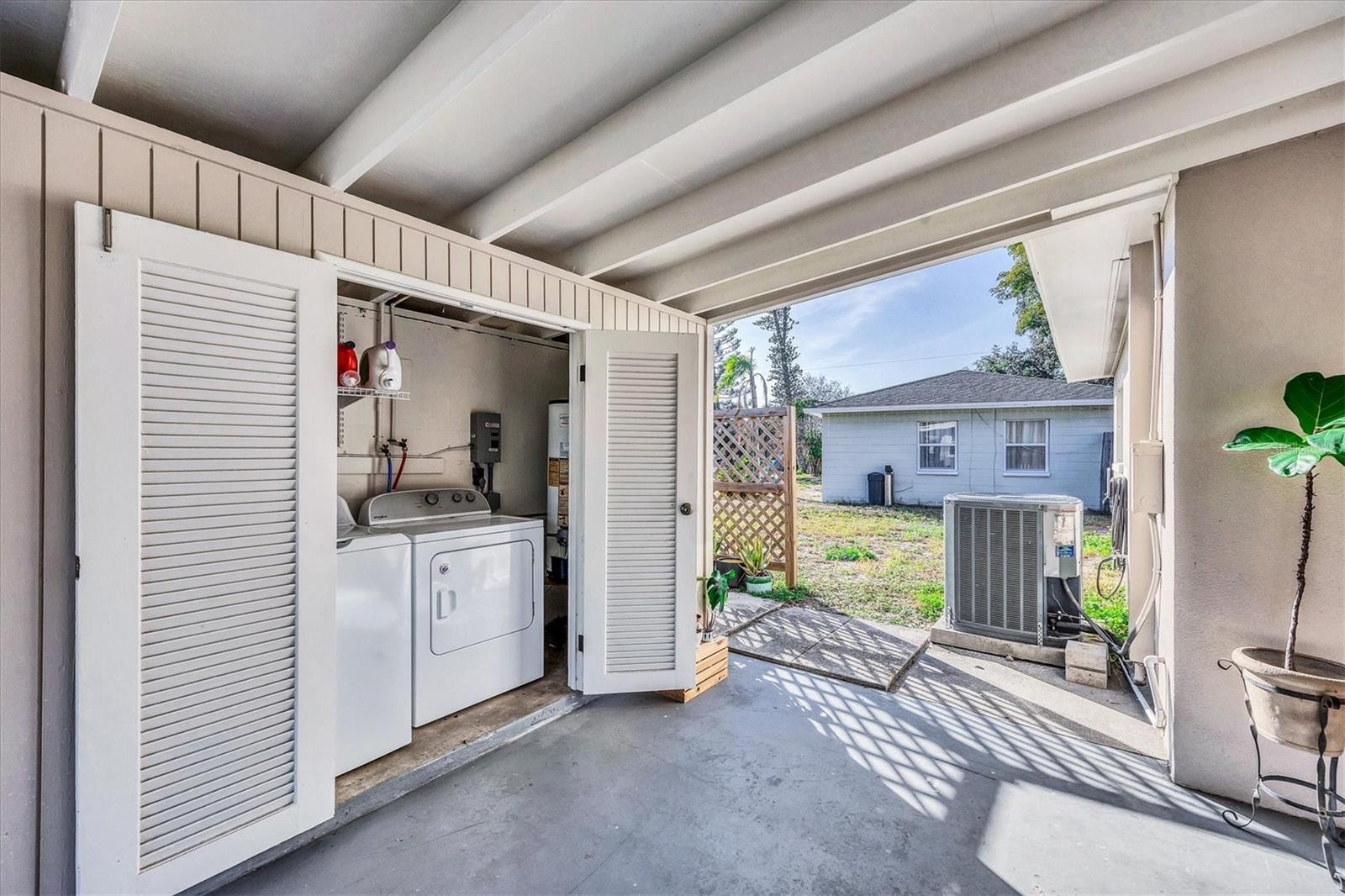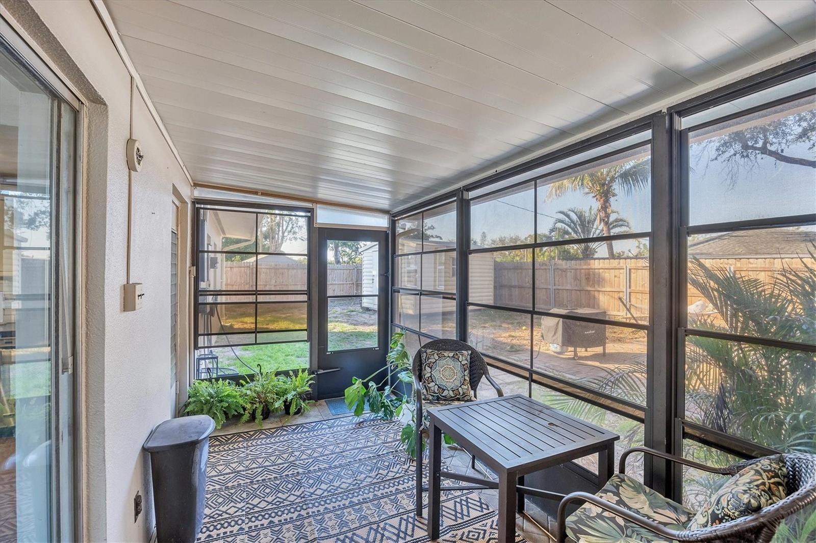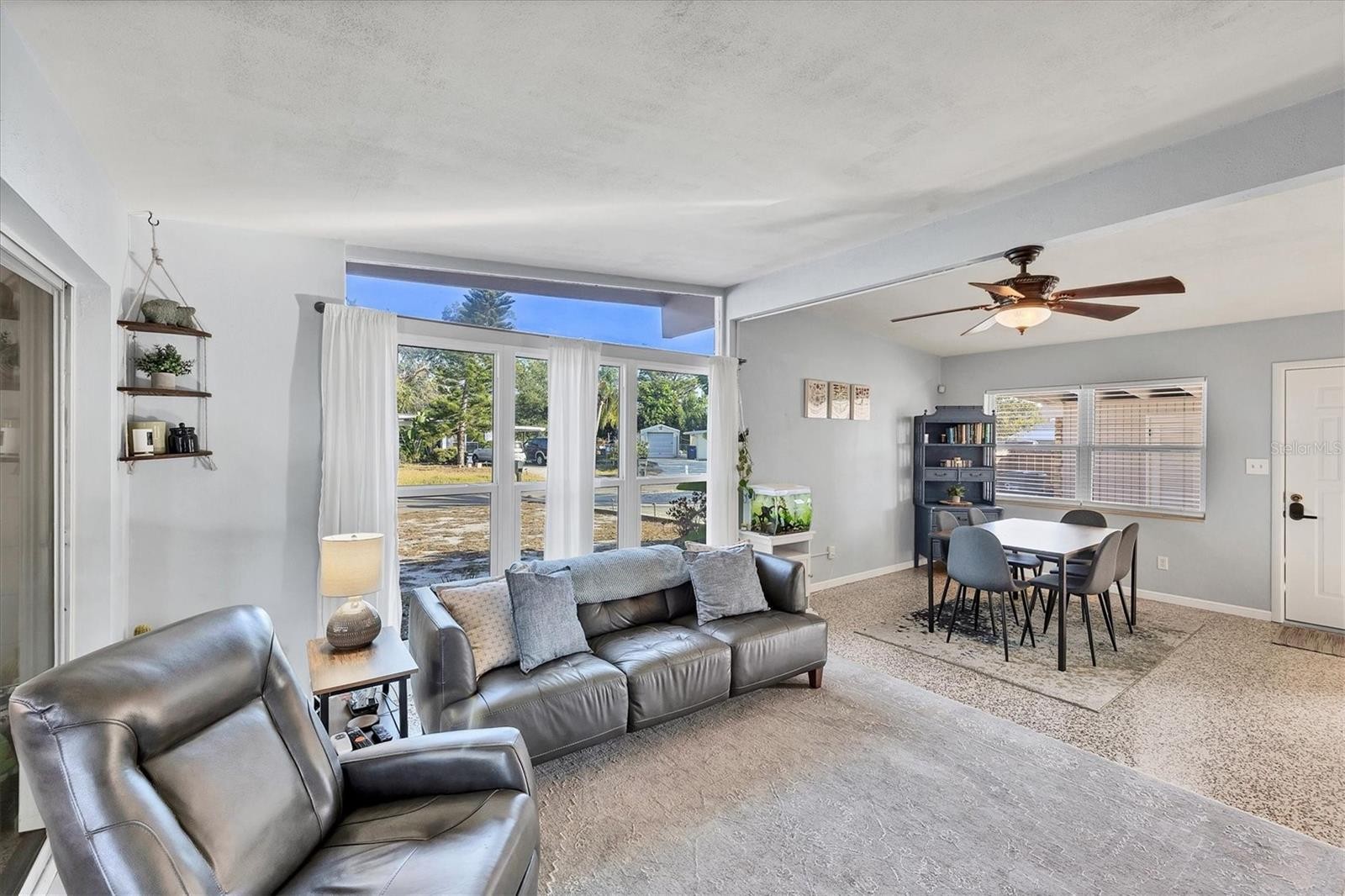 Charming mid-century modern home located on an oversized corner lot with thoughtful updates and fantastic outdoor living. This 3-bedroom, 2-bath home features a bright great-room layout with polished terrazzo floors and warm mid-century character throughout. The updated kitchen includes French-cream cabinetry, solid-surface counters, ceramic backsplash, and stainless steel appliances, with an adjoining dining area and a flexible all-seasons Florida sunroom. Major improvements were completed in 2019, including a new roof, updated plumbing, and newer A/C. Most recently (2025) the home has new exterior paint, new front windows, new backyard fence (2024) and a new garbage disposal—making this home truly move-in ready. The fenced in backyard is ideal for relaxing or entertaining with a fire pit, paver patio, and plenty of room for pets. Storage is abundant, with a backyard shed that stays, plus covered storage under the carport. Additional features: optional $10 HOA, access to the Bayshore Gardens recreation center with pool, park, marina and boat ramp, home is NOT located in a flood zone, and conveniently located near shopping, dining, and the Gulf beaches. This lovingly maintained mid-century home is ready for its next owners. Set up your showing today!