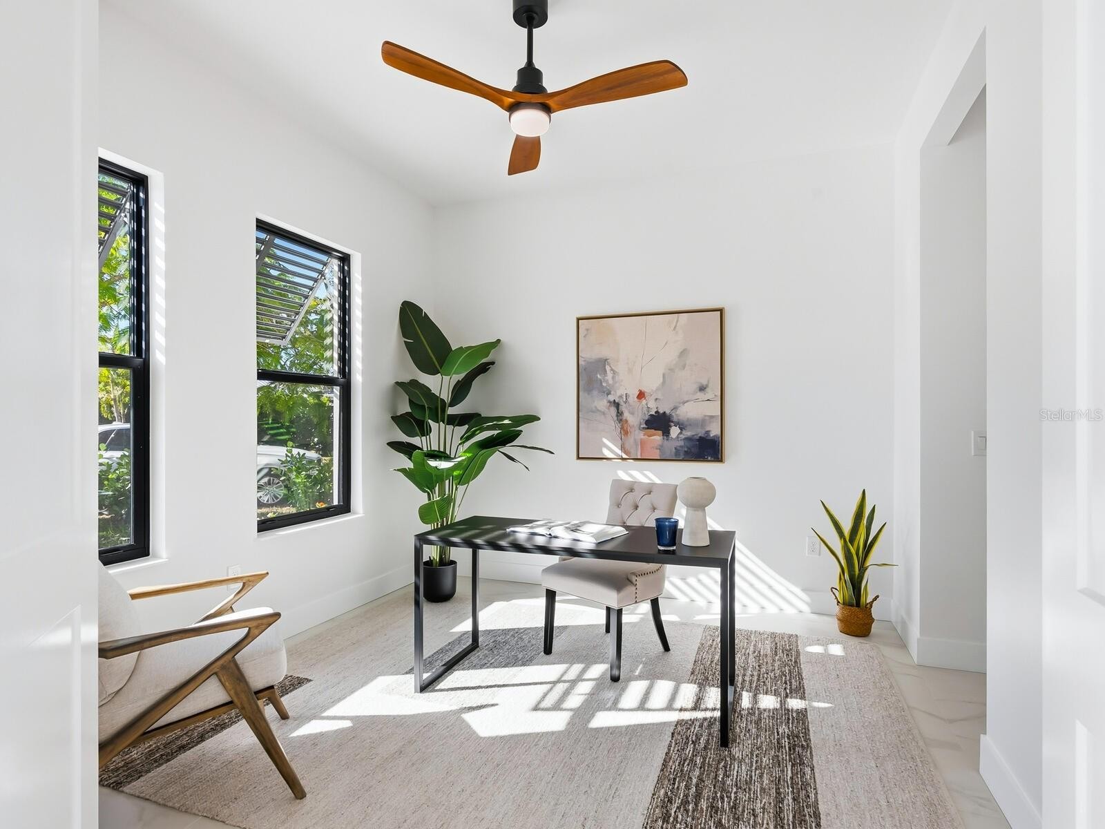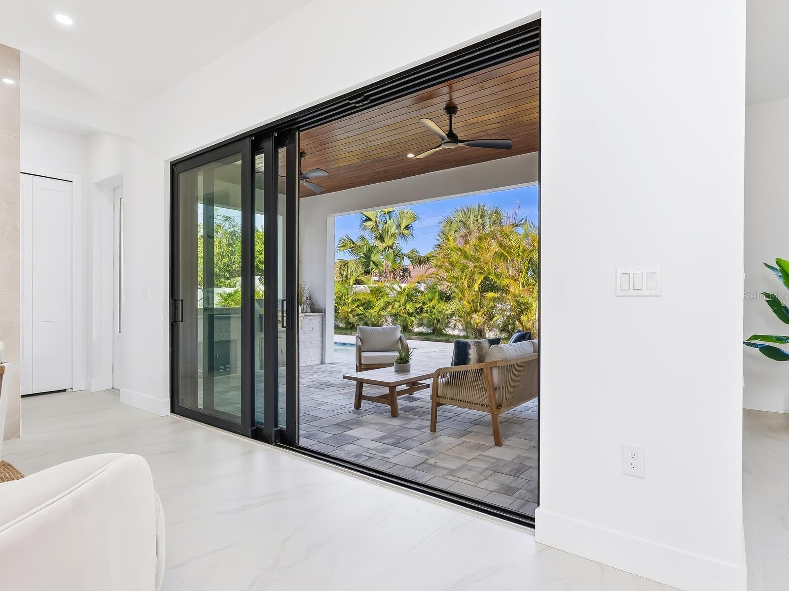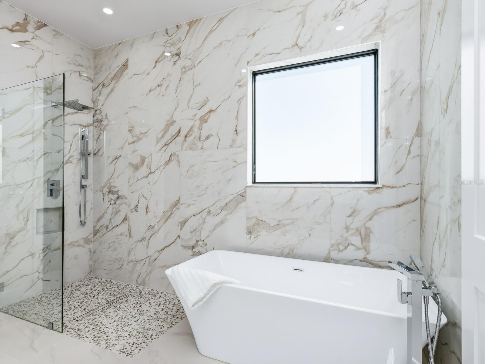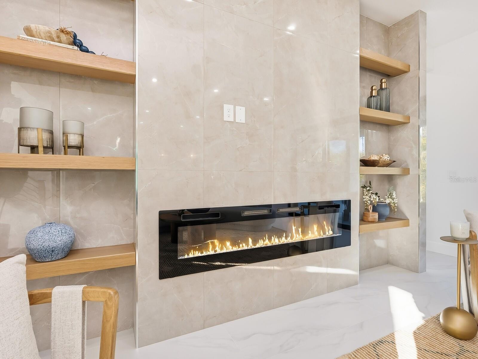 In the well-established Loma Linda Park neighborhood in Sarasota, this new construction, Divald Homes custom-built two-story home offers a blend of modern design and traditional elements. The home is ideally near downtown Sarasota, Siesta Key and Sarasota Memorial Hospital, with no deed restrictions or HOA fees. The home features four bedrooms and three baths, including a spacious primary suite on the main floor. The open-concept floor plan featuring a 24-by-48-inch modern floor tile throughout, large sliding doors and windows offers a light-filled welcoming space ideal for entertaining. The main floor includes a gourmet kitchen, dining area, living room, private den/bedroom 4, primary suite with an ensuite bath and a dedicated laundry room. The chef’s kitchen is a centerpiece, showcasing Bosch appliances, an oversized island with waterfall quartz countertop, and custom floor-to-ceiling full-overlay cabinetry in a beautiful honey-stained wood tone. The living room is highlighted by a striking marble tile accent wall with custom wood shelving and modern designed 42-inch linear electric fireplace. The living room opens seamlessly to the lanai, complete with an outdoor kitchen, including a gas grill, refrigerator and sink. You will also enjoy the pool with sundeck, oversized outdoor patio and a beautiful backyard with lush native plantings. A convenient pool bath offers direct access from the lanai and the private den. The dining area is elegant and inviting, featuring a statement iron chandelier and a wall of windows overlooking the backyard. Just off the kitchen, the main-floor primary suite serves as a private retreat with a luxurious en-suite bath featuring a marble stone accent wall, a large walk-in shower with seamless glass enclosure, a sculptural slipper tub, double vanity with quartz countertops, natural wood cabinetry, LED mirrors and a spacious walk-in closet with custom built-ins. The laundry room is conveniently near the oversized two-car garage with 12-foot ceilings, large windows for natural light and direct access to the side yard. Upstairs, an ornate wrought-iron and hardwood staircase leads to two additional bedrooms, a beautifully finished guest bath and a versatile flex room ideal for a game room, study or guest accommodations. This thoughtfully designed home offers refined finishes, flexible living spaces and an exceptional location, ideal for enjoying the Sarasota lifestyle.