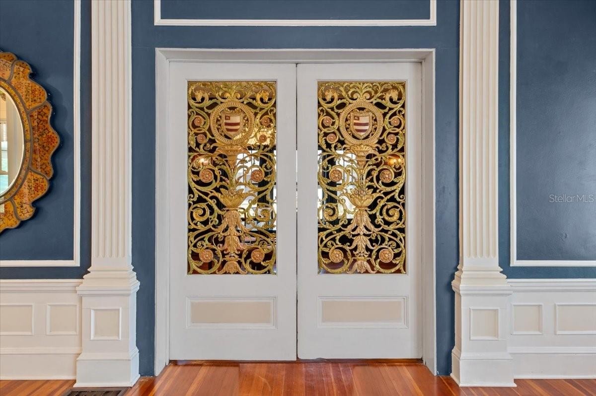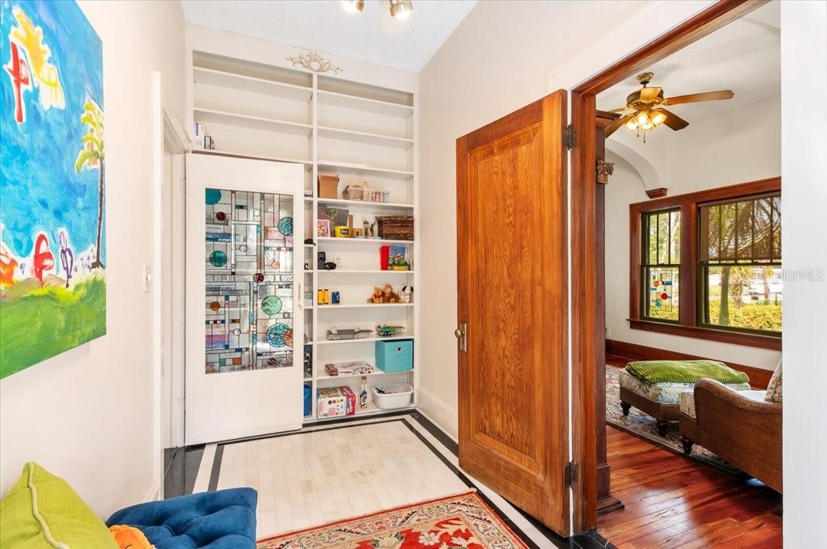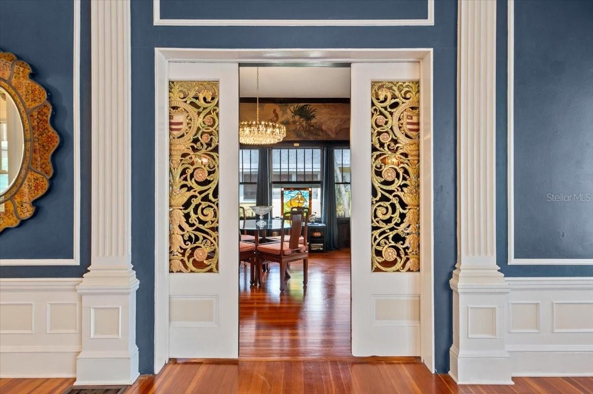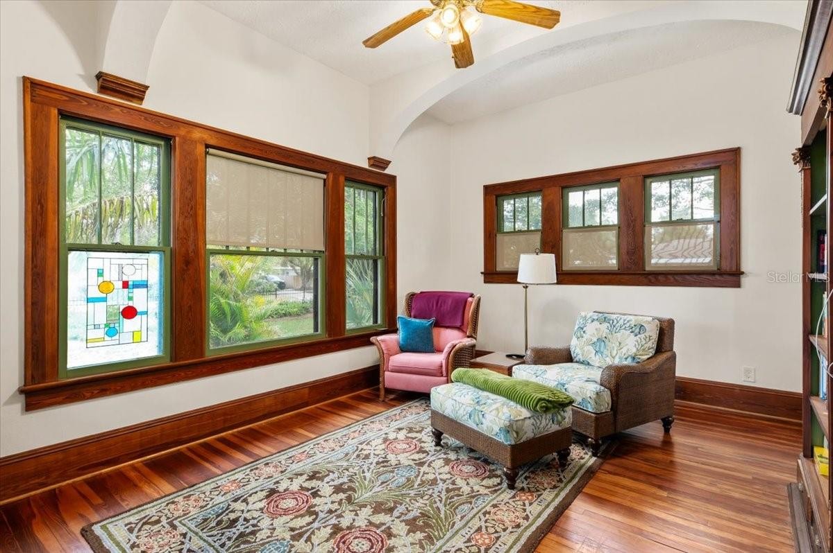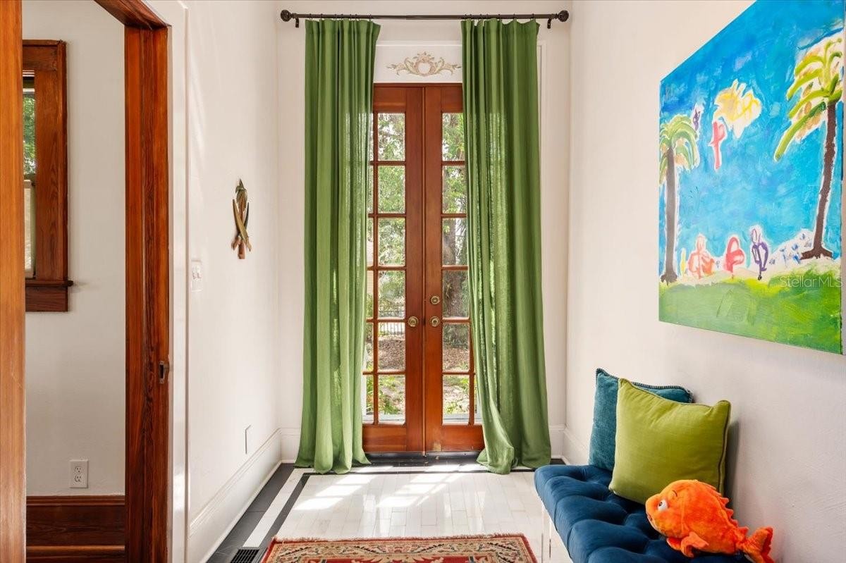 Come home to your oasis, a home distinguished by refined elegance and old Florida charm. Built around 1928 as the personal residence of Dr Blake Lancaster, a local surgeon, painter, and musician, this is no old house with a cookie cutter renovation. Move-in ready, the home has preserved features and historic patina that combine with modern functionality for a light- filled and joyful ambience. With spacious rooms and 10’4” ceilings, it is perfect for those who love to entertain or host fun family gatherings, who seek a serene retreat or who crave a huge canvas to express their creativity. Miraculously, many original features remain: gleaming heart- pine flooring, 7’ mahogany veneer paneling, 4 original murals by Lancaster; arched ceilings, carved pilasters, gilted carved pocket doors, impressive Art Deco light fixtures, a built-in bookcase & mahogany wardrobe. Renovations and updates (between 2020-24) include kitchen and laundry with new LG appliances, bathrooms, window glazing, plumbing, electrical, new roof, & 3 new A/C units. Additions include a bespoke stained-glass interior door, ornamental fence, & backyard irrigation. A new 400 sq ft sunroom (2023) features ceiling-to-floor doors that open onto the deck of a 29’ heated, saltwater pool with sun shelf + bubbler. Sweeping views of the rear garden transport you to a leafy preserve, with winding nature trails, raised garden beds, lush tropical trees, flowering vegetation, even insect hotels! An outdoor chessboard with oversized playing pieces lend a European city park vibe; a climbing structure created from lighter trees is a kids’ favorite. A 12x20’ custom shed (2022) is stylistically in step with the house & fully wired with A/C; it is used as workshop but could be converted into pool house, art studio, or office. Two rooms in the house – the breakfast room and the former east foyer, now a playroom – are also versatile and could be repurposed, and prior owners used the study as a 4 th bedroom. So many options! Unlike many older homes, this one offers great storage, including walk-in closets in every bedroom and a walk-in linen closet upstairs. Main bedroom is downstairs. The home is solidly constructed on a raised foundation to minimize risk of flooding. The rear lots (~.8 acre) are zoned residential, but options to develop are almost limitless with city approval: homes for the next generation, in-law or Airbnb cottages, a retreat center, a wedding venue. Or keep the entire property as it is, your oasis, an escape that invites you to relax and play, that inspires you and draws out your creativity. A copy of the history of the house conveys. Many furnishings negotiable, if turnkey is preferred. This remarkable home is set in a diverse and friendly neighborhood, walkable to Olde Manatee, the Bradenton Riverwalk & Manatee River. Close proximity to public boat launch on Braden River, golf courses, shops, restaurants, & grocers. Minutes to downtown Bradenton, Saturday farmers market, & marina; 11 miles to world-class soft-sand beaches, 20 minutes to SRQ airport or UTC mall, 30 to downtown Sarasota, 35 to St Pete, 50 to TPA airport. Discover how old Florida can enliven your future!