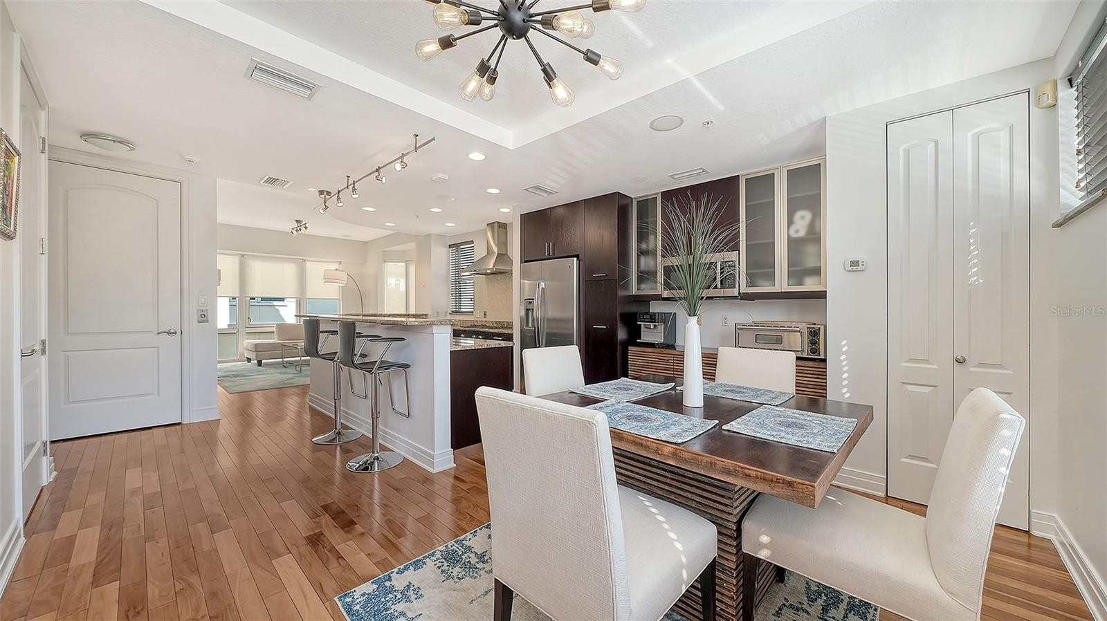 Live where Sarasota comes alive. Located just moments from Florida Studio Theater and downtown Sarasota's Main Street dining, shopping, and cultural attractions, this three-bedroom, four-and-a-half-bath luxury end unit townhouse offers the perfect blend of sophistication, comfort, and walk-everywhere convenience. This four-story residence is truly one of a kind with a private elevator, two-car garage, and nearly 2,400 square feet of thoughtfully designed living space. From the moment you enter, the home feels welcoming and effortless. The first level features the garage with lots of overhead storage, a gym with a full bathroom and storage space, and a gracious foyer that sets the tone for what’s ahead. Take the elevator or the beautifully crafted wood staircase up to the main living level, where an open gourmet kitchen anchors the space. It's complete with granite countertops, natural gas stovetop, stainless-steel appliances, breakfast bar, a half bath, formal dining area, and an inviting family room ideal for both quiet evenings and entertaining. The third floor is the private bedroom level offers a serene primary suite and a second bedroom, each with walk-in closets and ensuite baths—perfectly designed for comfort and privacy. The top floor is a true standout: a flexible bonus space or guest suite with kitchenette and access to outdoor space ideal for grilling, relaxing, or tending plants. Tucked within a gated community featuring a heated pool, spa, and fitness center, this residence offers easy, carefree living in the heart of Sarasota. Schedule your private showing and see how seamlessly downtown living can fit your lifestyle.