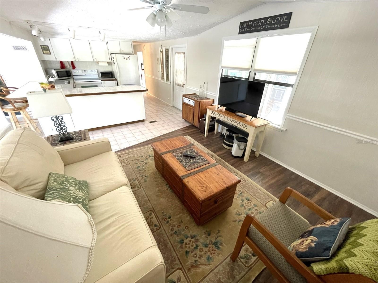 Nestled in the highly sought-after boating community of Harbor Cove, this unique and lovely manufactured home offers an impressive 1,129 sq. ft. of living space, thanks to two thoughtfully designed additions. Boasting a wide-open floor plan, the home’s kitchen seamlessly connects to the spacious living room and sun-filled dining room, where large picture windows flood the space with natural light. Just off the dining room, a charming Florida room provides the perfect spot to enjoy Florida’s mild winters. To the right of the home, a versatile addition houses a home office with laundry facilities and a bonus room ideal for crafting or hobbies. The split-bedroom layout ensures privacy, featuring two master suites—one at each end of the home. Outside, the beautifully landscaped lot is enhanced by a picturesque concrete mosaic table and benches, perfectly positioned to enjoy the serene view of the neighboring garden. A new 10' x 8' shed with a workbench offers additional storage and workspace. The home has been lovingly maintained, with a freshly painted exterior and a durable 2015 membrane roof. Turnkey furnished with an HOA of only $99 per year, this home is immaculate and ready for its next owner. Harbor Cove is a premier 55+ waterfront community known for its active lifestyle, fantastic boating access, and resort-style amenities. Residents enjoy direct access to the Myakka River, a marina and boat ramp, heated pools, a clubhouse with year-round activities, tennis and pickleball courts, and so much more. Whether you're looking for a place to dock your boat or simply relax in a vibrant social setting, Harbor Cove offers the perfect Florida lifestyle. Don't miss this rare opportunity to own a one-of-a-kind home in this highly desirable community!