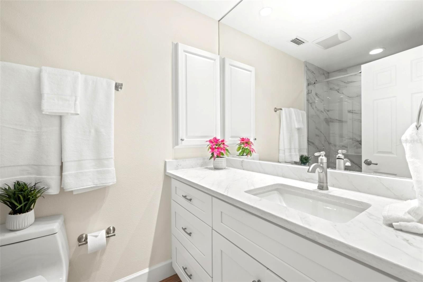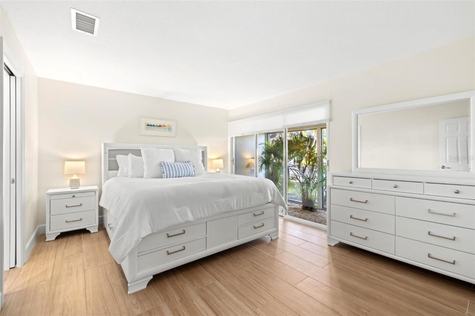 Welcome to effortless coastal living in this beautifully reimagined freestanding villa with garage, located in the premier GULF FRONT community of Whispering Sands on Siesta Key. Thoughtfully updated from top to bottom in 2025, this light-filled residence offers three bedrooms and two bathrooms with approximately 1,400 square feet of refined living space blending modern style with comfort. Upgrades include fresh interior paint, new crown molding and baseboards, textured ceilings, recessed lighting, ceramic tile flooring throughout. The spacious living room accommodates multiple seating areas and glass sliders that fill the home with natural light and create seamless indoor-outdoor living. The new kitchen is both stylish and functional, showcasing quartz countertops, soft-close white cabinetry with pull-out drawers, tiled backsplash, Frigidaire stainless appliances, and pantry storage. Sliding glass doors, from the kitchen / dining area open to a large brick paver patio, ideal for relaxing or entertaining. Privacy fencing between villas for a private setting. All three bedrooms are generously sized with flexible space for seating or a workspace. The updated bathrooms feature quartz countertops, modern cabinetry, updated lighting, and glass enclosure walk-in showers. Additional highlights include a NEW 2025 villa roof, new full-size washer and dryer, and furnishings included. Whispering Sands is a 55+ GULF FRONT community offering 800 feet of private beach, two heated pools, tiki hut, gas grills, shuffleboard, kayak storage, onsite management, and a clubhouse currently undergoing a complete remodel. Just steps from the boutiques and dining of Siesta Key Village, this move-in-ready villa offers refined, low-maintenance island living.