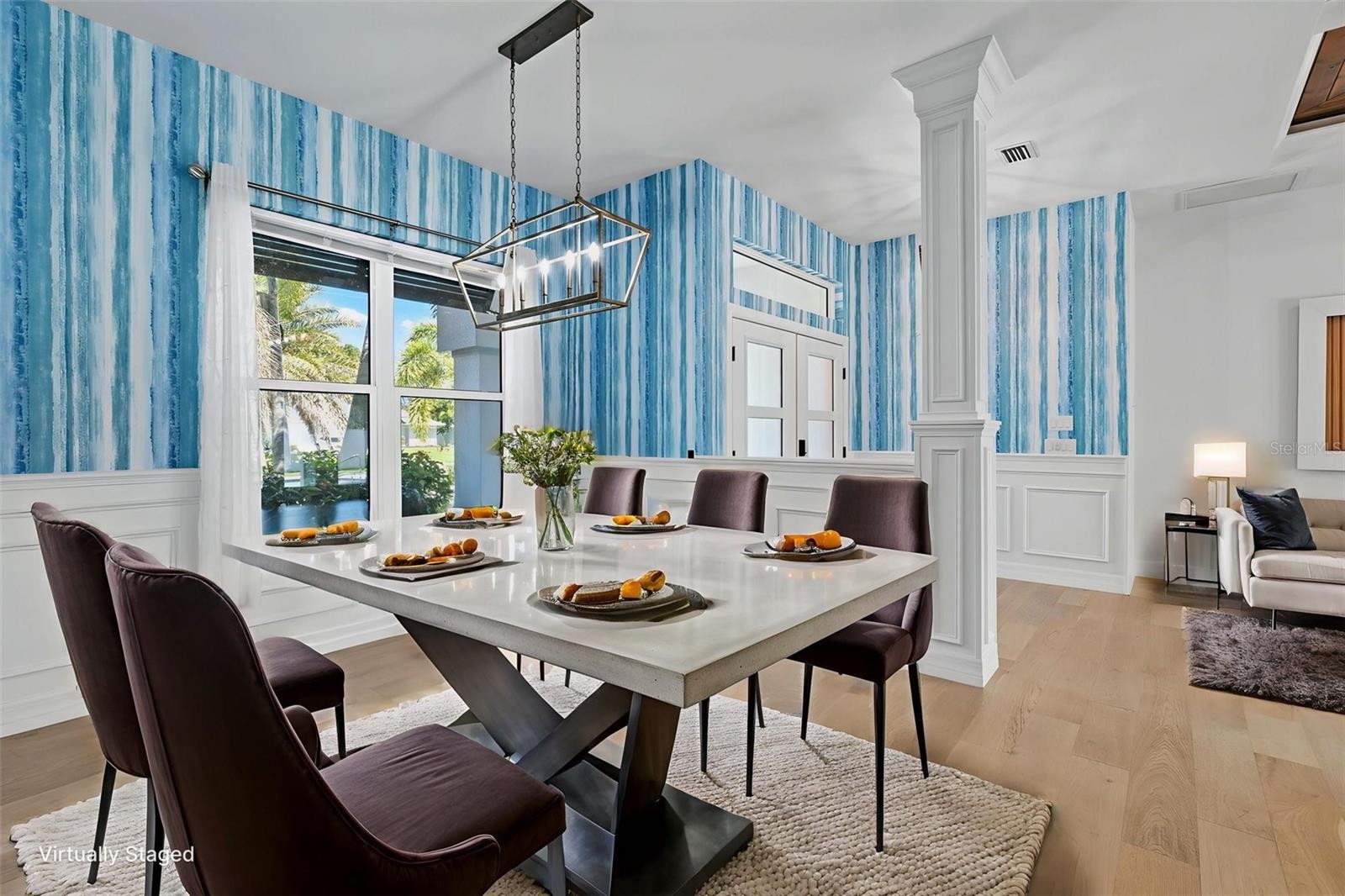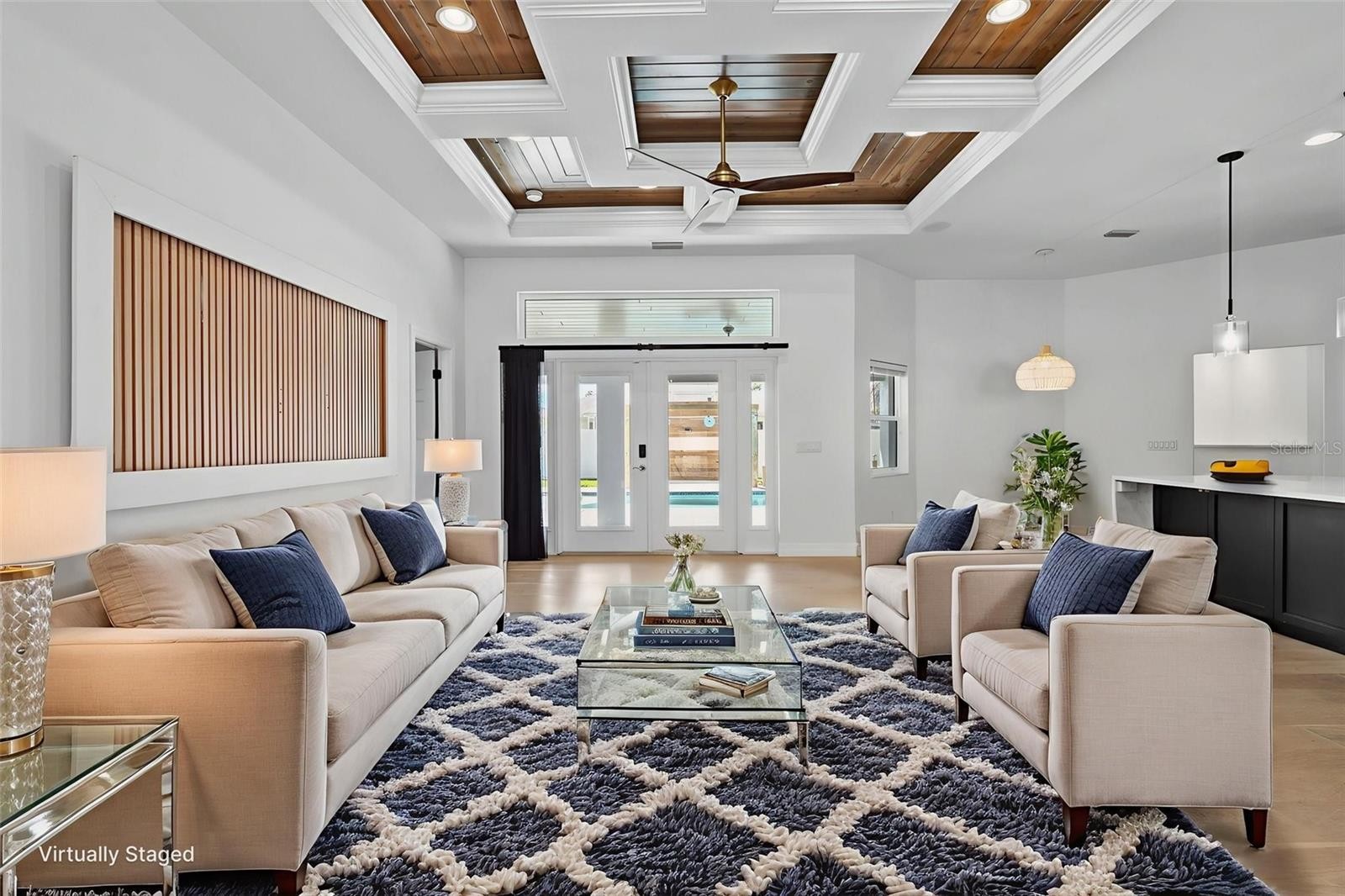 Step into luxury with this custom home built in 2018 by Walker Homes, offering 2,286 square feet of beautifully finished living space on an oversized half-acre lot in the heart of North Port. Featuring three bedrooms and two and a half baths, this thoughtfully designed residence boasts a split-bedroom layout with a spacious main-level primary suite, offering the perfect combination of comfort and privacy. The gourmet kitchen is a chef’s dream, highlighted by a striking waterfall island, custom cabinetry, stainless steel appliances, and high-end finishes throughout. The open-concept living space features coffered ceilings and is bathed in natural light, with durable luxury vinyl plank flooring throughout the main living areas and luxury tile in the bathrooms for a modern, cohesive feel. A bonus room off the main living area provides additional flexible space—ideal for a home office, playroom, den, or guest area—and includes extra built-in storage with endless potential to fit your lifestyle needs. Step outside into your private tropical retreat. Take a dip in the in-ground pool, grill under the expansive covered lanai with built-in summer kitchen or unwind beneath the brand-new patio pergola. A charming tiki hut adds a touch of island living—perfect for entertaining or simply relaxing in the shade. The lush landscaping is supported by an irrigation well system and enhanced by solar lighting, creating a tranquil, resort-style setting. The home also includes a finished RV port/garage wing with its own private entrance, workshop, office space, and half bath—perfect for guests, hobbies, or extended workspace. With plenty of parking for RVs, boats, or extra vehicles and no HOA or CDD fees, this home offers flexibility and freedom rarely found in a custom property.