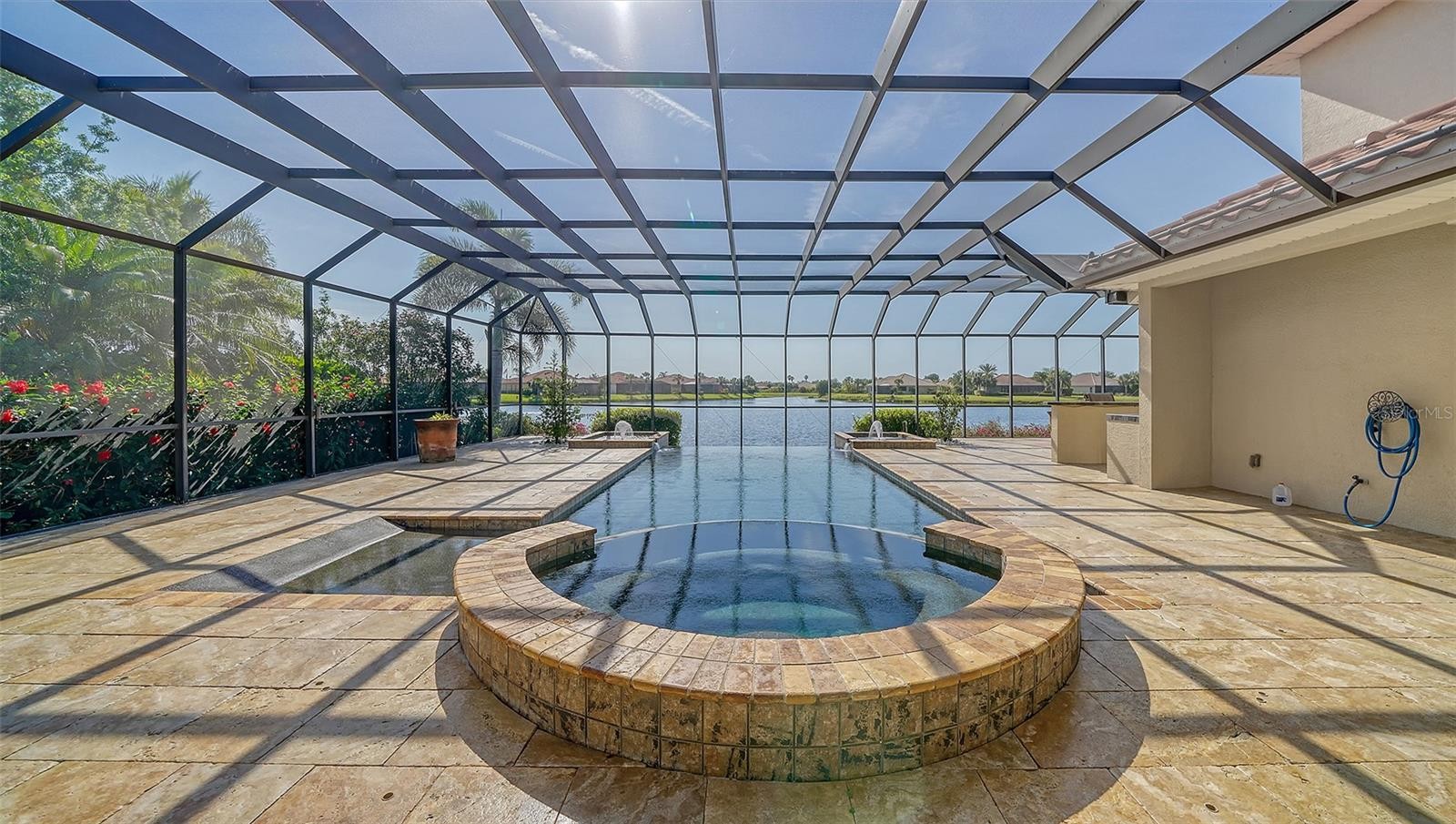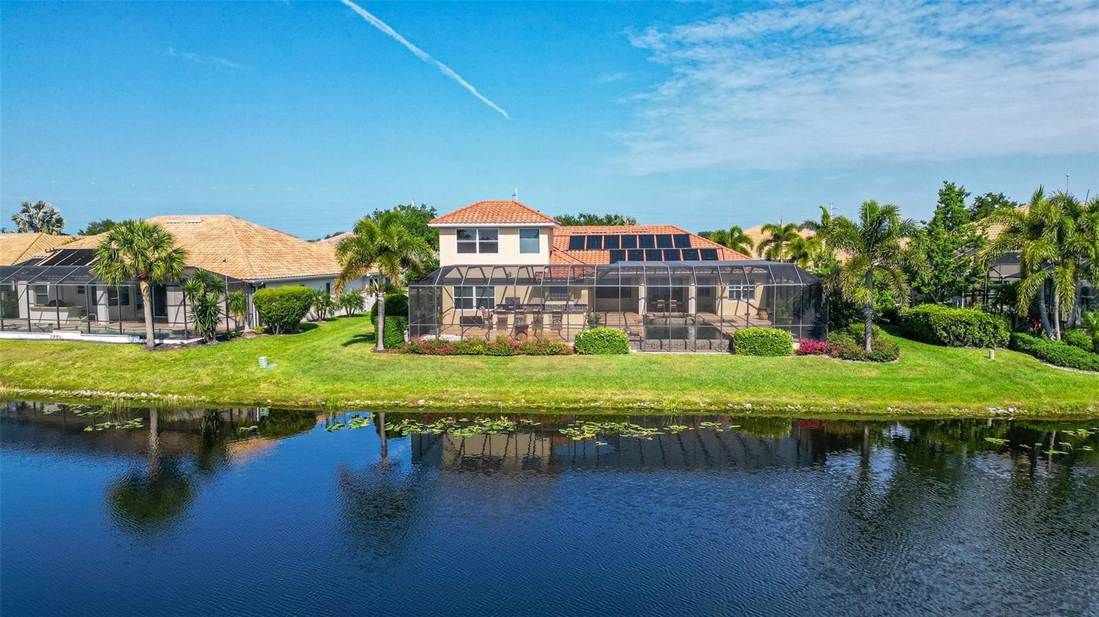 This is a WOW! You will ooh and ahh when you enter this elegant home. Prime lakefront lot with expansive views. The infinity saltwater pool literally flows into the lake and is heated with solar, gas & electric. The chef’s kitchen features granite counters, island, breakfast bar, eat-in kitchen area with aquarium window, 6 burner gas stove top, Advantium oven/microwave, convection oven and warming tray, separate ice maker, 42” side-by-side refrigerator, two Bosch dishwashers. All bedroom closets have custom wood shelving. Master bedroom offers an additional sitting/exercise area. Master bath boasts a Jacuzzi tub, dual shower heads, double sinks & tile accents. The Den/library has gorgeous wood built in book cases. You will enjoy all the columns, crown molding, high end ceiling fans, tray ceilings, central vac, beautiful wood flooring, plantation shutters, hurricane shutters or impact windows throughout plus a whole house Generac gas generator with warranty. Barn door separates 2 of the bedrooms and bath. Upgraded A/C unit with air scrubber, electronic Air filtration system, & UV Bulb. Omnilogic Pool control system plus an autofill system. Whole house power cleaner and surge protector. 3 car garage with epoxy coating will hold all your toys & overhead storage. 24/7 security guard at gate. The golf club membership is separate and not required. Including a heated pool, a lap pool, tennis courts, fitness courts, restaurant and boardwalk down to the river. CDD fee is included in the tax amount. Minutes to beaches shopping, banking, restaurants & more. Truly a must see.