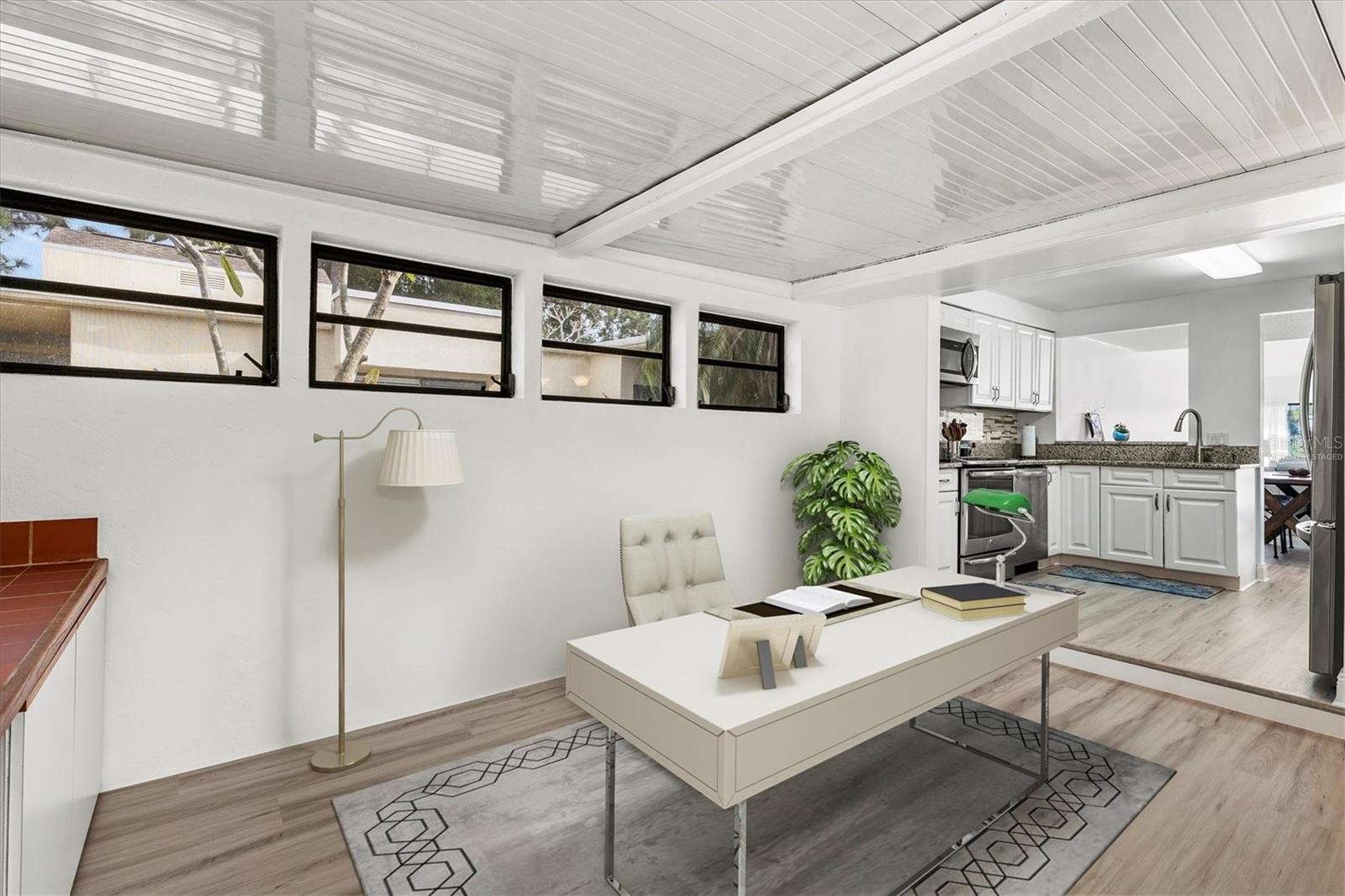 One or more photo(s) has been virtually staged. Captivating Views on Crispin Court. Located within the sought-after community of The Meadows in Sarasota, this beautifully remodeled THREE-BEDROOM, two-bath villa offers 1,608 square feet of thoughtfully designed living space, along with a versatile bonus area ideal for a home office, study, or flexible living needs—a feature not typically found in Meadowlake units. The A/C and hot water tank were REPLACED in 2022. This residence enjoys UNOBSTRUCTED WATER-VIEWS from the downstairs primary bedroom, living room, and an upstairs bedroom, all complemented by a picturesque golf course fairway in the distance, creating a serene and private setting. The two-story floor plan features a first-floor primary suite with an UPDATED en-suite bathroom and ample closet space. The spacious living and dining areas showcase VAULTED CEILINGS, enhancing openness, natural light, and the home’s connection to the outdoors. Upstairs, two additional bedrooms provide comfort and privacy, ideal for guests or added flex space. The kitchen is well-appointed with granite countertops, abundant cabinetry, generous storage, a newer refrigerator, and a pantry, offering both functionality and timeless appeal. NEWLY INSTALLED luxury vinyl flooring runs throughout the home, while the entire interior has been freshly painted, providing a clean, move-in-ready presentation. Just beyond the living space, a screened-in lanai offers an inviting open-air seating area, perfect for morning coffee, evening relaxation, or enjoying peaceful water views—an ideal extension of the indoor-outdoor lifestyle. The surrounding landscape, both around the home and throughout The Meadows, feels more like a park with homes rather than a dense subdivision. Residents enjoy an active, amenity-rich lifestyle spanning over 1,650 acres of mature oak canopies, scenic lakes and waterways, golf courses, tennis courts, new pickleball courts, a fitness center, 14 miles of walking and bike trails, and a junior Olympic-size community pool. The Meadowlake neighborhood also offers TWO PRIVATE POOLS. Conveniently located near shopping, dining, cafés, University Towne Center (UTC), Mote Marine Aquarium, cultural attractions, and approximately 13 miles to Sarasota’s renowned beaches, this villa offers comfort, lifestyle, and an exceptional location. Schedule your private showing today to experience the setting, views, and quality this Meadowlake villa offers—an exceptional opportunity within one of Sarasota’s most established communities.