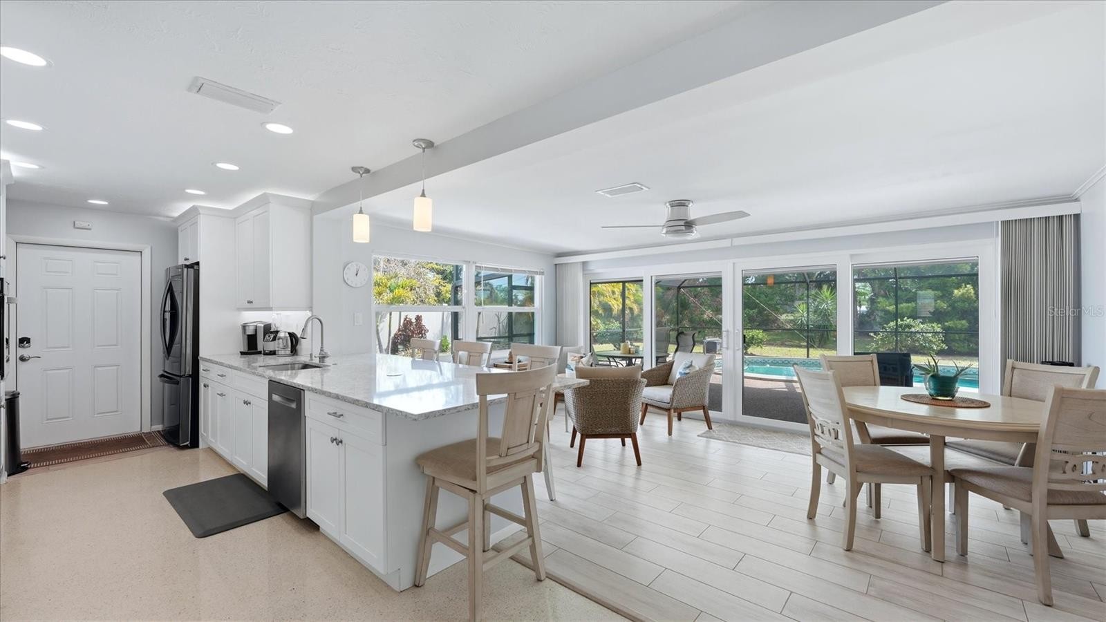 A newly imagined Gulf Gate Estates gem RENOVATED, *FURNISHED and MOVE-IN READY! Updated to modern specifications: 2 large Master bedrooms featuring 2 Walk-in Closets and 2 Full Private En-suites. This home offers a Separate Living room and a New stunning Kitchen with large Quartz Breakfast Bar, overlooking the Dining Area & Open Family Room that overlooks your Private Tropical Oasis. ~ The Oversized 1400 sqft screened pool cage deck has an insulated covered lanai area and overlooks the beautiful PRIVATE tropically landscaped backyard, truly an OASIS. ~ Many improvements including: ROOF 2025, 3 Ton HVAC & Attic Ducting 2023 (10yr transferable warranty), Both Baths Updated 2020-23, Kitchen Gutted & Rebuilt w Oversized Quartz Countertop, backsplash, plumbing, wiring, and new wood soft close cabinets 2022: ~ Stainless Appliances: Whirlpool Cooktop 2022, Whirlpool Microwave 2020, Whirlpool Wall Oven 2020, Bosch Dishwasher 2019, LG French door Fridge 2019. ~ Steel Beam installed to Open Kitchen to Family room 2022 ~ PGT IMPACT SLIDERS 2022, IMPACT WINDOWS & DOORS 2018, IMPACT Insulated GARAGE DOOR 2018, Whirlpool Dryer 2021, Hot Water Tank 2021, and Samsung Washer 2018 ~ Terrazzo Floors Redone 2018-2020. Also Blinds 2018-2020, Interior & Exterior Light Fixtures, Electrical Switches & Ceiling Fans replaced 2019-2022, Interior Painted 2018, Porcelain Plank Tile Floor 2018 ~ Exterior Freshly Painted 2020, Gutters, Fascia & Soffits 2020-2021 ~ New 200 Amp Electrical Panel 2020 ~ POOL: Pool Pump & Pool Filter 2020, Pebble Tec Pool Resurfaced 2018, Pool Deck resealed 2018, 2020, 2023. New Pool Cage 2021. ~ Replacement of pipe off water meter with PVC & Replace Pipe from House to Street (prior to 2017) Re-plumbed Overhead w/CPVC (prior to 2017) ~ Fencing 2022, Landscaping & Irrigation 2018-2025 ~ There is room to expand garage and Much More. Not in a Flood Zone ~ LOCATION: Desirable Gulf Gate Estates has sidewalks, is well lit and has enforced deed restrictions to keep the properties nice. The low HOA $75/year is voluntary. This Modernized home is minutes away from World Renowned Siesta Beach and Legacy Trail, A+ Schools, Gulf Gate Library, the Gulf Gate Shops & Fine Restaurants. UTC Mall and Cultural Downtown are 20 minutes away. Just over 3 miles to Costco, an upcoming Whole Foods & Trader Joes. Enjoy the Florida Lifestyle in this wonderful South Sarasota Community that is quiet but minutes to everything. Make this updated home yours today. By appointment only.