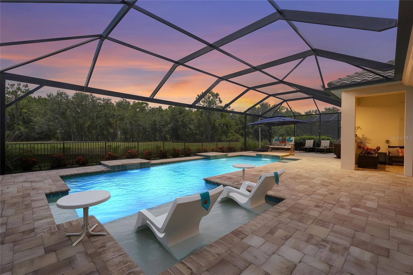 Welcome to 2525 Paradise Plum Dr., an immaculate Kiawah model located in the highly sought-after Windward at Lakewood Ranch. Built in 2022, this exceptional 4 bedroom + office, 3 bathroom home offers 2,927 square feet of interior living space and over 6,028 total square feet, thoughtfully designed for luxury, comfort, and functionality. Situated on a premier lakefront lot with peaceful western-facing views, this home showcases a seamless open concept layout that blends the great room, dining area, and gourmet kitchen. Perfect for entertaining, the kitchen features an expansive island, walk-in pantry, dedicated coffee bar, ceiling-height cabinetry and GE Café stainless steel appliances including a double oven and a five-burner gas cooktop. The oversized island includes front-facing cabinets for additional storage. A walk-in pantry and soft-close cabinetry are included for everyday convenience. The laundry room is equipped with hookups for either gas or electric, and the home also includes extra 240v outlets in the garage to support a variety of utility or workshop needs. The primary suite offers a peaceful retreat, complete with coffered ceilings, a generous walk-in closet, and a spa-like bath featuring dual vanities, an oversized walk-in shower, and a freestanding soaking tub. Throughout the home, you'll find top-grade laminate flooring, sealed grout in all bathrooms, and dimmable lights with remote-controlled ceiling fans. Step outside to your own private oasis. The heated saltwater pool measures 18x33 feet and features a sun shelf, bubbler, three waterfalls, and colored LED lighting, both in the pool and in the clearview pool cage. The outdoor living area also includes ceiling outlets, outdoor ceiling fans, and a dedicated pool bath. The entire space is pre-wired for a gas or electric secondary pump or heater, and a roughed-in outdoor kitchen with gas and electric plumbing is ready for your custom design. The home also features sealed front and rear pavers, a full irrigation system, french drains at each corner of the yard, and three separate hose bibs for outdoor water access. Storm protection is maximized with storm smart automated and crank hurricane shutters, 360-degree hurricane-rated sliders and impact windows. Additional upgrades include a three-zone HVAC system and a whole-home saltwater purification system. The Vivint security system includes cameras on both sides of the home, the garage, and doorbell entry. The garage includes a 3-foot extension, attic storage with ladder access, and plenty of space for vehicles and additional storage. Enjoy a maintenance-free lifestyle in this gated community, where resort-style amenities include a large swimming pool, children’s pool, spa, eight pickleball courts, two tennis courts, two dog parks, a clubhouse, playground, and state-of-the-art fitness center. A full-time activities director also coordinates community events, creating a vibrant and social atmosphere. Windward is ideally located near Waterside Place, downtown Sarasota, and some of Florida’s most beautiful beaches. Don’t miss your opportunity to make 2525 Paradise Plum Dr. your dream home - schedule your private tour today!