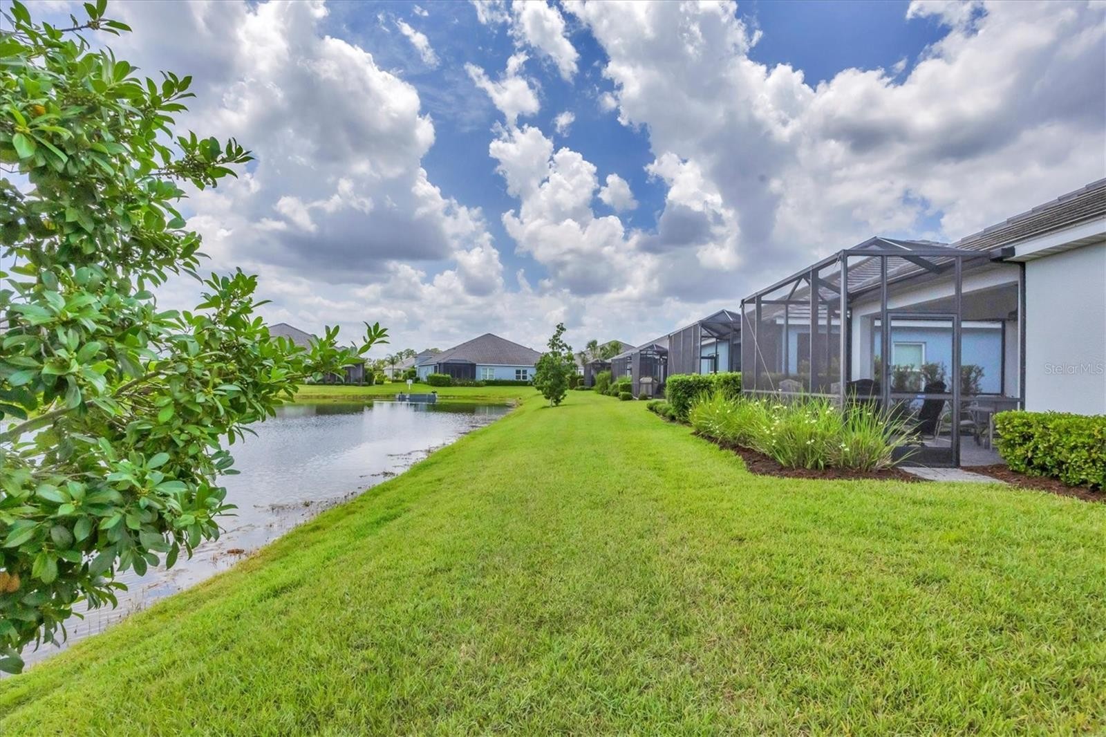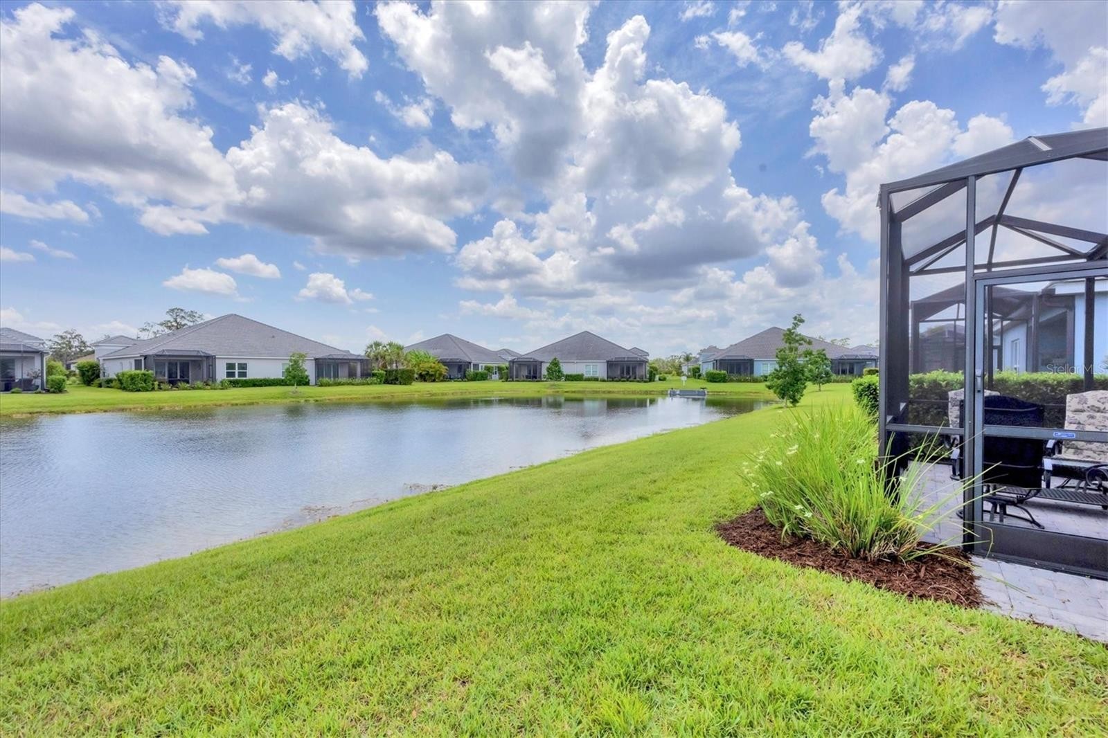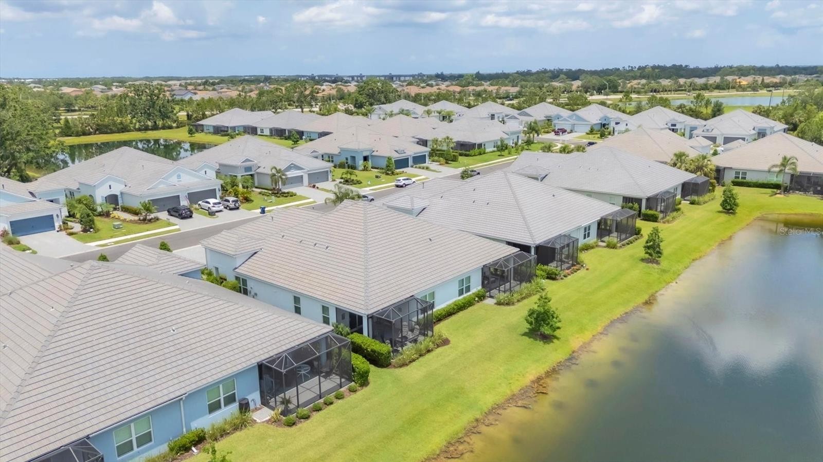 Feast our eyes on this move-in ready ''Tidewinds'' floorplan with it's beautiful lake view! This stunning villa is built strong and safe with its cinder block construction, concrete tile roof, HURRICANE IMPACT WINDOWS throughout AND is located in the desirable "X'' floodzone. Your new villa boasts 2 bedrooms, 2 full baths, a dedicated den, great room, dining room, kitchen with breakfast bar, indoor laundry room with TWO storage closets and covered extended screened in lanai! Throughout the home you will find 5 1/4" deco baseboards, luxury vinyl plank flooring, multiple trey ceilings and 16-seer rated TRANE HVAC unit AND brand NEW exterior landscaping! The kitchen boasts a nice sized pantry, LED undermount lighting to complement the high level quartz countertops, upgraded herringbone laid porcelain back-splash, 5-burner natural gas range, stainless steel appliances, Island with breakfast bar and LED recessed lighting. The master bedroom includes TWO oversized walk-in closets with custom built-in cabinetry, separate dual vanities and a walk in shower with upgraded tile going up to the ceiling. The great room with its expansive tray ceiling showcases a spacious environment with more than enough room to entertain guests. Open the three paneled HURRICANE IMPACT sliders and you will be captivated by the rear views where you will see some of the most spectacular sunsets over the water. Ditch your propane tank for this extended outdoor lanai comes with a builder grade gas hook up for your favorite grill OR a new kitchenette of your own. Indigo is an active community that features a full time on-site manager as well as a full time activities director that manages an extensive calendar of activities for all ages. A-Rated Gullett Elementary AND Mona Jain Middle School are right outside our gates too! You can also expect sidewalks on both sides of the street, ''Oasis'' pool/spa, resort style heated community pool/spa at the main clubhouse where you will find 5 cabanas with an abundance of seating, 4 pickleball courts, 2 bocce ball courts, 24-hour exercise gym, meeting room/banquet room and playground. Indigo is not only a community that takes care of all ground maintenance to include mowing, fertilizing, irrigation, shrubs and mulch but is right around the corner to a plethora of dining, banking, entertainment, public transportation and MORE!