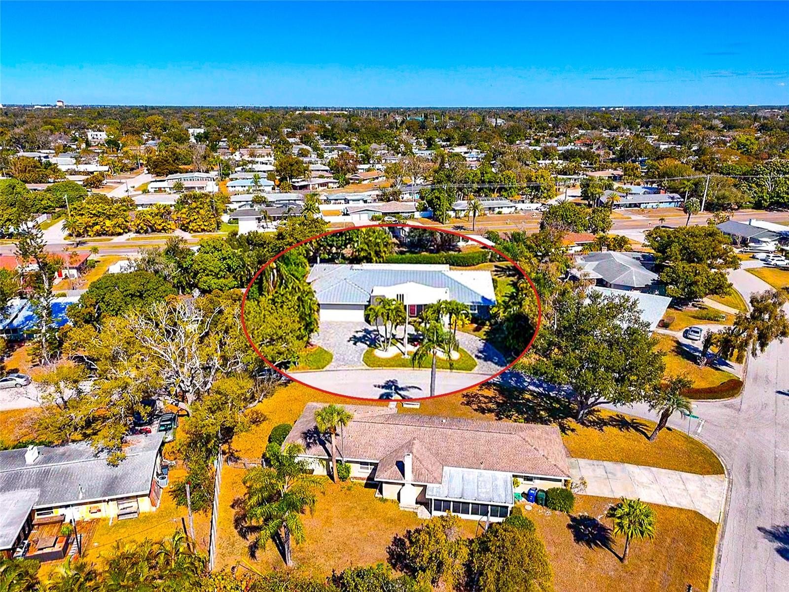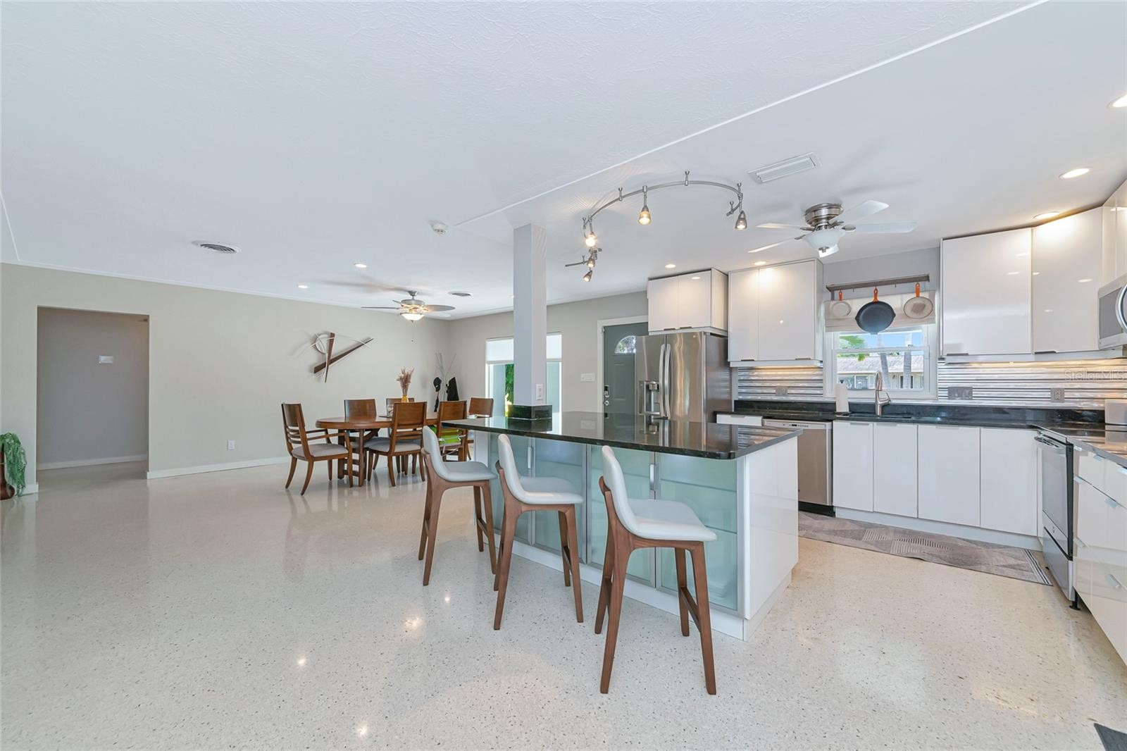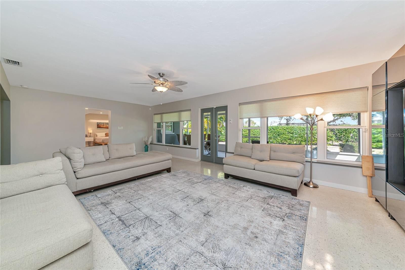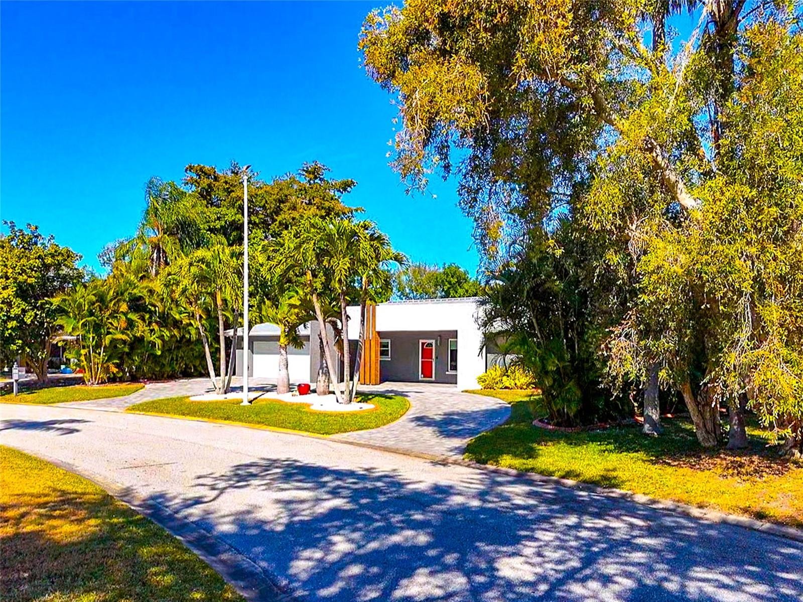 Enjoy life to the fullest in this 3 bedroom, 3 bath mid-century modern style ranch home, nestled on a near 1/3 acre lot in the sought-after South Gate neighborhood, offering over 2,400 square feet of architecturally updated and meticulously maintained living space. From the moment you arrive, this private sanctuary impresses with iconic palm trees, a custom circular paver driveway, professionally lit landscaping, and a vivid one-of-a-kind patio with a colorful front entry. Inside, the light and bright open-concept floorplan showcases flawless terrazzo flooring and a striking modern contrasted kitchen with stainless steel appliances and a large island with bar-top seating. The kitchen and living areas flow seamlessly into the family and dining room, providing ample gathering space and an entertainment center ready for modern electronics. French doors lead to an almost 40-foot screened lanai overlooking a professionally manicured, fenced, and irrigated backyard accented with coping. The primary bedroom features a private exterior entrance, space for a desk or seating area, and an en-suite bath with a walk-in closet with built-in shelving and safe, a wall-to-wall glass shower with multiple massage jets and bench seating, and a separate water closet. Two additional contemporary bedrooms and bathrooms are located on the opposite side of the home. The remodeled two-car garage is climate controlled and includes a full laundry room with utility sink. Major upgrades and systems include a standing seam metal roof, hurricane-rated impact windows and garage door, tankless water heater, whole-home generator, updated electrical system with new controls, and a plumbing system rerouted with exterior clean-outs for easy access. The home includes both a 100-gallon and 500-gallon propane tank, with the generator operating from the 500-gallon tank and the water heater capable of running from either tank, all serviced on a regular basis. Indoor comfort is enhanced by a professionally maintained HVAC system with in-duct air purification, including UV lighting and a whole-home purification system. Smart-home features allow remote control of the irrigation system, HVAC, alarm system, front door lock, and security cameras. The driveway has been recently resealed, and exterior security lighting surrounds the home. Optional membership to the South Gate Community Association offers social activities and pool access at the historic community center for a nominal fee. Ideally located just minutes to golf courses, boat clubs, Downtown Sarasota dining, shopping, nightlife, cultural events, and the world-famous beaches of Siesta Key.
