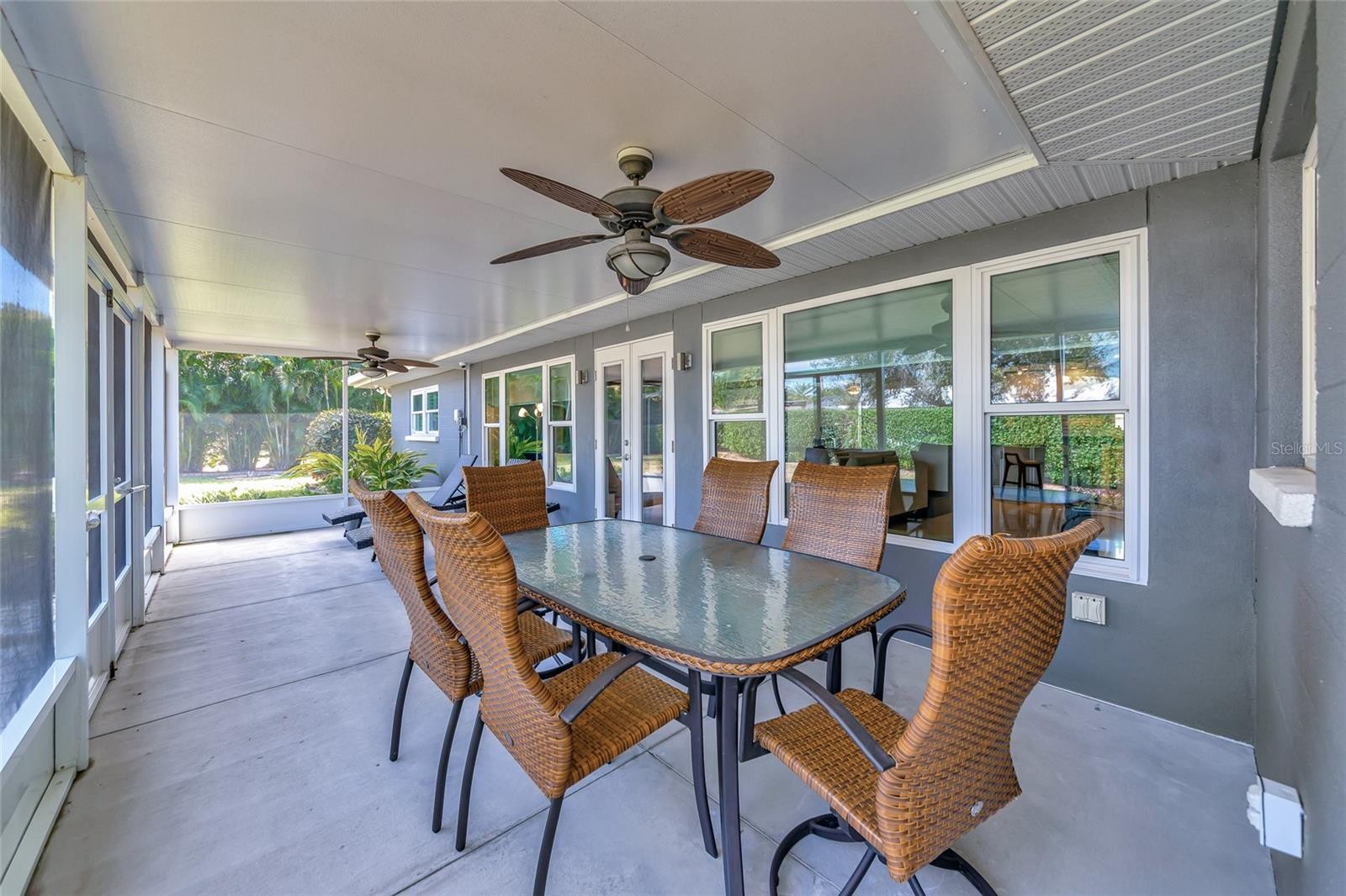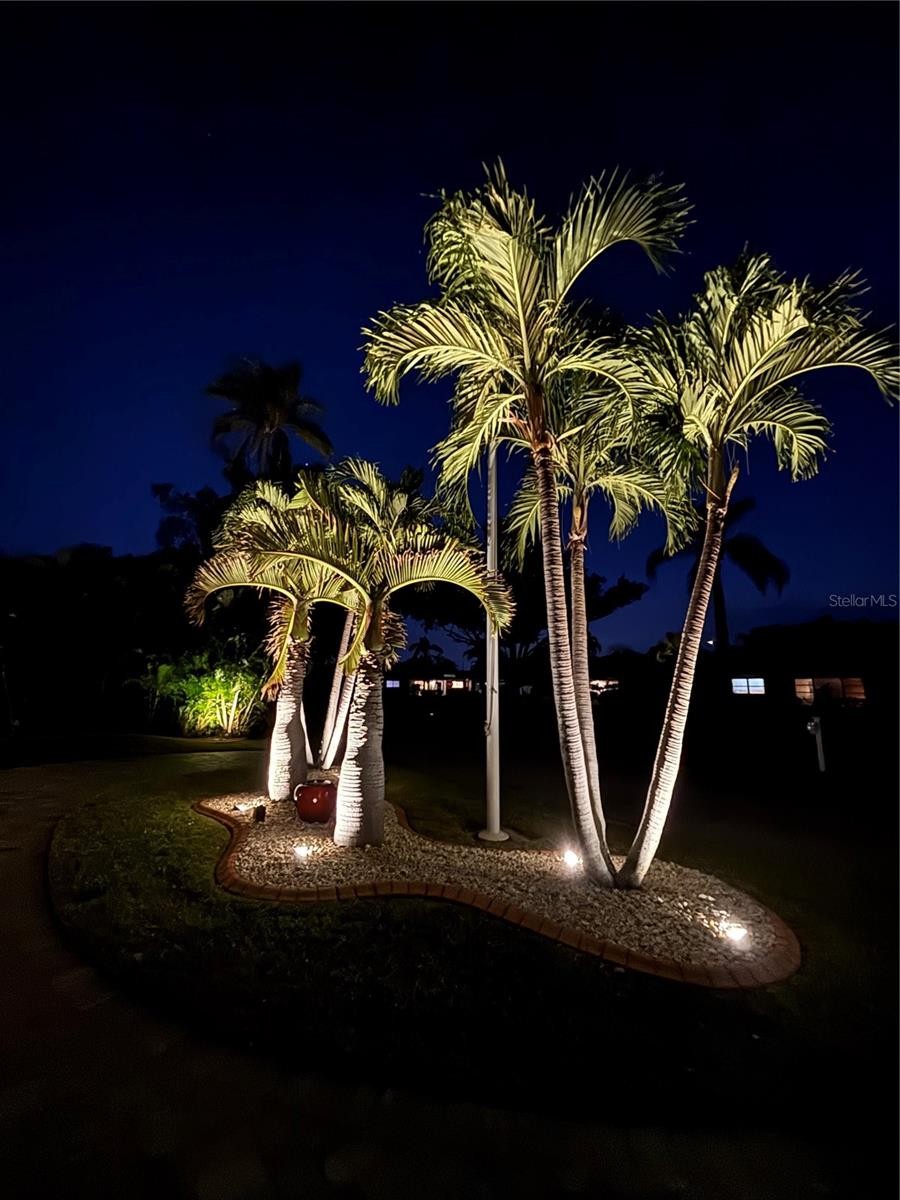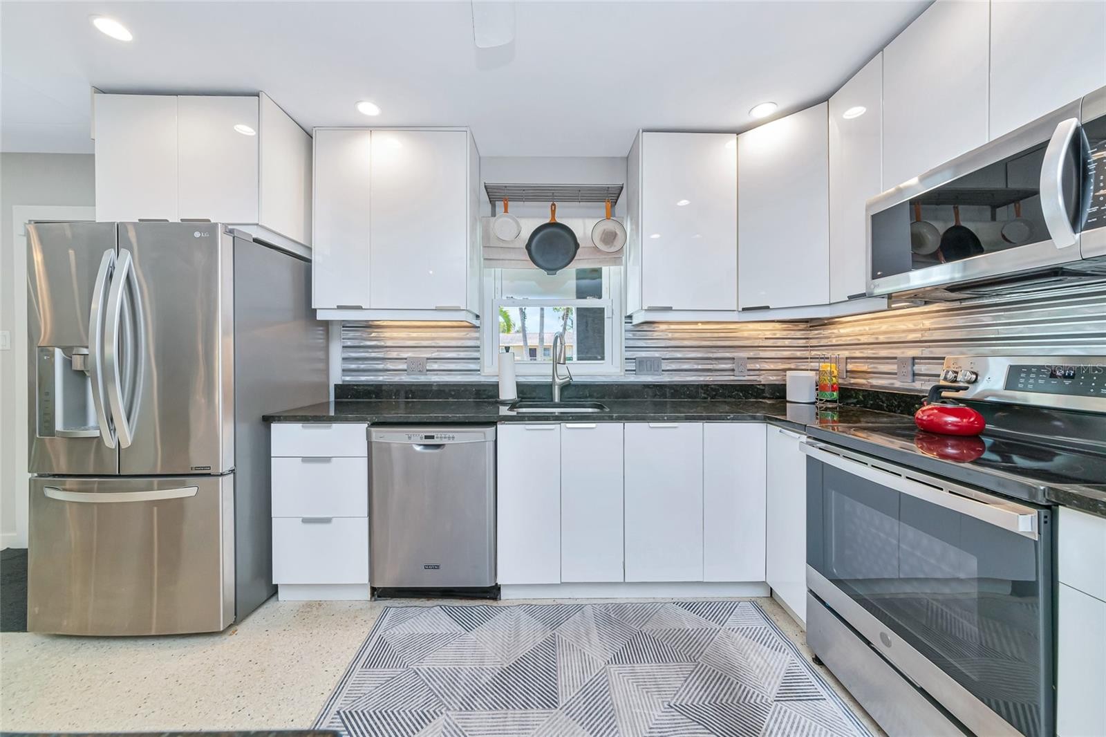 Enjoy life to the fullest in this 3 bedroom, 3 bath mid-century modern style ranch home, nestled on a near 1/3 acre lot in the sought-after South Gate neighborhood, offering over 2,400 square feet of architecturally updated and meticulously maintained living space. From the moment you arrive, this private sanctuary impresses with iconic palm trees, a custom circular paver driveway, professionally lit landscaping, and a vivid one-of-a-kind patio with a colorful front entry. Inside, the light and bright open-concept floorplan showcases flawless terrazzo flooring and a striking modern contrasted kitchen with stainless steel appliances and a large island with bar-top seating. The kitchen and living areas flow seamlessly into the family and dining room, providing ample gathering space and an entertainment center ready for modern electronics. French doors lead to an almost 40-foot screened lanai overlooking a professionally manicured, fenced, and irrigated backyard accented with coping. The primary bedroom features a private exterior entrance, space for a desk or seating area, and an en-suite bath with a walk-in closet with built-in shelving and safe, a wall-to-wall glass shower with multiple massage jets and bench seating, and a separate water closet. Two additional contemporary bedrooms and bathrooms are located on the opposite side of the home. The remodeled two-car garage is climate controlled and includes a full laundry room with utility sink. Major upgrades and systems include a standing seam metal roof, hurricane-rated impact windows and garage door, tankless water heater, whole-home generator, updated electrical system with new controls, and a plumbing system rerouted with exterior clean-outs for easy access. The home includes both a 100-gallon and 500-gallon propane tank, with the generator operating from the 500-gallon tank and the water heater capable of running from either tank, all serviced on a regular basis. Indoor comfort is enhanced by a professionally maintained HVAC system with in-duct air purification, including UV lighting and a whole-home purification system. Smart-home features allow remote control of the irrigation system, HVAC, alarm system, front door lock, and security cameras. The driveway has been recently resealed, and exterior security lighting surrounds the home. Optional membership to the South Gate Community Association offers social activities and pool access at the historic community center for a nominal fee. Ideally located just minutes to golf courses, boat clubs, Downtown Sarasota dining, shopping, nightlife, cultural events, and the world-famous beaches of Siesta Key.