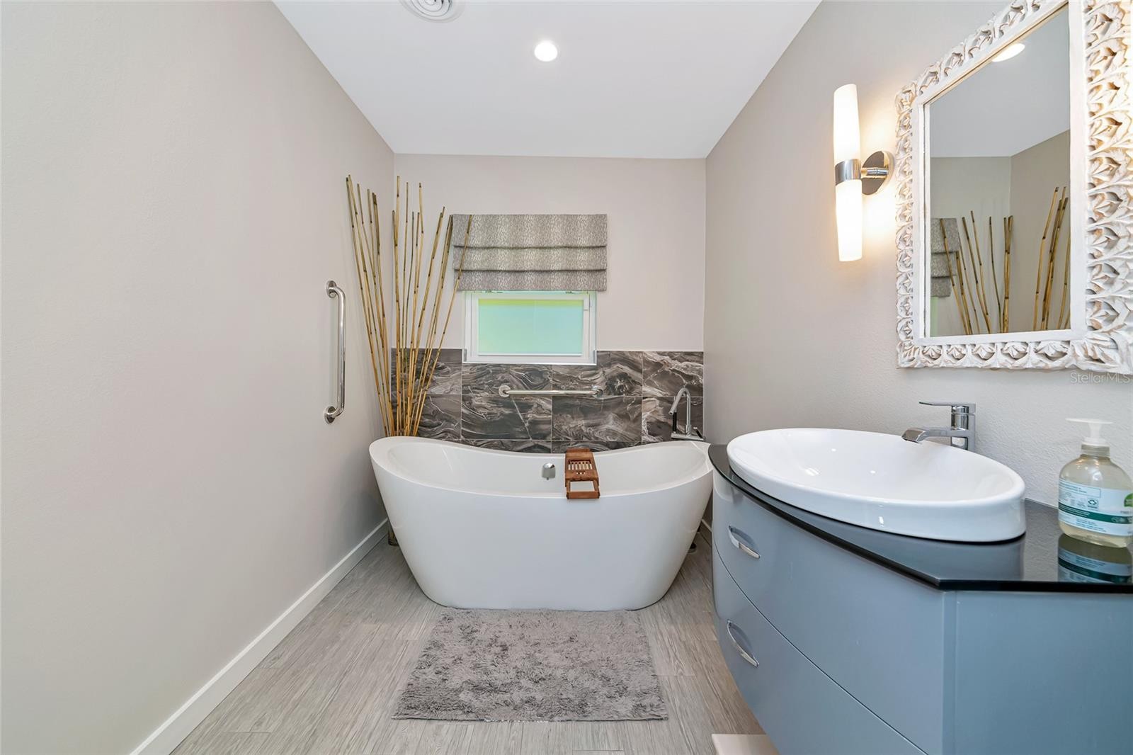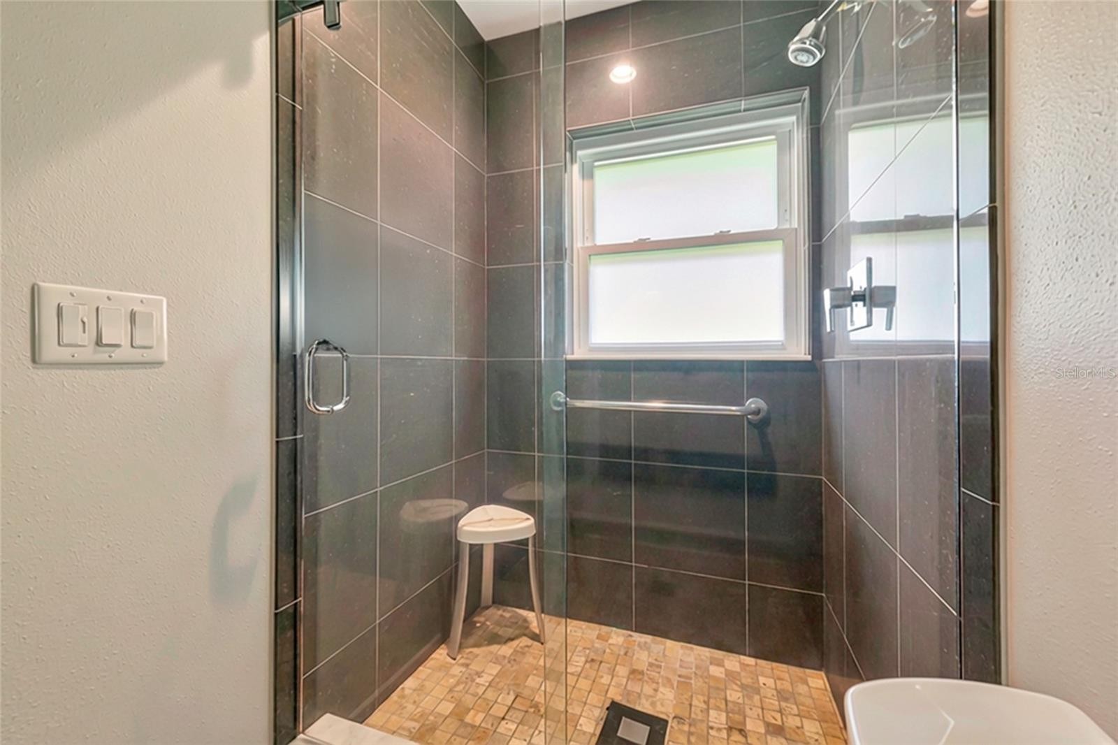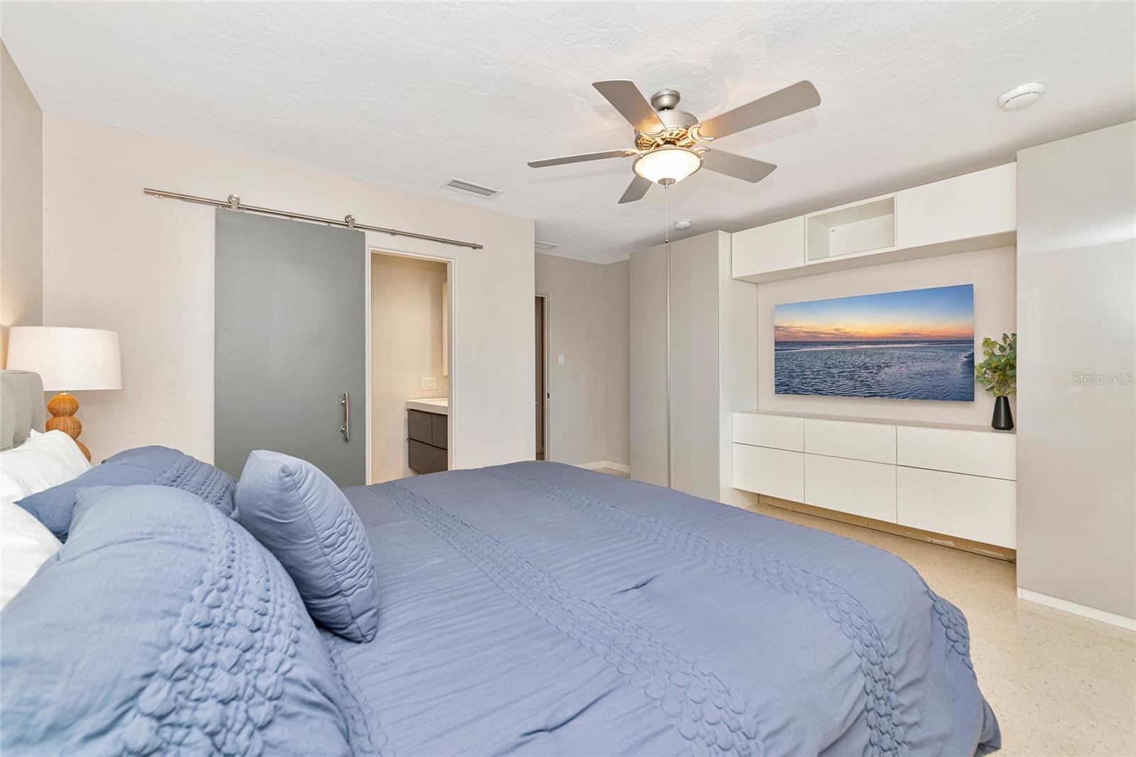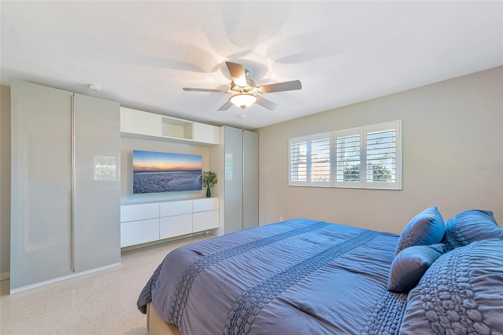 Enjoy life to the fullest in this 3 bedroom, 3 bath mid-century modern style ranch home, nestled on a near 1/3 acre lot in the sought-after South Gate neighborhood, offering over 2,400 square feet of architecturally updated and meticulously maintained living space. From the moment you arrive, this private sanctuary impresses with iconic palm trees, a custom circular paver driveway, professionally lit landscaping, and a vivid one-of-a-kind patio with a colorful front entry. Inside, the light and bright open-concept floorplan showcases flawless terrazzo flooring and a striking modern contrasted kitchen with stainless steel appliances and a large island with bar-top seating. The kitchen and living areas flow seamlessly into the family and dining room, providing ample gathering space and an entertainment center ready for modern electronics. French doors lead to an almost 40-foot screened lanai overlooking a professionally manicured, fenced, and irrigated backyard accented with coping. The primary bedroom features a private exterior entrance, space for a desk or seating area, and an en-suite bath with a walk-in closet with built-in shelving and safe, a wall-to-wall glass shower with multiple massage jets and bench seating, and a separate water closet. Two additional contemporary bedrooms and bathrooms are located on the opposite side of the home. The remodeled two-car garage is climate controlled and includes a full laundry room with utility sink. Major upgrades and systems include a standing seam metal roof, hurricane-rated impact windows and garage door, tankless water heater, whole-home generator, updated electrical system with new controls, and a plumbing system rerouted with exterior clean-outs for easy access. The home includes both a 100-gallon and 500-gallon propane tank, with the generator operating from the 500-gallon tank and the water heater capable of running from either tank, all serviced on a regular basis. Indoor comfort is enhanced by a professionally maintained HVAC system with in-duct air purification, including UV lighting and a whole-home purification system. Smart-home features allow remote control of the irrigation system, HVAC, alarm system, front door lock, and security cameras. The driveway has been recently resealed, and exterior security lighting surrounds the home. Optional membership to the South Gate Community Association offers social activities and pool access at the historic community center for a nominal fee. Ideally located just minutes to golf courses, boat clubs, Downtown Sarasota dining, shopping, nightlife, cultural events, and the world-famous beaches of Siesta Key.