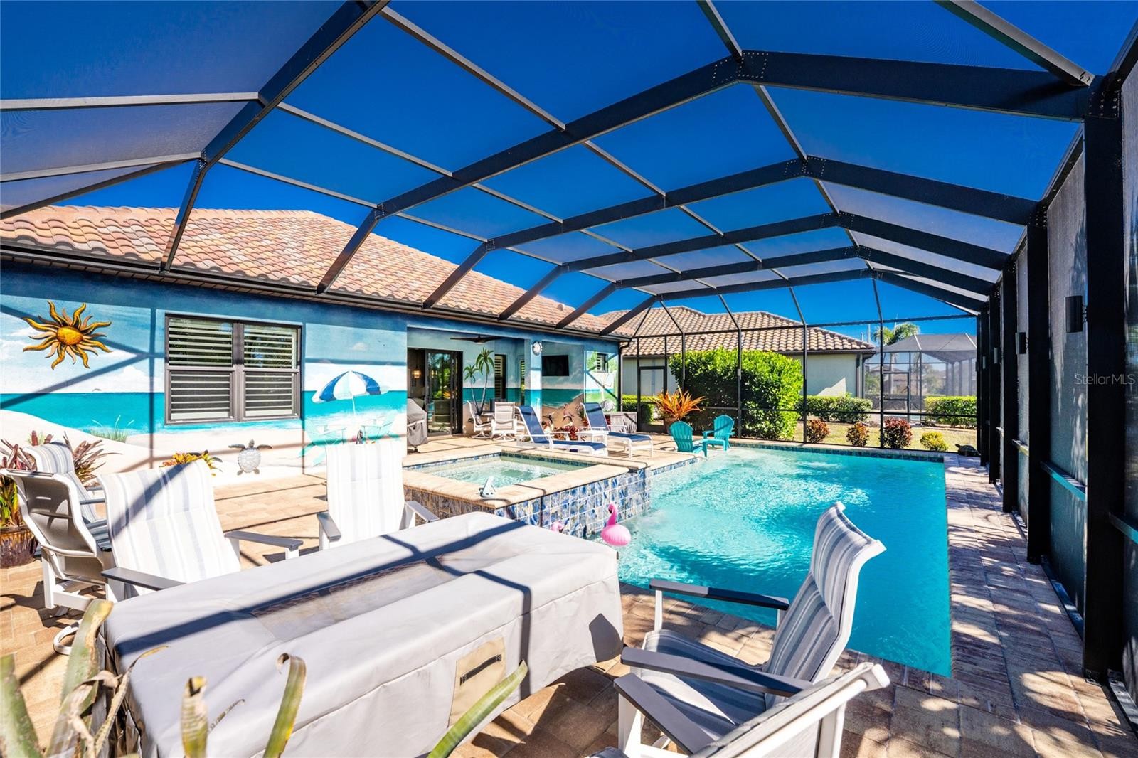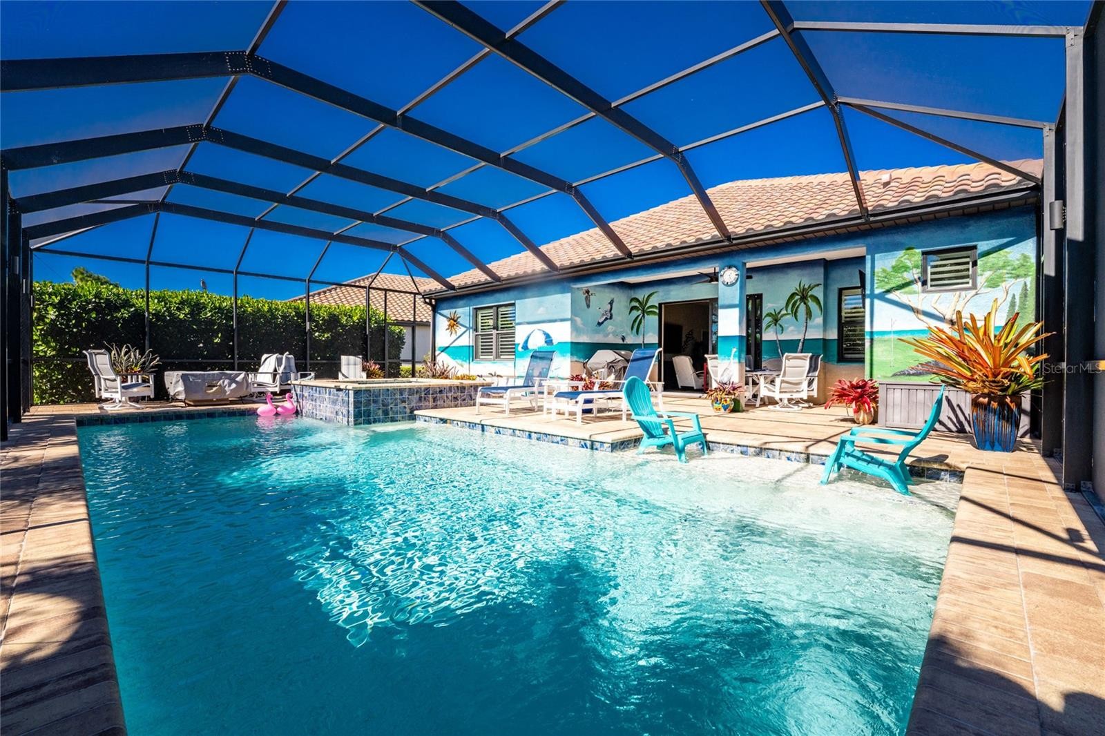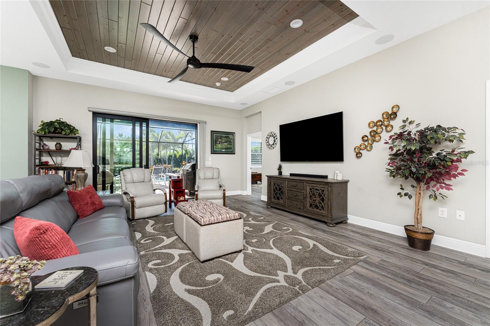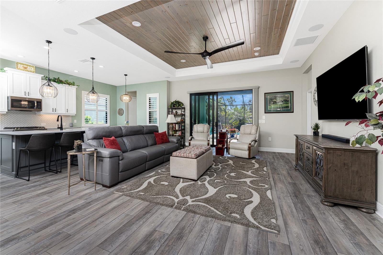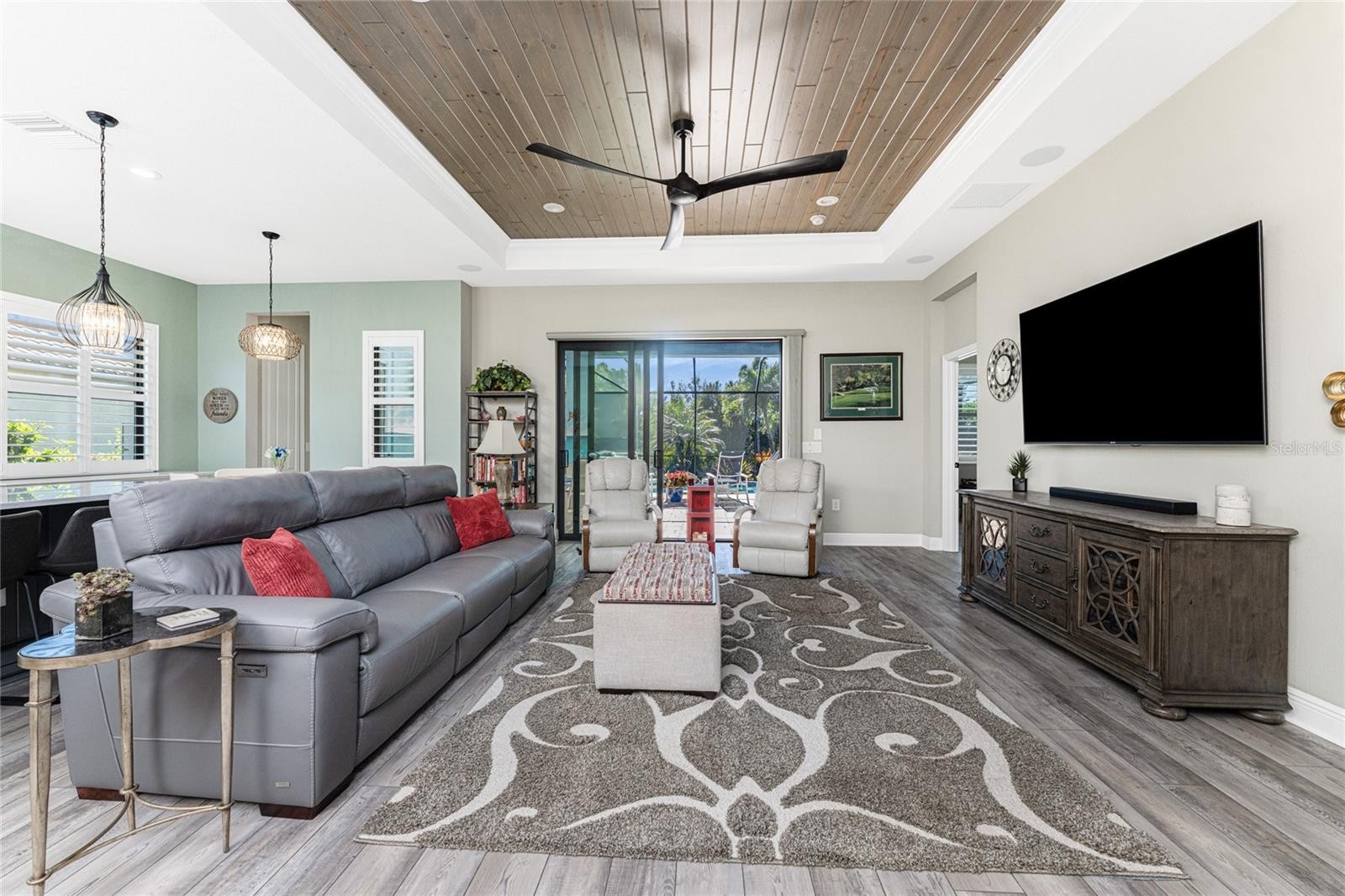 Nestled within the beautiful community of Boca Royale, this exceptional Eventide 4 floor plan offers an ideal blend of privacy, comfort, and refined coastal living. The home features two bedrooms, two full bathrooms, a convenient half pool bath, and a versatile office with French doors that can easily serve as a third bedroom. At the heart of the home, the gourmet kitchen is designed to impress, showcasing quartzite stone countertops, soft-close cabinetry and drawers, upgraded drawer brackets to accommodate up to 75 pounds, a natural gas range, stainless steel appliances, and an oversized island that opens seamlessly to the dining and great rooms—perfect for both everyday living and entertaining. Three-panel sliding glass doors lead to an expansive outdoor living area designed for year-round enjoyment. The lanai features decorative, sealed pavers, a covered patio with ceiling fans and lighting, a natural gas hookup for grilling, and a stunning heated saltwater pool complete with a sun shelf and spa, all framed by a meticulously manicured tropical landscape. Convenient access to the pool bath is provided through a full-light door from the covered patio. Inside, the great room is highlighted by a coffered ceiling with elegant wood shiplap inlay, while upgraded luxury vinyl plank flooring flows throughout, enhancing the home’s clean, modern aesthetic. The primary suite is a serene retreat, accented by a natural wood plank feature wall, crown molding, and two walk-in closets with custom organizers. The spa-like en suite bathroom features dual sinks, quartz countertops, a glass-enclosed walk-in tiled shower, and a private water closet. The bright and airy guest bedroom is thoughtfully separated from the primary suite by the enclosed office, offering comfort and privacy for visitors, and is complemented by a stylish second full bath with a custom sliding glass door, gray vanity, and white quartz countertop. Additional highlights include hurricane-impact windows and doors, a Storm Smart roll-down shutter at the front entry, custom privacy shades in the primary, guest, and den, plantation shutters, front door retractable screen, recessed lighting, an expanded walk-in pantry, and a professionally installed epoxy-finished garage floor with a dedicated breaker for a refrigerator and an EV charger. Residents of Boca Royale enjoy an array of resort-style amenities, including pickleball, tennis, golf, a fitness center, and a resort pool, along with dining and social gatherings at the clubhouse, the 19th Hole, and the Fairway Dining Room overlooking the practice green and driving range. Just minutes away, Manasota Key offers three public beaches with pristine Gulf waters, along with world-class fishing and boating. This is your opportunity to experience the very best of Florida’s Gulf Coast lifestyle.