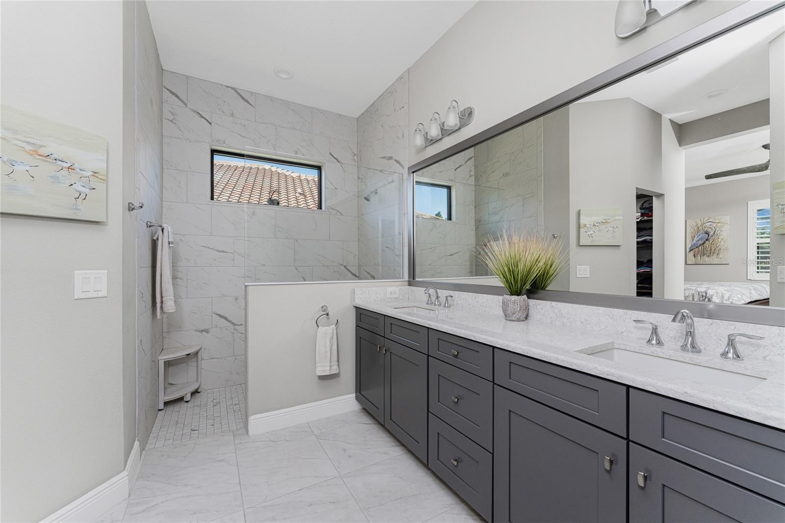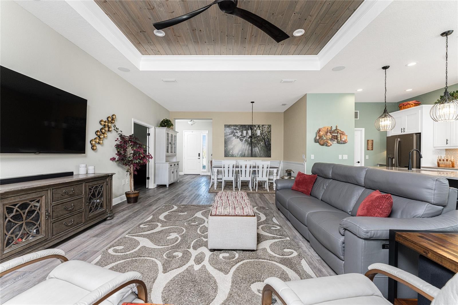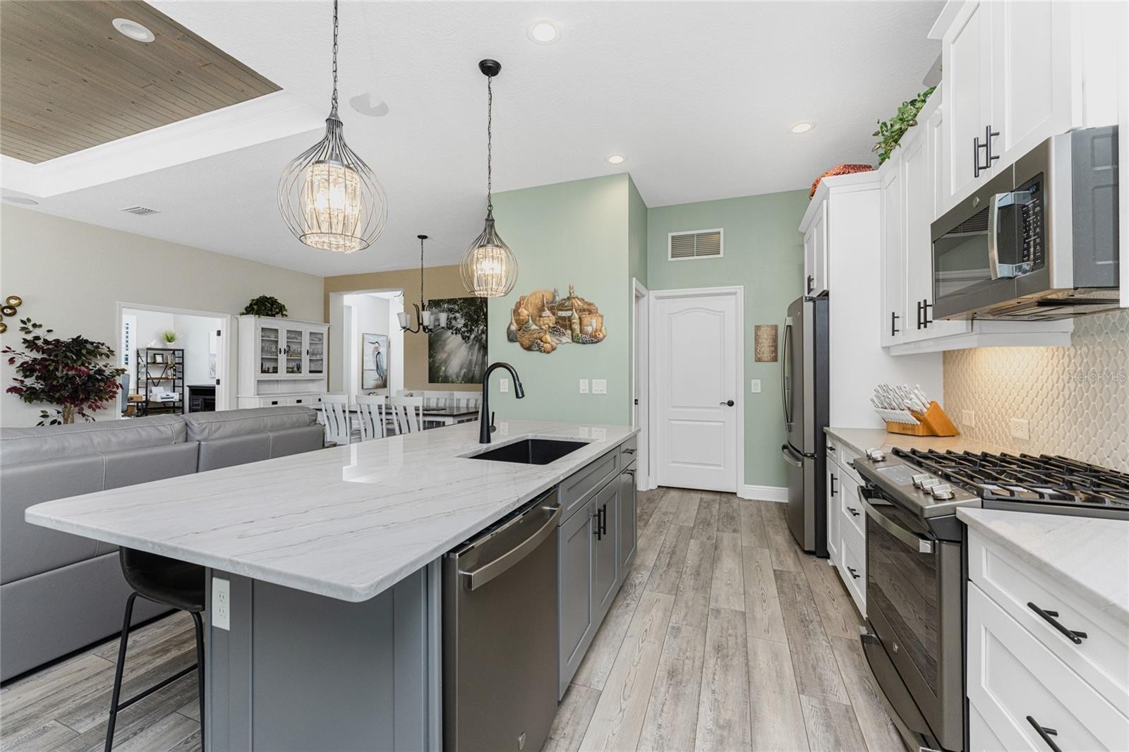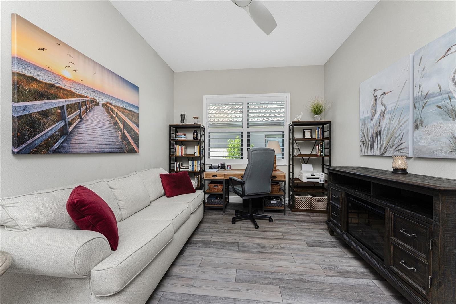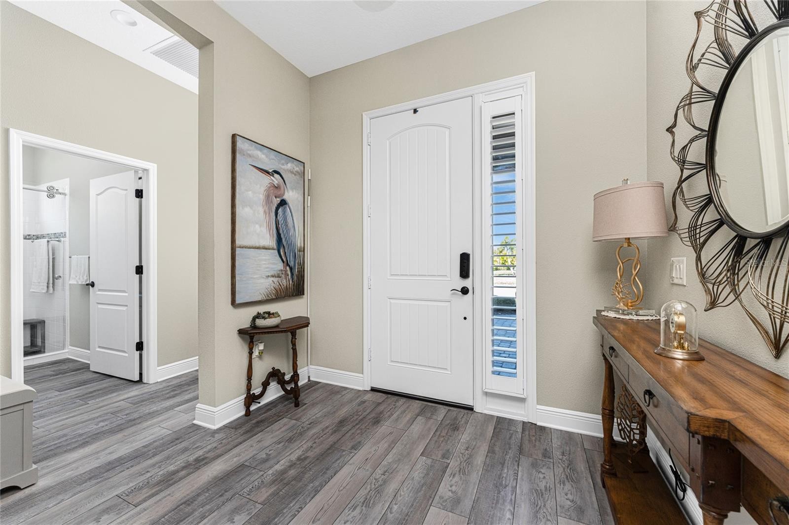 Nestled within the beautiful community of Boca Royale, this exceptional Eventide 4 floor plan offers an ideal blend of privacy, comfort, and refined coastal living. The home features two bedrooms, two full bathrooms, a convenient half pool bath, and a versatile office with French doors that can easily serve as a third bedroom. At the heart of the home, the gourmet kitchen is designed to impress, showcasing quartzite stone countertops, soft-close cabinetry and drawers, upgraded drawer brackets to accommodate up to 75 pounds, a natural gas range, stainless steel appliances, and an oversized island that opens seamlessly to the dining and great rooms—perfect for both everyday living and entertaining. Three-panel sliding glass doors lead to an expansive outdoor living area designed for year-round enjoyment. The lanai features decorative, sealed pavers, a covered patio with ceiling fans and lighting, a natural gas hookup for grilling, and a stunning heated saltwater pool complete with a sun shelf and spa, all framed by a meticulously manicured tropical landscape. Convenient access to the pool bath is provided through a full-light door from the covered patio. Inside, the great room is highlighted by a coffered ceiling with elegant wood shiplap inlay, while upgraded luxury vinyl plank flooring flows throughout, enhancing the home’s clean, modern aesthetic. The primary suite is a serene retreat, accented by a natural wood plank feature wall, crown molding, and two walk-in closets with custom organizers. The spa-like en suite bathroom features dual sinks, quartz countertops, a glass-enclosed walk-in tiled shower, and a private water closet. The bright and airy guest bedroom is thoughtfully separated from the primary suite by the enclosed office, offering comfort and privacy for visitors, and is complemented by a stylish second full bath with a custom sliding glass door, gray vanity, and white quartz countertop. Additional highlights include hurricane-impact windows and doors, a Storm Smart roll-down shutter at the front entry, custom privacy shades in the primary, guest, and den, plantation shutters, front door retractable screen, recessed lighting, an expanded walk-in pantry, and a professionally installed epoxy-finished garage floor with a dedicated breaker for a refrigerator and an EV charger. Residents of Boca Royale enjoy an array of resort-style amenities, including pickleball, tennis, golf, a fitness center, and a resort pool, along with dining and social gatherings at the clubhouse, the 19th Hole, and the Fairway Dining Room overlooking the practice green and driving range. Just minutes away, Manasota Key offers three public beaches with pristine Gulf waters, along with world-class fishing and boating. This is your opportunity to experience the very best of Florida’s Gulf Coast lifestyle.