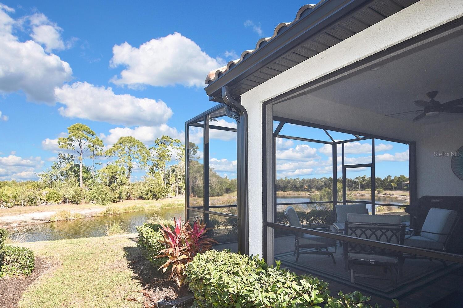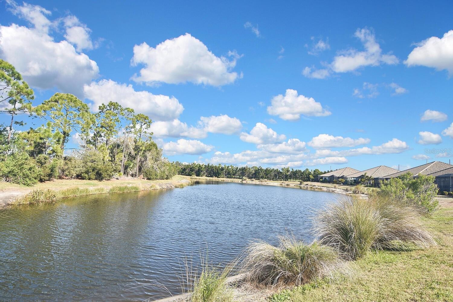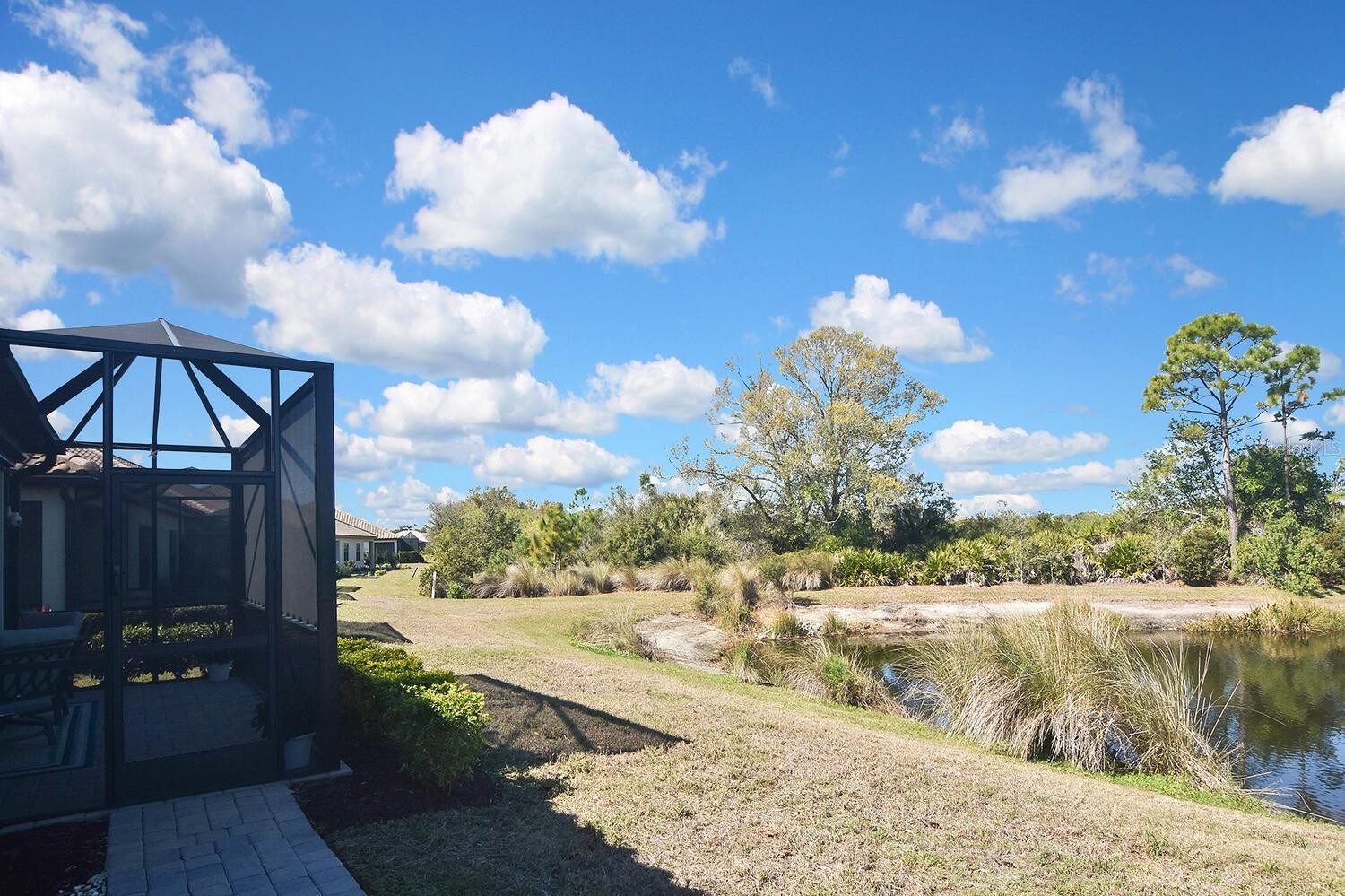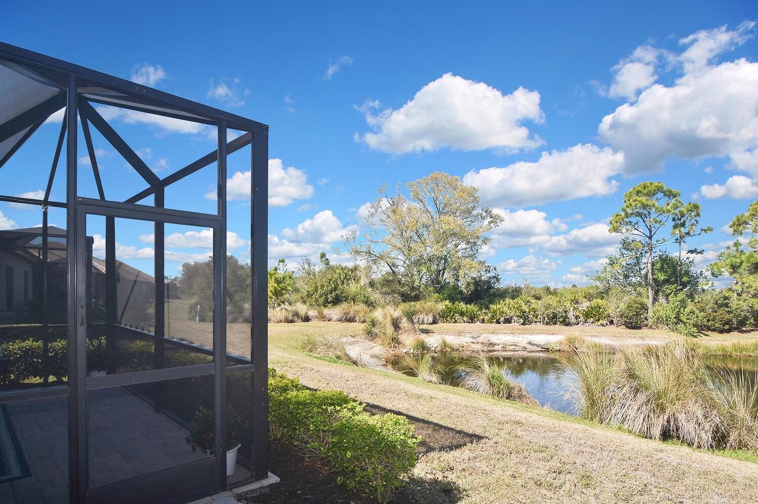 Welcome to this beautifully designed 3-bedroom + den, 2-bath villa with a 2-car garage, perfectly situated in a sought-after golf course community. The moment you enter, you?ll notice the expansive tile flooring that flows seamlessly throughout the main living areas, creating a bright and sophisticated atmosphere. The gourmet kitchen is a true showpiece, featuring: Soft-close cabinetry, Quartz countertops, Farmhouse sink, & Stainless-steel appliances The spacious primary suite offers comfort and privacy, while two additional bedrooms and a versatile den provide flexibility for guests, a home office, or hobby space. Step outside to your extended lanai, complete with storm-smart shades, where you can relax and enjoy tranquil views overlooking a quiet pond ? the perfect setting for relaxing. Additional highlights include: Laundry room with built-in cabinetry and utility sink. All impact windows and doors for peace of mind Located within a beautifully maintained golf course community, this villa combines luxury, comfort, and low-maintenance living in an exceptional setting.