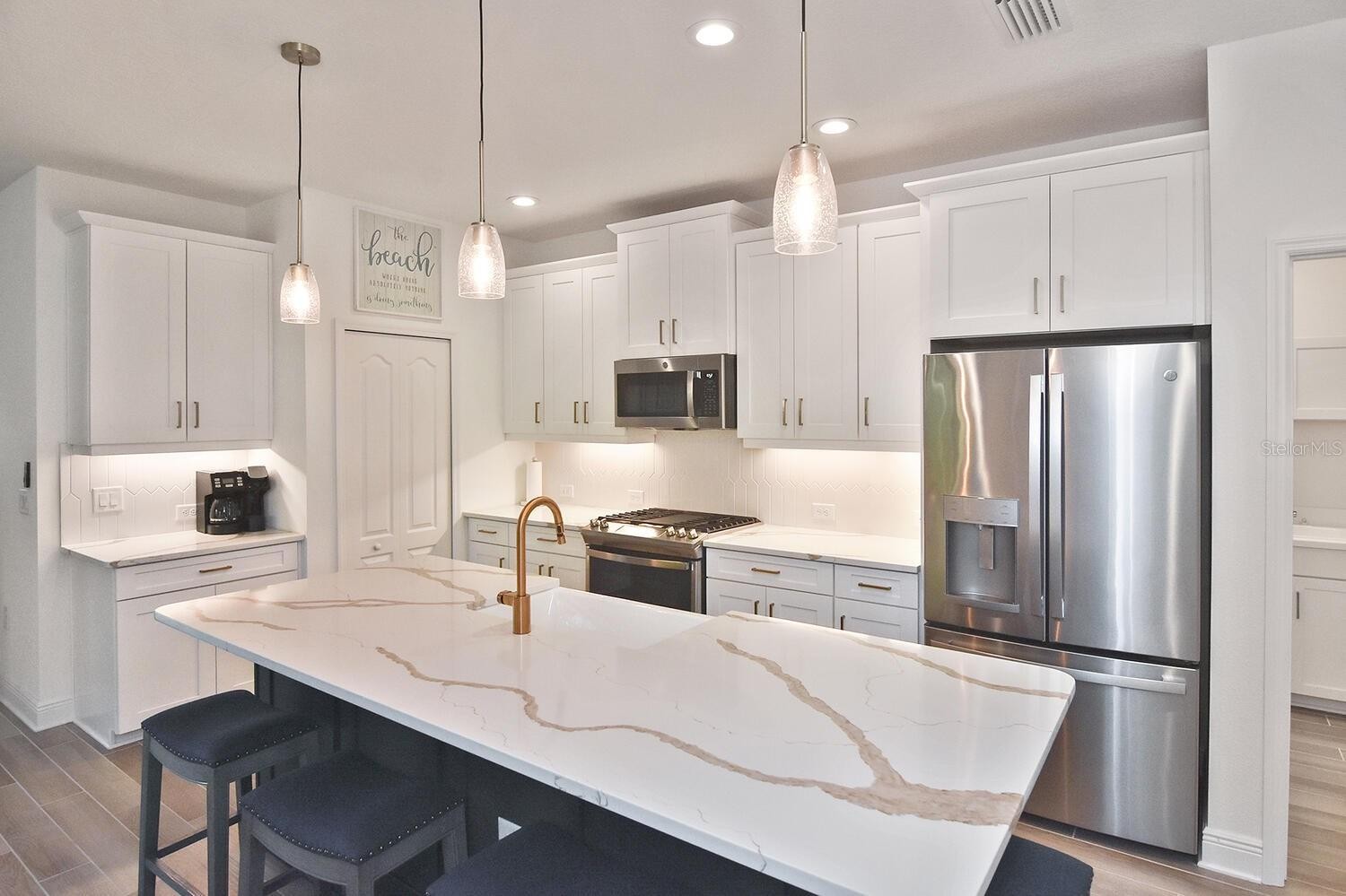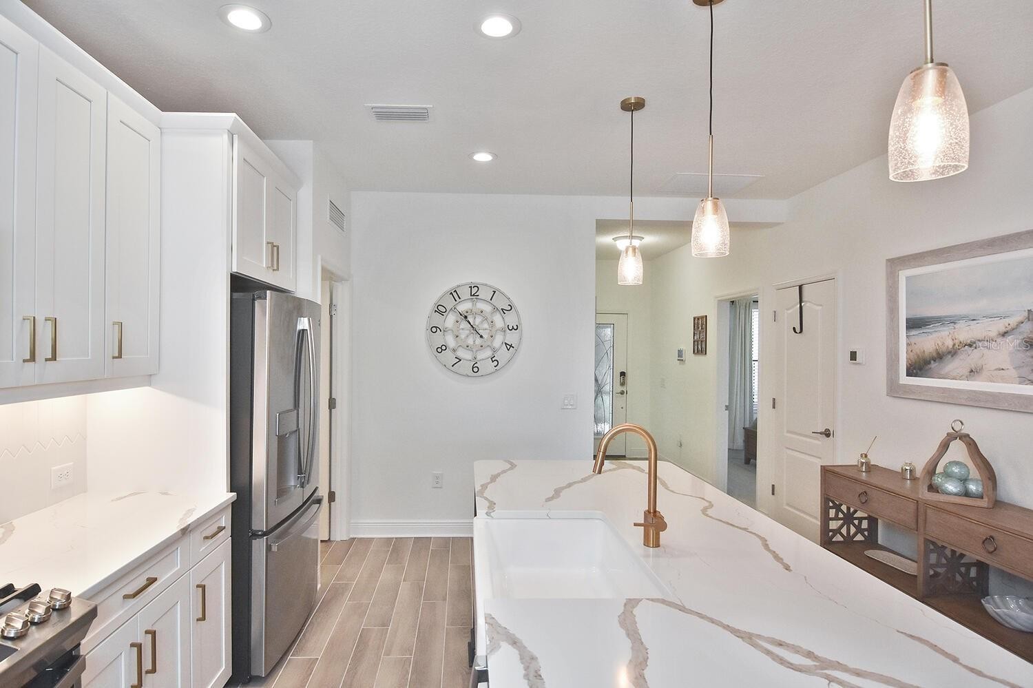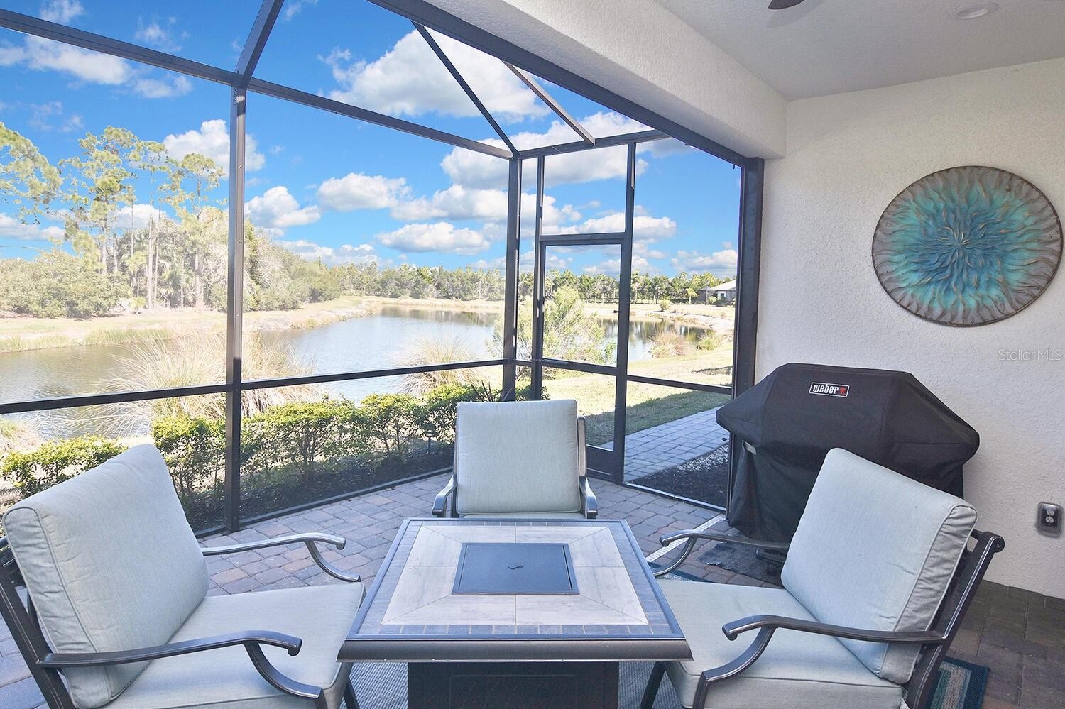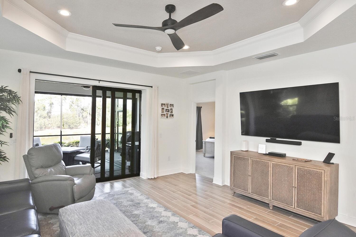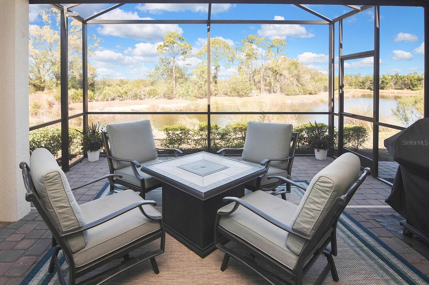 Welcome to this beautifully designed 3-bedroom + den, 2-bath villa with a 2-car garage, perfectly situated in a sought-after golf course community. The moment you enter, you?ll notice the expansive tile flooring that flows seamlessly throughout the main living areas, creating a bright and sophisticated atmosphere. The gourmet kitchen is a true showpiece, featuring: Soft-close cabinetry, Quartz countertops, Farmhouse sink, & Stainless-steel appliances The spacious primary suite offers comfort and privacy, while two additional bedrooms and a versatile den provide flexibility for guests, a home office, or hobby space. Step outside to your extended lanai, complete with storm-smart shades, where you can relax and enjoy tranquil views overlooking a quiet pond ? the perfect setting for relaxing. Additional highlights include: Laundry room with built-in cabinetry and utility sink. All impact windows and doors for peace of mind Located within a beautifully maintained golf course community, this villa combines luxury, comfort, and low-maintenance living in an exceptional setting.