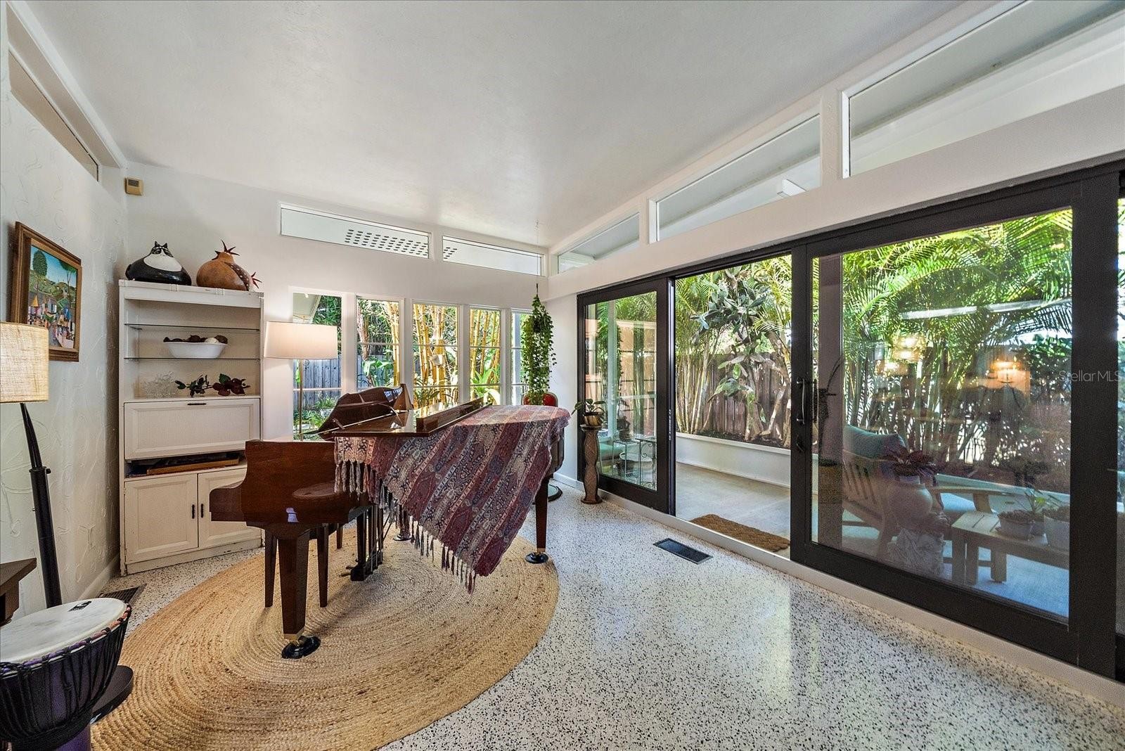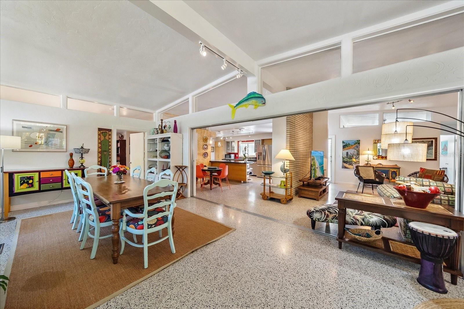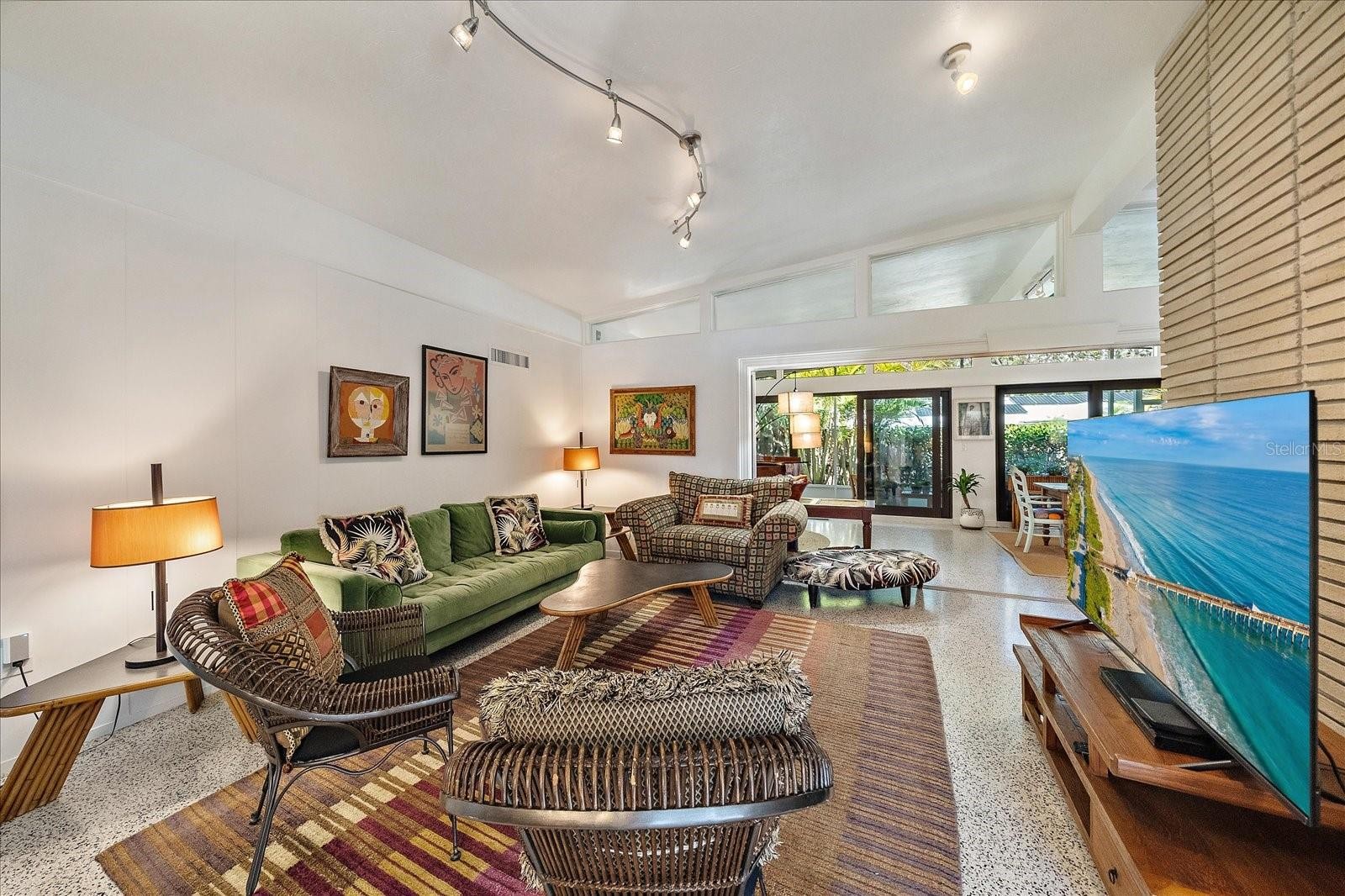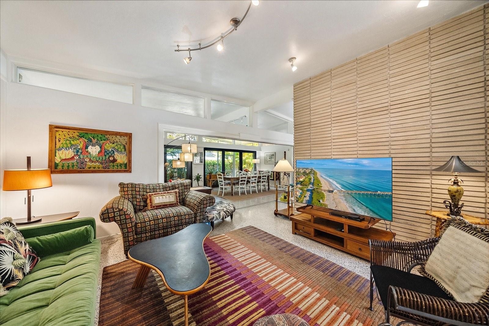 An exceptional opportunity to own a striking example of Sarasota’s celebrated midcentury-modern architecture. Originally designed in 1957 for the Stottlemyer family, this thoughtfully preserved residence is one of the few larger homes of its kind, offering timeless design, architectural integrity, and modern livability. Vaulted ceilings, exposed beams, and exquisite terrazzo floors define a wide-open, gallery-like floor plan—ideal for showcasing art and design collections. Walls of sliding glass doors accented by transom windows and soaring 10-foot ceilings flood the interior with natural light, creating a seamless connection between indoor and outdoor living. Lovingly maintained and sensitively updated over the years, the home now offers four bedrooms and two baths with approximately 2,252 square feet under air. The open eat-in kitchen features trendy, era-complementary concrete countertops, while the bathrooms retain their original tile, honoring the home’s midcentury roots. Bedrooms include cedar-lined closets, adding warmth and functionality. Additional features include a one-car garage and a one-car carport, along with hurricane shutters and a newer metal roof for added peace of mind. Outside, a low-maintenance, Florida-friendly landscape with mature fruit trees creates a serene setting, while the backyard offers a tranquil, Zen-like retreat with ample space for outdoor entertaining. Ideally located in the highly sought-after Southside School District, just blocks from Siesta Drive, this home enjoys exceptional convenience to Southside Village, world-renowned Siesta Key beaches, and Sarasota’s vibrant downtown cultural scene. A rare architectural offering—rich in history, light, and livability—this is midcentury Sarasota at its finest.