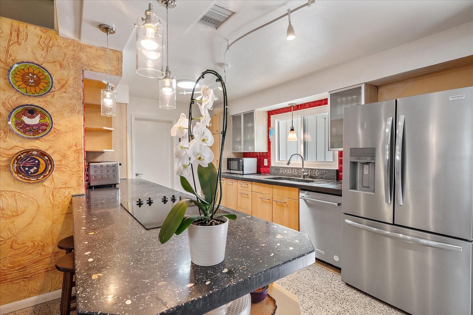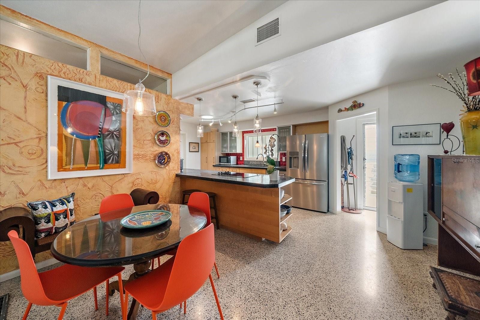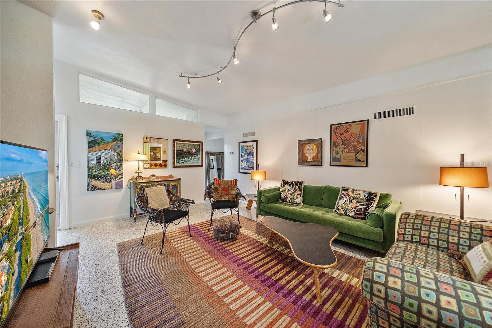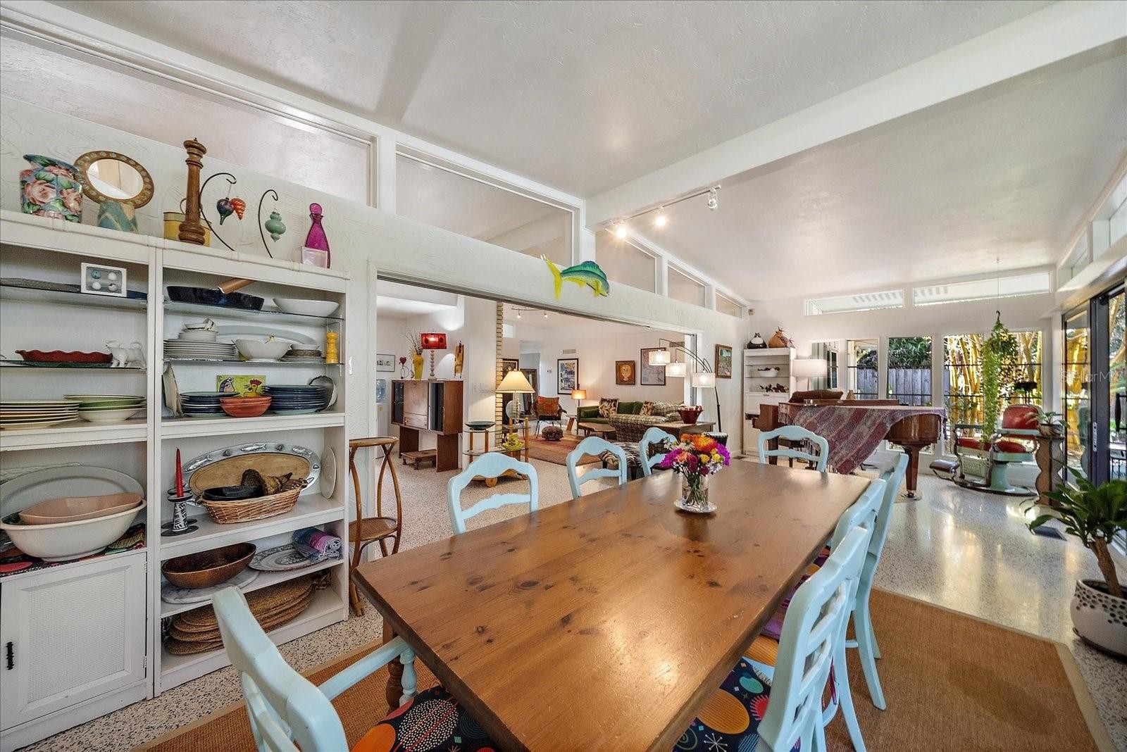 An exceptional opportunity to own a striking example of Sarasota’s celebrated midcentury-modern architecture. Originally designed in 1957 for the Stottlemyer family, this thoughtfully preserved residence is one of the few larger homes of its kind, offering timeless design, architectural integrity, and modern livability. Vaulted ceilings, exposed beams, and exquisite terrazzo floors define a wide-open, gallery-like floor plan—ideal for showcasing art and design collections. Walls of sliding glass doors accented by transom windows and soaring 10-foot ceilings flood the interior with natural light, creating a seamless connection between indoor and outdoor living. Lovingly maintained and sensitively updated over the years, the home now offers four bedrooms and two baths with approximately 2,252 square feet under air. The open eat-in kitchen features trendy, era-complementary concrete countertops, while the bathrooms retain their original tile, honoring the home’s midcentury roots. Bedrooms include cedar-lined closets, adding warmth and functionality. Additional features include a one-car garage and a one-car carport, along with hurricane shutters and a newer metal roof for added peace of mind. Outside, a low-maintenance, Florida-friendly landscape with mature fruit trees creates a serene setting, while the backyard offers a tranquil, Zen-like retreat with ample space for outdoor entertaining. Ideally located in the highly sought-after Southside School District, just blocks from Siesta Drive, this home enjoys exceptional convenience to Southside Village, world-renowned Siesta Key beaches, and Sarasota’s vibrant downtown cultural scene. A rare architectural offering—rich in history, light, and livability—this is midcentury Sarasota at its finest.