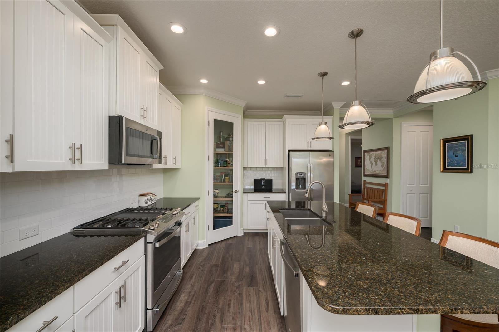 Welcome to 2726 Sapphire Blue Lane in the highly sought-after Indigo community at Lakewood Ranch. Built in 2020, this elegantly upgraded villa is perfectly positioned to capture peaceful nature views from its private, expanded lanai. Pocket sliding glass doors seamlessly connect the open-concept living space to the outdoors, creating a true indoor-outdoor Florida lifestyle. The thoughtfully designed split floor plan offers both comfort and functionality. The chef-inspired kitchen features custom white wood beadboard cabinetry with under-cabinet lighting, and tall 42” upper cabinets, soft-close dovetail drawers, Brazilian granite countertops, a spacious island with seating, stainless steel appliances including a gas range, and a walk-in pantry with wood shelving. Eight-foot interior doors, crown molding, plantation shutters, upgraded lighting and fans, and wood-look luxury vinyl plank flooring throughout the main living areas elevate the home’s refined aesthetic. The light-filled great room and dining area flow effortlessly to the lanai, complete with high-impact sliding doors for added peace of mind. Constructed with poured concrete-filled walls, extra roof insulation upgrades for enhanced safety and quiet, and a whole-house surge protector, this residence offers both comfort and confidence. The primary suite is a tranquil retreat with serene nature views, a large walk-in closet with custom built-ins, a second oversized closet, and an en-suite bath featuring dual vanities, white cabinetry, and a spacious walk-in shower. The split layout positions the second bedroom and full bath toward the front of the home for privacy. A versatile flex room offers the perfect space for a den, office, or guest overflow. Additional features include high-impact windows and doors, custom window treatments, a large and well-equipped laundry room, ample storage, a two-car garage, and a paver driveway and walkway. Enjoy maintenance-free living just steps from the Villas’ private Oasis Pool and Spa. Indigo’s resort-style amenities include a second community pool and spa, clubhouse, fitness center, pickleball and bocce courts, playground, activity director, and more. Ideally located near UTC shopping and dining, Waterside Place, Premier Sports Campus, championship golf courses, scenic parks, and the world-renowned Gulf beaches — this home offers the perfect balance of serenity, luxury, and convenience. Experience effortless Florida living at its finest.