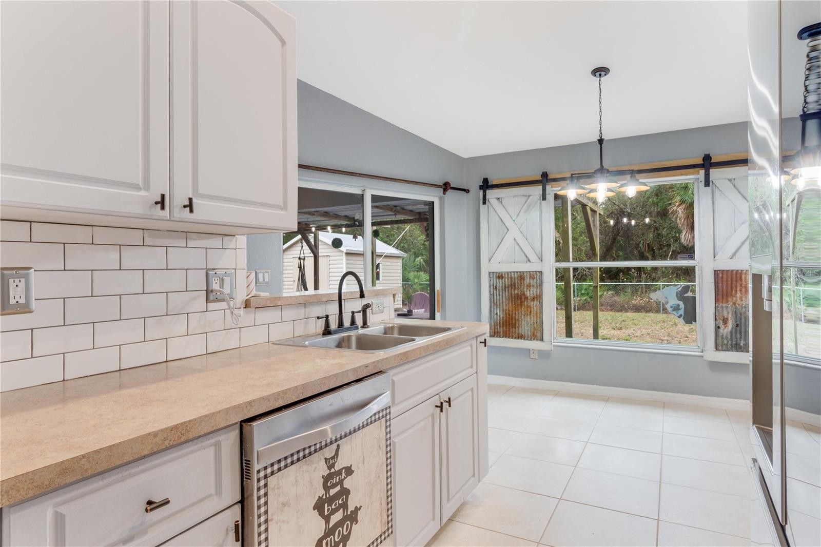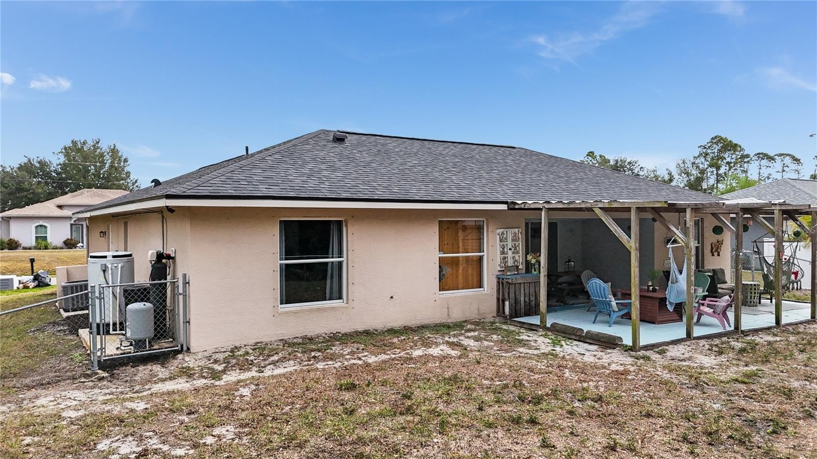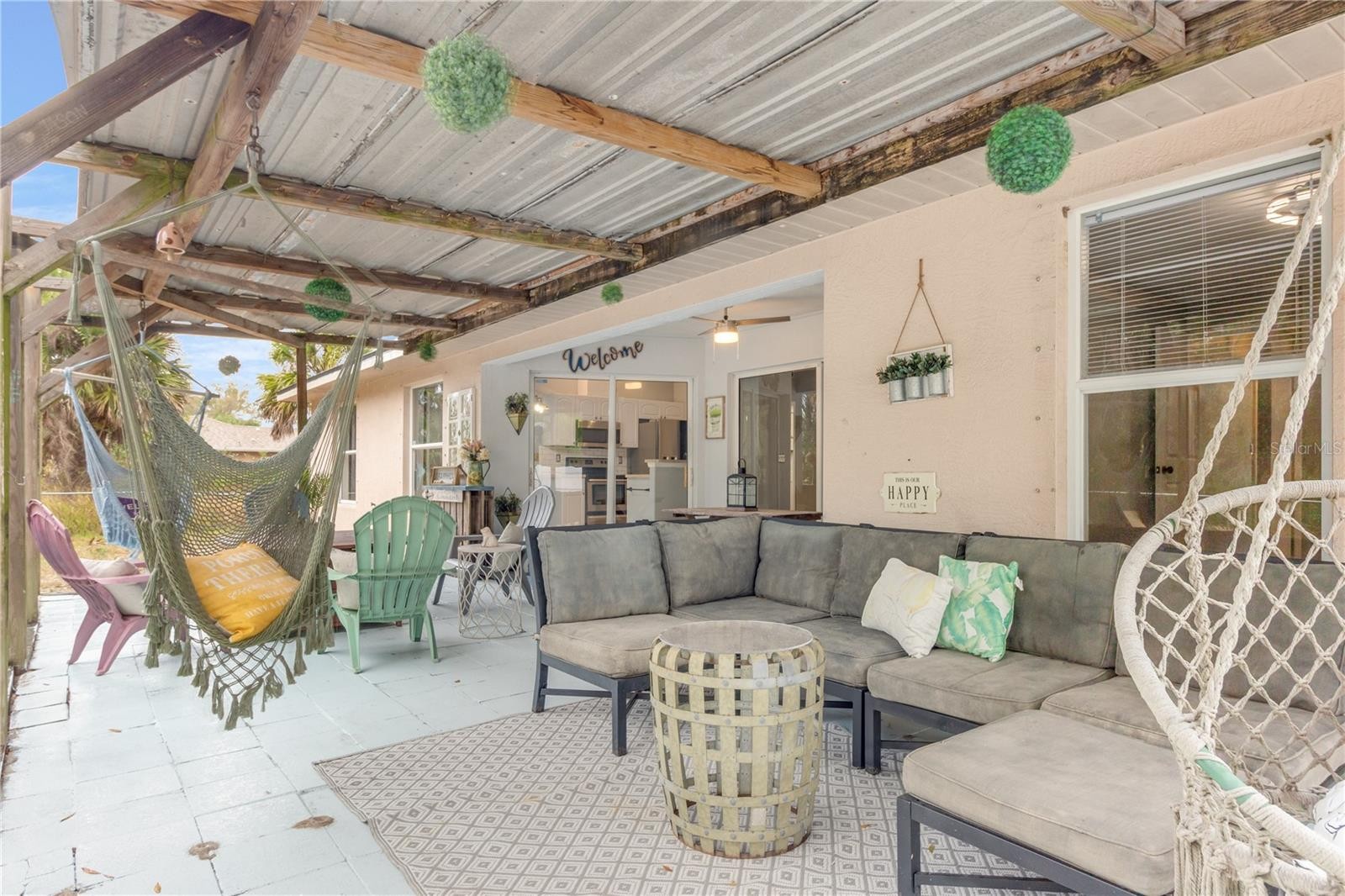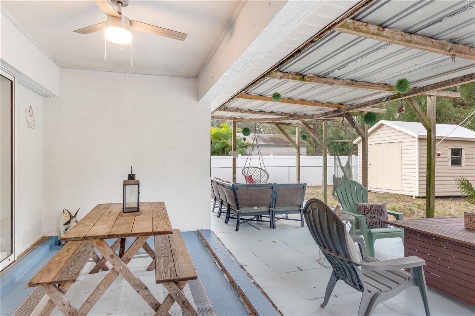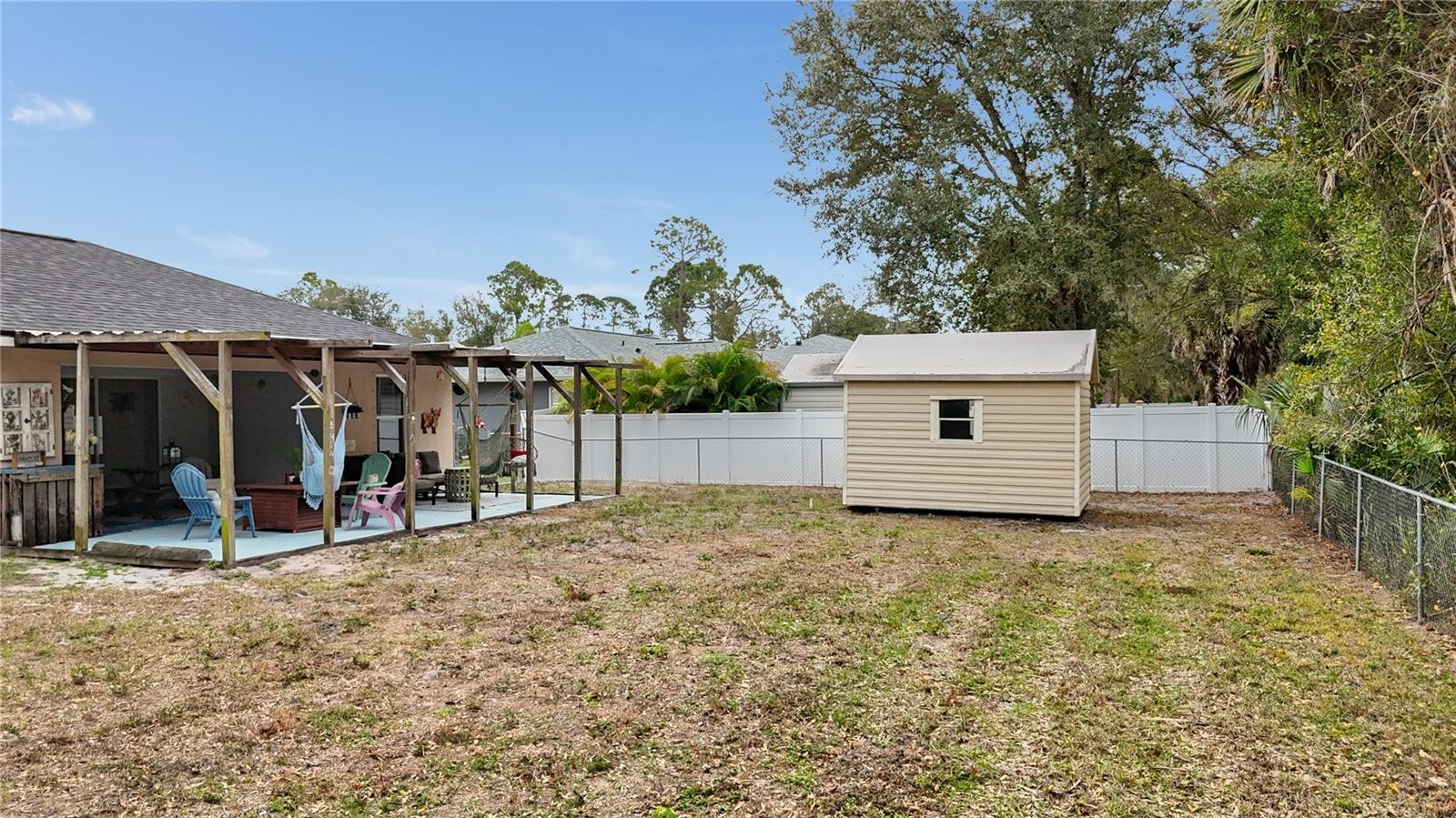 ** PLEASE TAKE A WALK THROUGH YOUR NEW HOME WITH THE 3D INTERACTIVE VIRTUAL TOUR ** Welcome to this move-in-ready 3-bedroom, 2-bathroom, 2-car garage home, tucked away on a quiet street in one of North Port’s most desirable neighborhoods. From the moment you arrive, curb appeal shines with tropical landscaping, fresh mulch, exterior lighting, and elegant entry pillars that warmly welcome you home. Relax on the charming front pergola with hanging swings, the perfect spot to enjoy a good book or soak in the Florida sunshine. Built for comfort and peace of mind, this home features a new roof (2022), A/C (2021), hurricane shutters, and a water heater installed in 2019. Step inside to a bright, open floor plan with soaring vaulted ceilings, neutral tones, and ceramic tile throughout the entire home, making it both low maintenance and pet friendly. Abundant natural light pours in through the front windows and triple sliding glass doors in the great room. A unique wood accent wall adds character and warmth to the main living space, a truly standout feature. The kitchen is well appointed with laminate countertops, subway tile backsplash, plant shelves, recessed lighting, a closet pantry, breakfast bar, and an abundance of cabinet space. Bonus, all stainless steel appliances are included. The dining area features a large window with custom sliding barn door blinds and a modern light fixture, creating an inviting space for everyday meals or entertaining. The desirable split-bedroom layout offers privacy for owners and guests alike. Guest bedrooms are generously sized with ceiling fans, ample closet space, and natural light. The guest bathroom includes a tub and shower combination, modern vanity, and upgraded lighting. The primary suite is a relaxing retreat with a walk-in closet and an en-suite bathroom featuring a single vanity with epoxy countertop, linen closet, and walk-in shower with a built-in bench. An updated indoor laundry room located off the kitchen provides additional storage and functionality, all within the comfort of your air-conditioned living space. Step outside through double sliding glass doors to your private backyard oasis. The covered lanai is ideal for outdoor dining and grilling year round. A farmhouse-style patio with paver flooring, metal roof, and wood beams offers the ultimate place to unwind. Gather around the firepit, relax in the Adirondack chairs, or enjoy the hanging swings while taking in Florida’s beautiful weather. The fully fenced backyard includes a utility shed with electric hookup potential and plenty of space for kids or furry friends. Surrounded by mature oaks, sunshine, and the sounds of nature, this serene setting feels like a true retreat. With no HOA, no deed restrictions, and no flood zone designation, this property offers exceptional flexibility. Conveniently located near schools, dining, Coco Plum Shopping Center, and the vibrant Wellen Park area, home to the Atlanta Braves Spring Training stadium, dining, fishing pier, and weekly Sunday farmers market. Easy access to I-75 and US-41 puts you just a short drive from some of Florida’s most beautiful beaches. Whether you are searching for a full-time residence or a seasonal escape, this beautifully maintained home offers comfort, style, and functionality in a prime location. Schedule your private showing today and start your next chapter here.