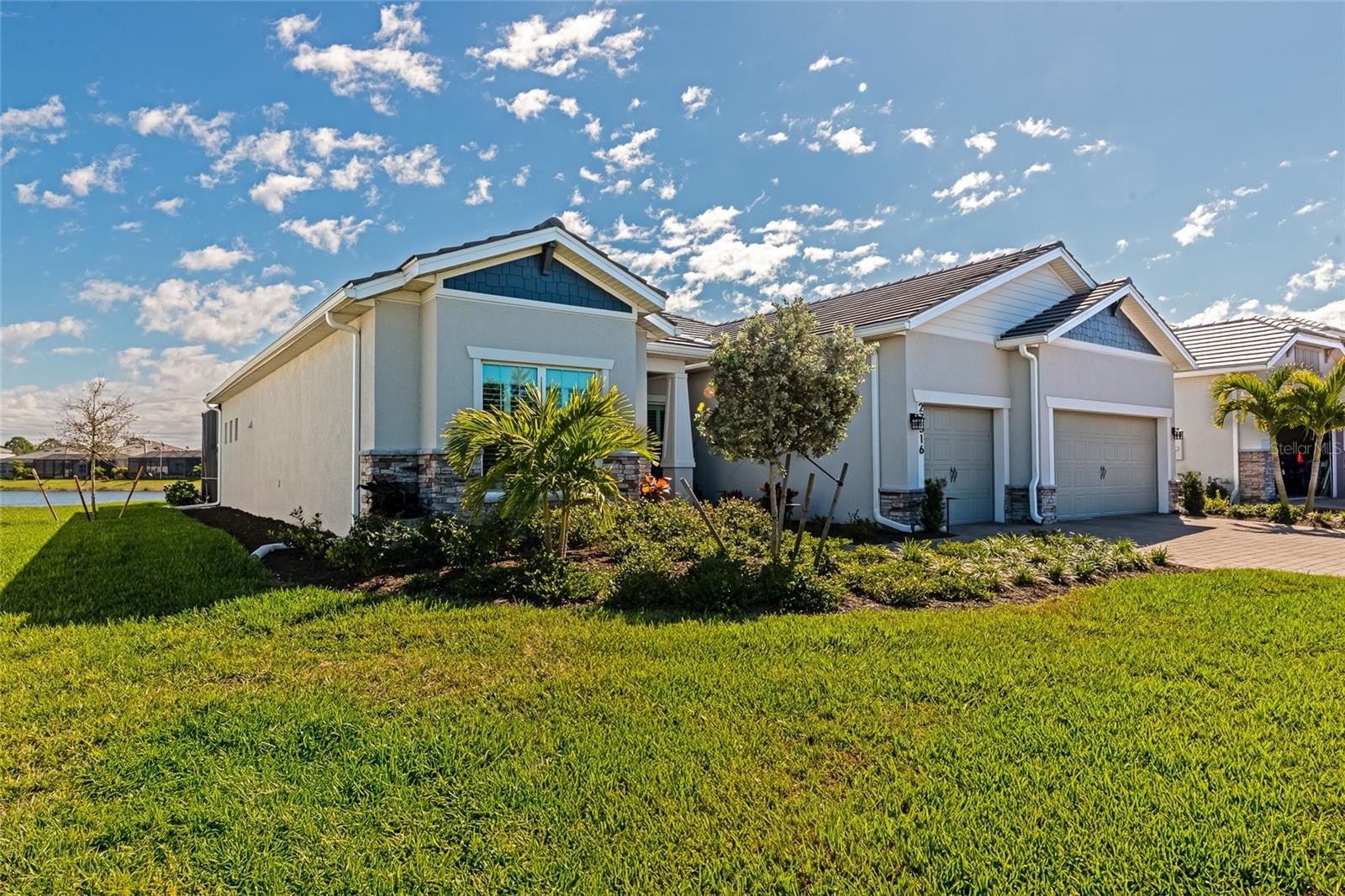 Welcome to this beautifully designed Stellar floor plan located ON THE WATER in the highly sought-after Beachwalk by Manasota Key community. The exterior stone masonry, glass insert door & LED lighting give this home an inviting curb appeal. Plus the extra space on each side of the home adds to the allure. This home offers a bright, open concept layout that perfectly captures the Florida lifestyle, with seamless flow between living, dining, and kitchen spaces, ideal for both everyday living and entertaining. ONLY 2.5 MILES TO THE BEACH. The kitchen is thoughtfully designed with ample cabinetry, generous counter space, and modern finishes, overlooking the main living area to keep everyone connected. WATER FILTRATION SYSTEM. Natural light fills the home. Decorative ceiling wood beams, accent wall & 8 FOOT DOORS adds to the elegance of this home. The spacious primary suite serves as a private retreat, complete with a well-appointed bathroom, walk-in shower, double sinks and large walk-in closet. Additional bedrooms provide flexibility for guests, a home office, or family, while the overall layout balances openness with privacy. Step thru the ZERO CORNER DOORS and enjoy indoor/outdoor living on the EXTENDED LANAI WITH IN-GROUND HEATED BY SOLAR SALT WATER POOL WITH DECK JETS WATER FEATURE, perfect for relaxing afternoons or evening gatherings. Whether you’re enjoying quiet mornings, swimming or hosting friends, this home is designed to make the most of Florida’s year-round sunshine. 3 CAR GARAGE WITH 4FT EXTENSION. IMPACT GLASS WINDOWS/DOORS. Enjoy a resort style lifestyle which includes the ON SITE HIGH TIDE TIKI BAR, the Waterline upscale restaurant (opening in 2026), 21 sports courts for pickleball, tennis, and bocce ball, a resort style pool with beach entry and attached lap pool, amenities center, Cafe', fitness center, boardwalk, Veterans memorial park, community garden, dog park, and miles of trails. The full time activity directors ensure a vibrant and engaging social calendar. Conveniently located near some of Florida’s most beautiful beaches, boating, exceptional dining, shopping, schools, and endless outdoor recreation. This home offers the perfect blend of luxury, comfort, low maintenance and location, so don't miss your opportunity to live in Paradise.