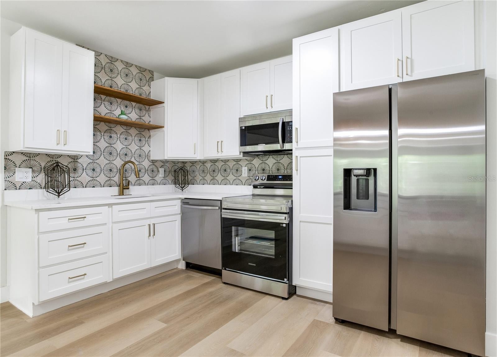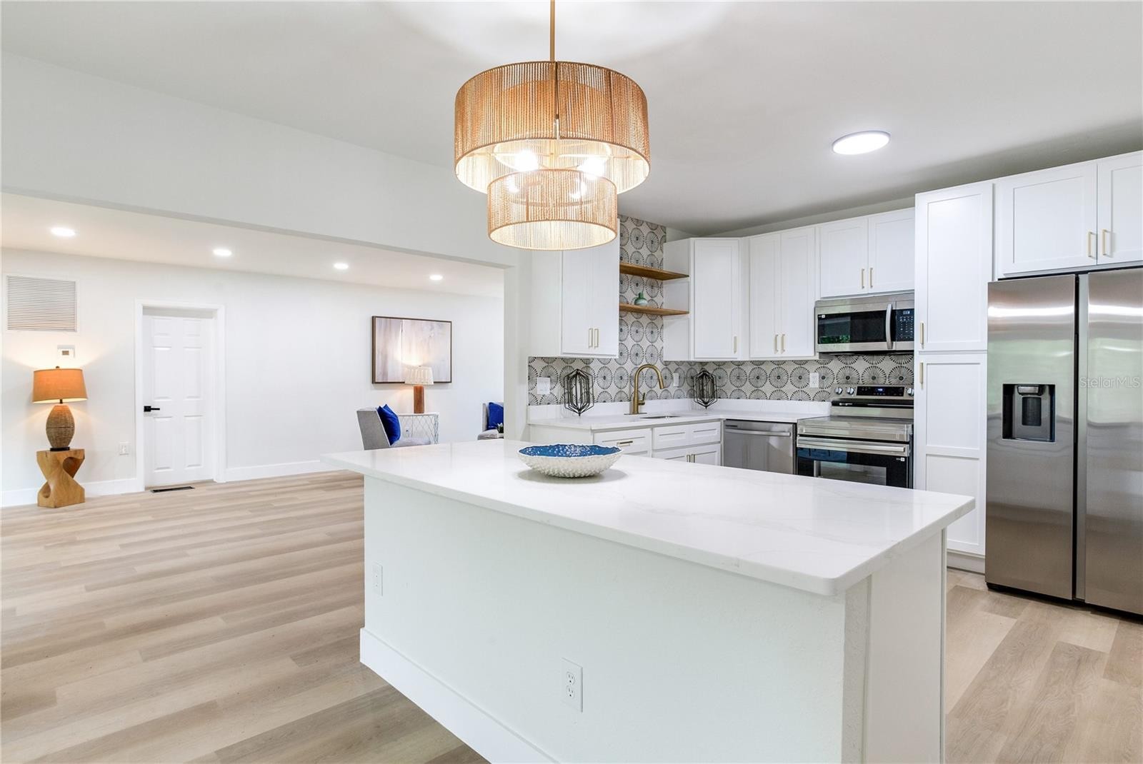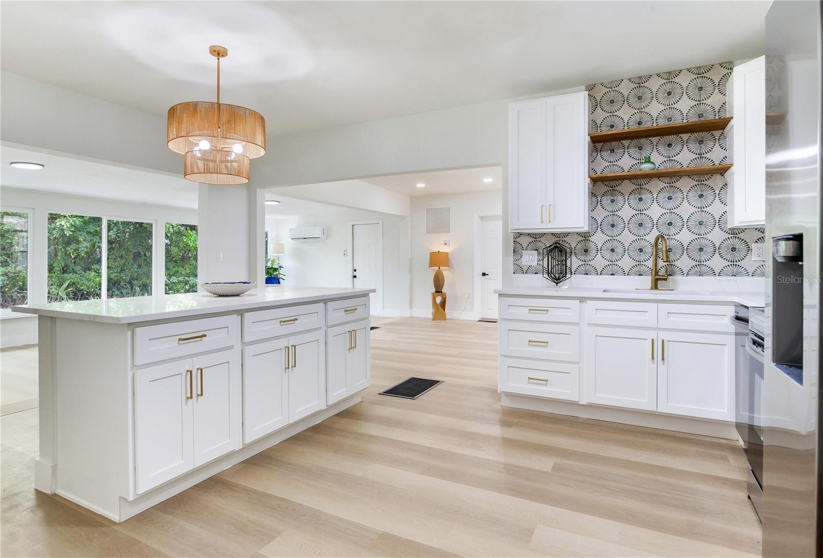 Welcome to 2753 Valencia Drive, a beautifully reimagined 2-bedroom, 2-bath residence offering 1,541 square feet of light-filled living in the heart of Sarasota. From the moment you arrive, the home’s clean mid-century lines, fresh exterior finishes, and inviting covered entry set the tone for what’s inside. Step through the front door into a bright, open living space where wide-plank flooring, recessed lighting, and a soft neutral palette create a warm yet modern feel. The spacious living room flows effortlessly into a secondary sitting area centered around a charming brick fireplace perfect for relaxing evenings or entertaining guests. The fully renovated kitchen is both stylish and functional, featuring crisp white shaker cabinetry, quartz countertops, stainless steel appliances, designer backsplash, and elegant gold hardware accents. Thoughtful details and ample storage make this space as practical as it is beautiful. Just beyond, a sun-drenched dining area is surrounded by large windows that bring the outdoors in, creating the perfect setting for morning coffee or intimate dinners while overlooking the private backyard. Both bathrooms have been tastefully updated with modern vanities, upgraded fixtures, and clean, timeless finishes. The bedrooms are generously sized, offering comfort and flexibility for guests, a home office, or everyday living. Step outside to a spacious backyard with room to create your own outdoor oasis whether it’s a pool, garden, or entertaining space. The covered patio adds even more versatility for year-round enjoyment. Ideally located in one of Sarasota’s most desirable areas, this home places you just minutes from downtown Sarasota, Siesta Key Beach, shopping, dining, and top-rated schools. This is a rare opportunity to own a move-in-ready home that perfectly blends modern updates with timeless charm your Florida lifestyle starts here.