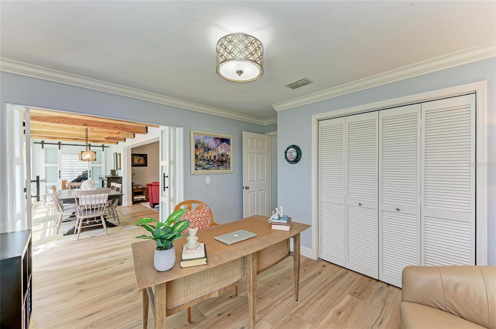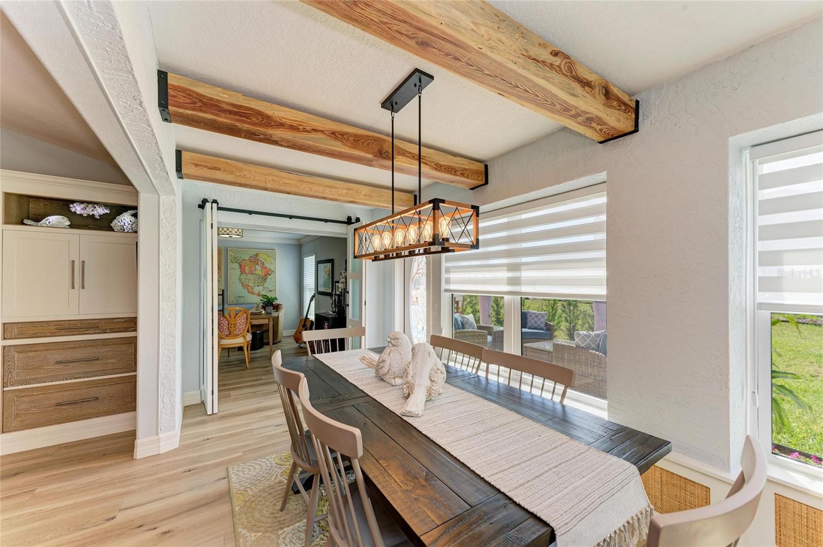 Back on the market and priced to sell this Stunning Fully Renovated 3/2 Home is located in a highly sought-after 55+ Community in Englewood. This 1,796 sq ft home boasts an open floorplan and a thoughtful design that maximizes space while offering luxury and comfort throughout. As you walk into this home you will be in awe of the solid wood entry door and Coretech luxury vinyl flooring that flows seamlessly throughout the entire home, with the exception of the tiled bathrooms, providing a sleek and durable finish. The kitchen is a dream featuring stunning marble countertops and a matching marble backsplash and is equipped with stainless steel appliances and a wood paneled Sub Zero refrigerator to match the cabinets. The large island maintains a built-in dishwasher, sink and storage -perfect for cooking and entertaining. There is a built-In Laundry Closet conveniently located off the kitchen, ensuring practicality without sacrificing style. The spacious family room is enhanced with handmade built-in storage cabinets with display shelving and a bar cabinet, perfect for hosting guests. The Primary suite will be your own private sanctuary with a separate sitting area, a beautifully designed ensuite bathroom featuring a double-sink vanity with LED lighted mirrors, including a defogger option, a glassed-in water closet for extra natural light and three large lighted built-in armoires for maximum organization. Elegant touches throughout this home including natural wood beams in the dining room providing a warm, rustic charm and Wood-framed and glass bifold doors leading into both the primary suite and second bedroom. A two car garage and paver patio in the back round out this fabulous home. Oh and did I mention the roof is part of your HOA fees! Park Forest offers maintenance free living and exceptional amenities including Clubhouse, heated pool and spa, tennis/pickleball courts, bocce ball courts and shuffleboard. There is also boat and RV storage available for a cost. Location is prime as the community is situated close to newly renovated historic Dearborn Street with shopping and great local restaurants and you are only 4 miles to beautiful Gulf coast beaches. Don't miss your chance to own this exceptional home with extraordinary attention to detail and design. Schedule your showing today!
