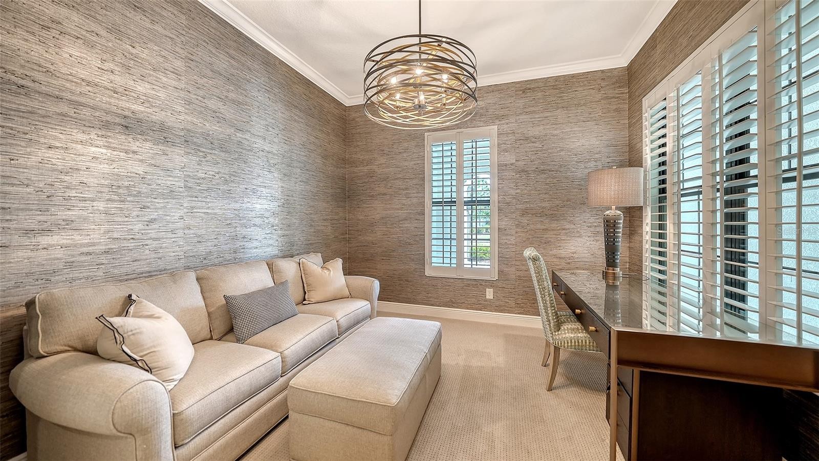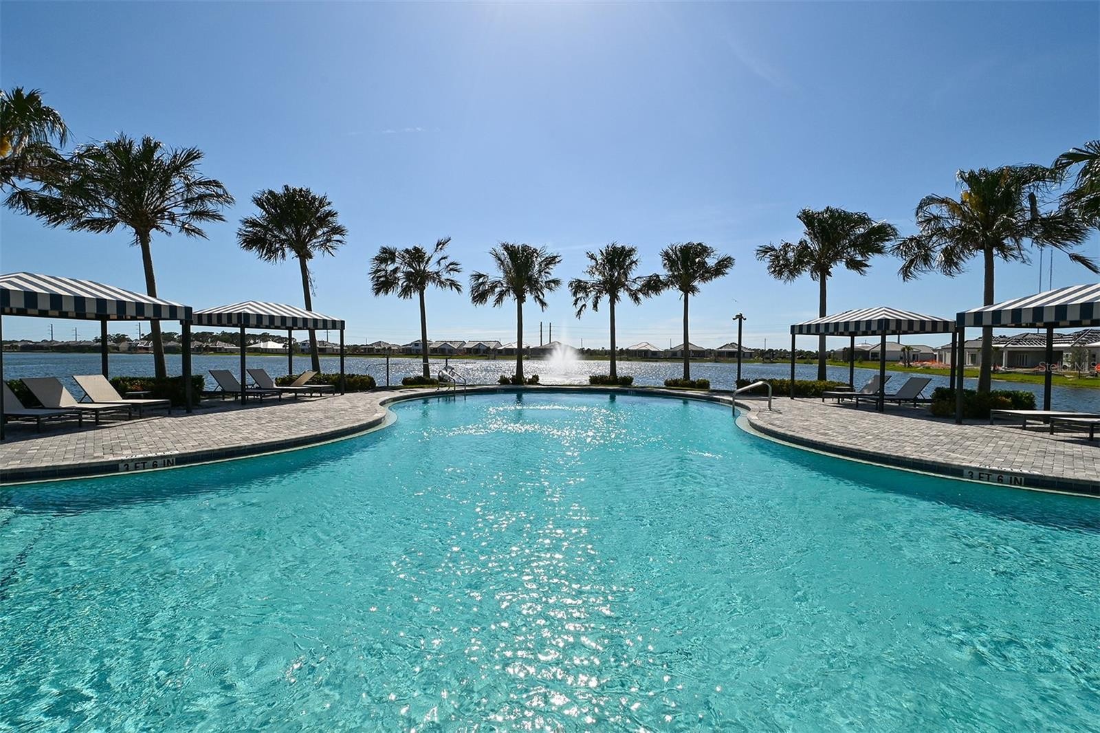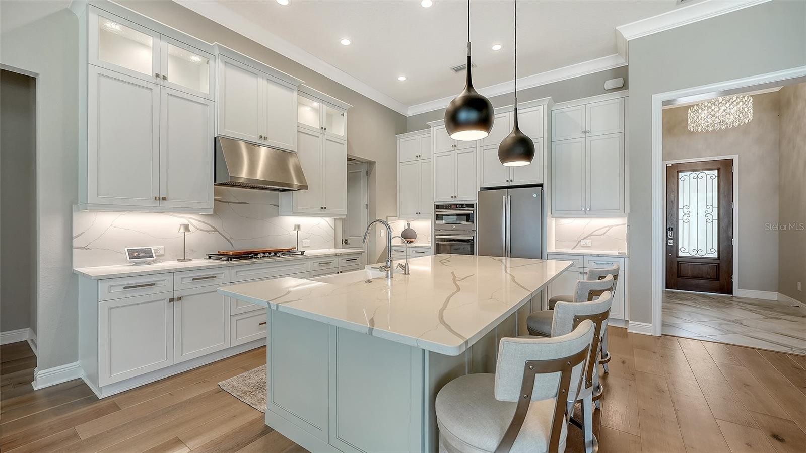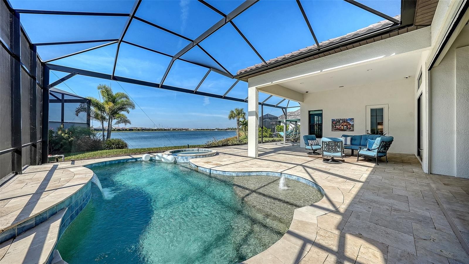 Perfectly positioned on the largest, most coveted lot in the community, this extraordinary modern Mediterranean masterpiece by Neal Signature Homes offers sweeping expansive lake views and unparalleled privacy. The Italian inspired façade, ceramic barrel tile roof, paved driveway, and welcoming front porch set the tone for an exquisitely curated interior exemplifying elevated Florida luxury living. Step into a dramatic foyer that opens to a sun drenched Great Room with soaring tray ceilings adorned with bespoke luxury wallpaper, transom topped windows, and wide plank engineered wood floors. An artfully designed den flows effortlessly off the Great Room, ideal for a private home office, media lounge, or fitness studio. The gourmet designer kitchen is a showpiece, featuring upgraded cabinetry, vented hood, quartz countertops, natural gas cooktop, double wall ovens, built in refrigerator, and a spacious walk in pantry with upgraded wood shelving. The adjoining dining area provides a seamless setting for intimate meals or grand entertaining. Oversized sliding doors open to a palatial screened lanai, where a stone encased, warm fireplace frames the breathtaking lake views and a private, resort style retreat. The heated saltwater smart pool with sun shelf and fully equipped outdoor kitchen, including vented hood, sink, grill, and refrigerator, creates an unparalleled outdoor living and entertaining experience. The primary suite is a serene sanctuary, boasting gorgeous lake views and a tray ceiling adorned with beautiful custom wallpaper. It's spa inspired bath features a freestanding soaking tub, dual sink quartz vanity, expansive walk in shower with floor to ceiling tile, and two oversized walk in closets with custom shelving, exemplifying refined, thoughtful luxury throughout. The private guest suite offers comfort and privacy with its own spacious closet and en-suite bath, while an additional well appointed guest bedroom shares a hall bath. A stylish powder room completes the interior, with every space designed to complement the home’s elegant aesthetic. Upgrades include plantation shutters, electric shades, impact windows, hurricane lanai shutters, custom lighting, upgraded ceiling fans, designer window treatments, exterior security cameras, epoxy garage floors and insulated garage doors. Professionally designed and impeccably styled, this residence features designer wallpaper and elevated finishes throughout. Offered fully turnkey and sold furnished, it provides a rare opportunity to enjoy immediate, high caliber Florida luxury living. Residents of the gated, maintenance free Aria at Venice community enjoy world class amenities, including a resort style clubhouse, sparkling pool and spa, fitness center, championship pickleball courts, serene lakes, landscaped grounds, and an expansive events lawn offering resort inspired living at its finest. Ideally located near downtown Venice, Sarasota Memorial Hospital, premier shopping and dining, and just minutes from Venice Beach with convenient I-75 access, this property represents a truly unparalleled lifestyle in one of Florida’s most coveted communities.