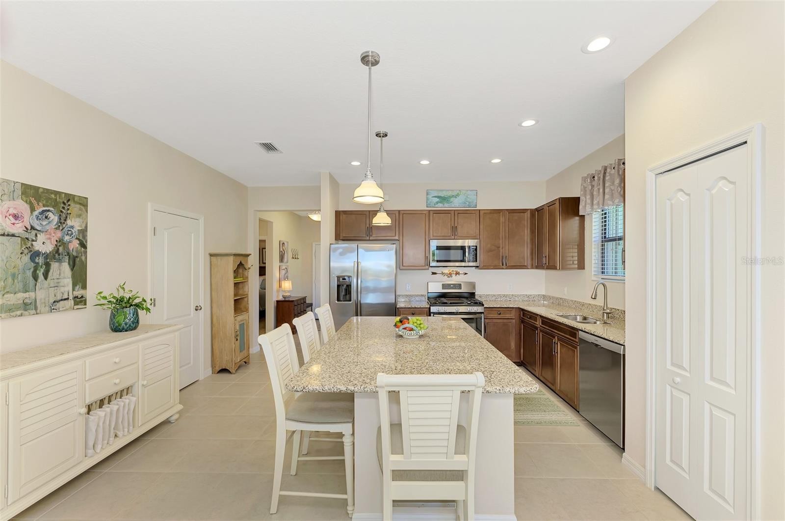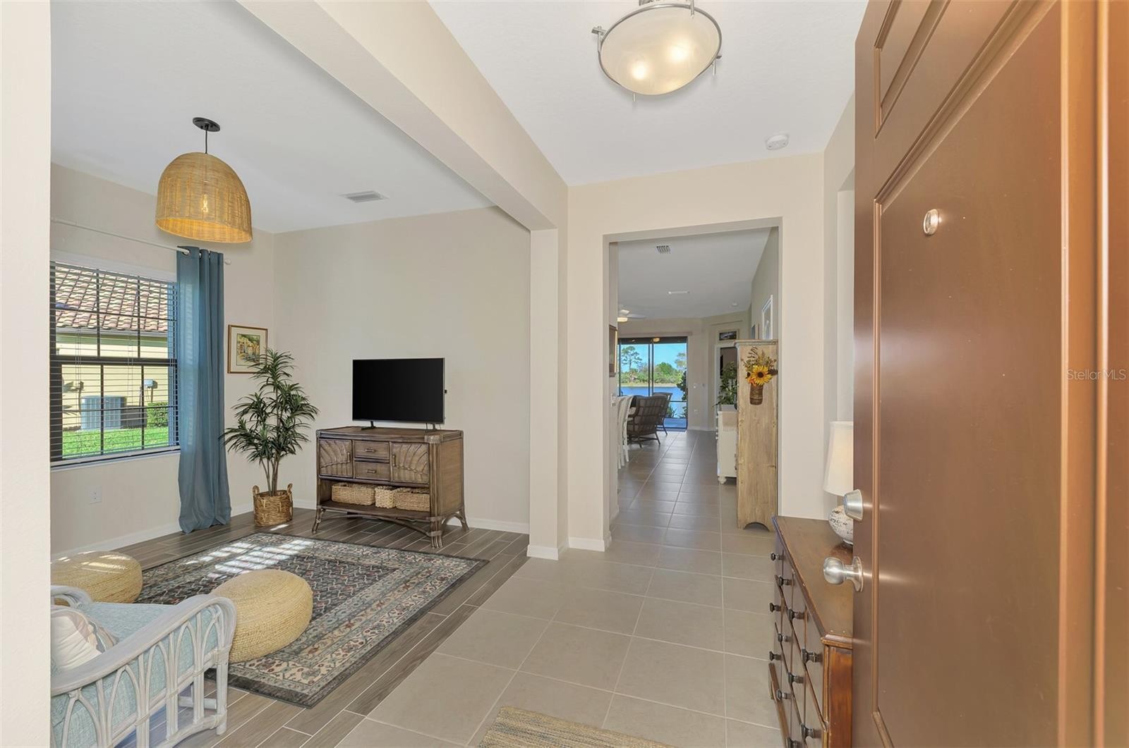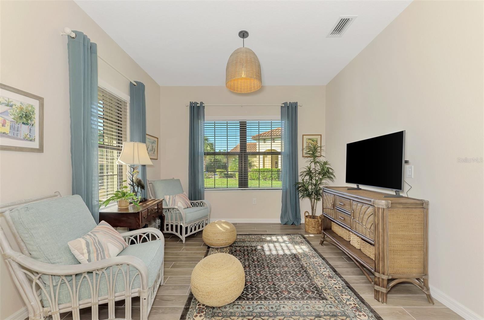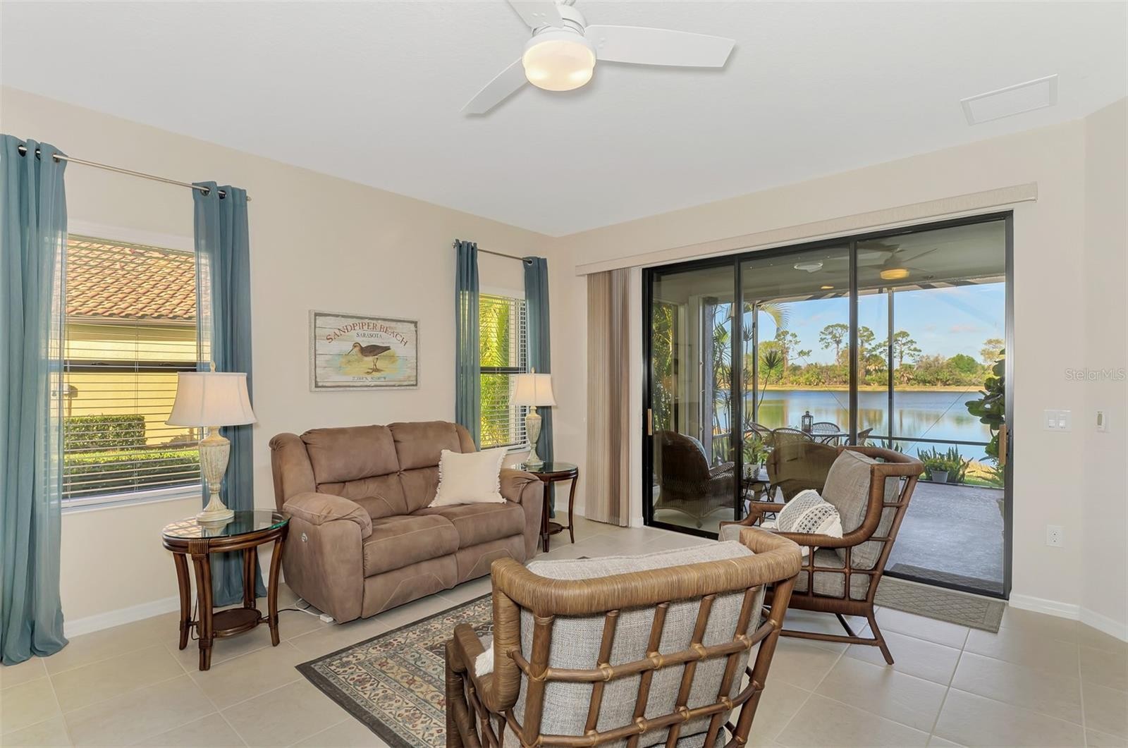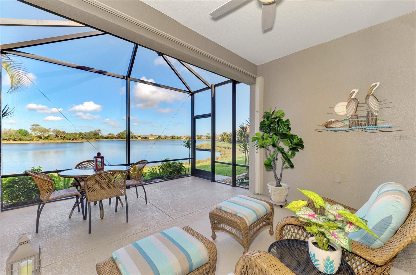 Attractive two bedroom, two bath, plus den, villa, in the desirable Milano community, with beautiful lake views. Your villa is the Crystal Sand Model and features 9 foot plus ceilings in all rooms and tile floors in all the main areas. Your kitchen features a large granite island, stainless appliances, wood cabinets and a closet pantry. Open floor plan with sliders from your living room to your lanai, with an extended cage, to enjoy amazing sunsets and wildlife. The master bedroom has water views too, a walk-in closet and large bathroom. The laundry closet is outside of the guest bathroom. The villa is being sold tastefully furnished. The Milano community features a heated, resort-style pool and spa, clubhouse, tennis and pickleball courts, bocce courts and more. Your villa has been impeccably maintained by the original owner and is move-in ready! Come see this great buy today!