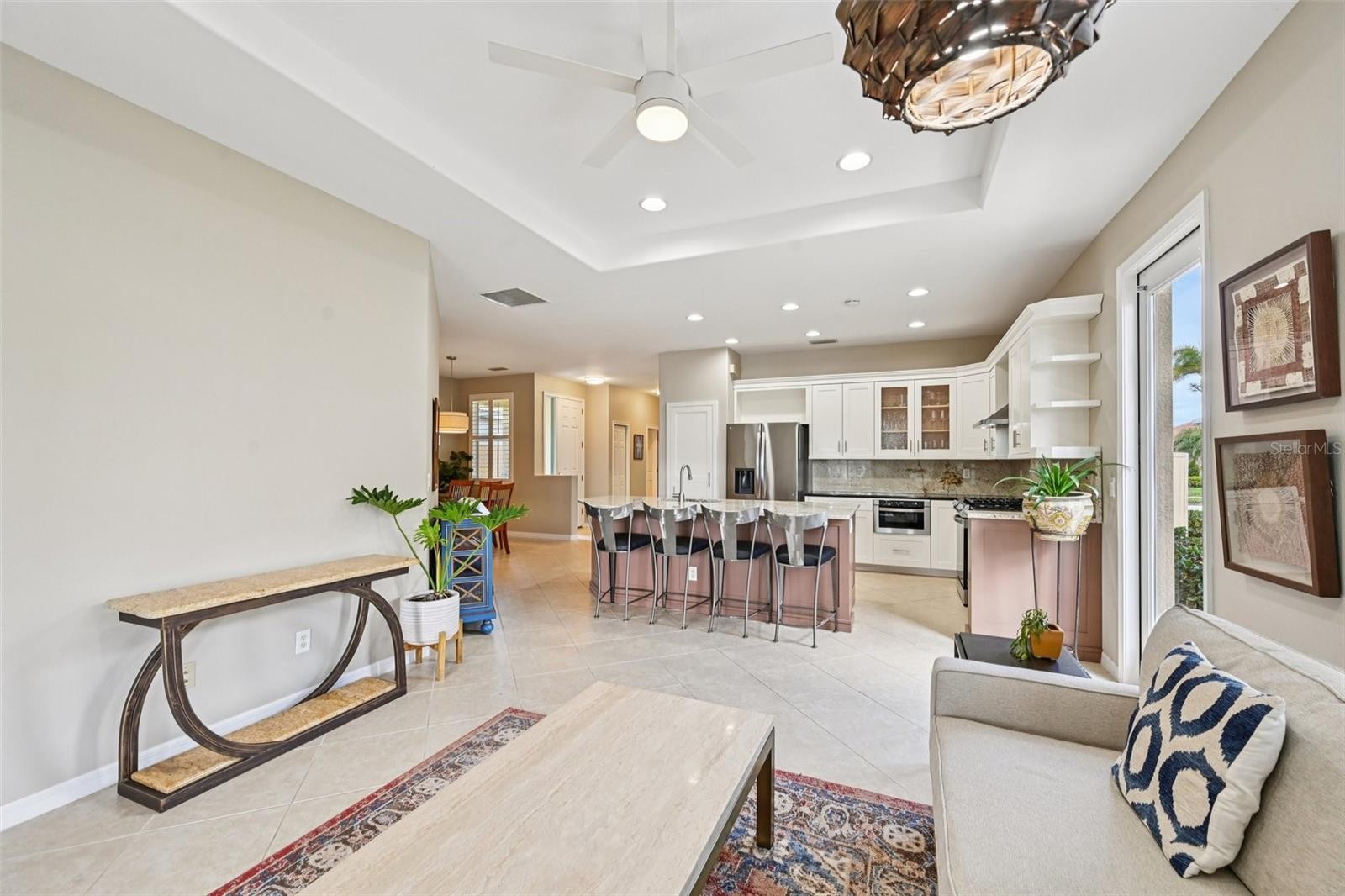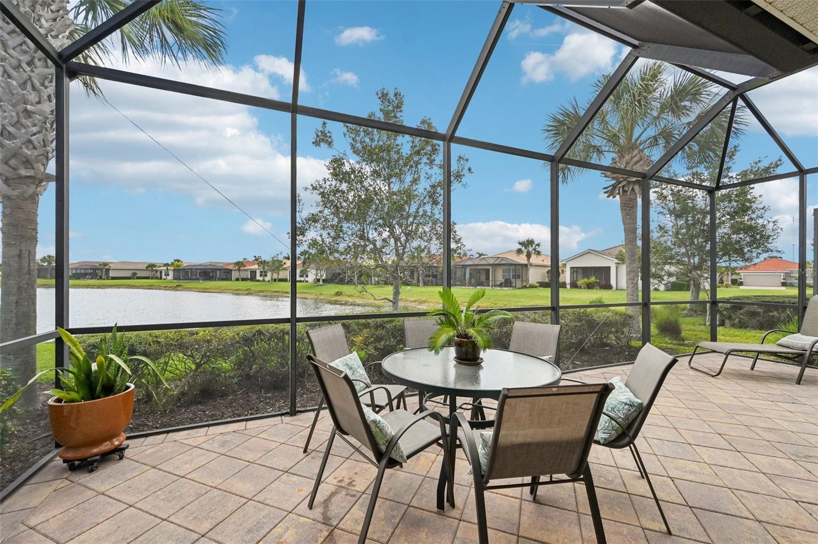 Beautifully updated three-bedroom lakefront home with an extended lanai in the highly desirable Venetian Golf & River Club in North Venice, a prestigious gated community known for its resort-style amenities and scenic setting along the Myakka River. This light-filled home offers a bright, open layout with tile flooring throughout for easy maintenance. The kitchen was recently updated with both style and functionality in mind, featuring custom soft-close cabinetry, glass-front cabinets, pot drawers, granite countertops, and stainless steel appliances including a gas range and microwave drawer. A large flat-level island is perfect for casual dining and entertaining — whip up dinner while enjoying those gorgeous water views! The primary suite at the rear of the home is a quiet retreat with expansive windows overlooking the lake, direct access to the lanai, and an oversized bathroom and walk-in closet. The split-bedroom layout offers comfort and flexibility, while two additional bedrooms provide valuable additional space for guests, a home office, or hobbies. Plantation shutters throughout add both privacy and timeless style. Outdoor living is one of the home’s standout features. Large glass sliders open onto the extended paved and screened lanai that runs along the back of the home, offering both covered and open areas to relax, dine, or entertain while enjoying peaceful lake views and Florida wildlife. Built by WCI and thoughtfully updated, the home combines solid construction with modern finishes and comfortable Florida living. Residents enjoy exceptional amenities including a clubhouse, restaurant and tiki bar, resort-style pool, fitness center, tennis, and pickleball. Nature lovers will appreciate the riverfront boardwalk and walking trails along the Myakka River, while the location offers convenient access to Gulf beaches, historic Downtown Venice, shopping, dining, Sarasota Memorial Hospital, the Legacy Trail, and I-75. The community also features a Chip Powell–designed championship golf course with optional membership available.