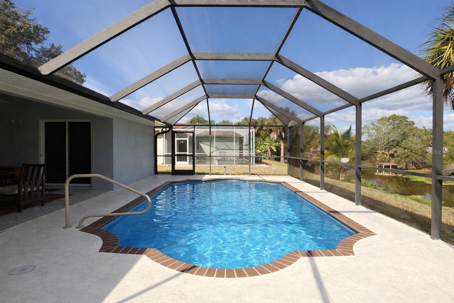 Enjoy waterfront living in this three-bedroom, two-bath, two-car garage pool home, located on the Blue Ridge freshwater canal in North Port. This split floor plan features ceramic tile throughout and includes a den with French doors that can be used as a fourth bedroom, home office, or flex space. The kitchen features granite countertops and opens to a bright breakfast nook with a large picture window overlooking the heated saltwater pool. There is also a formal dining area. Step outside to the pool area, ideal for entertaining or simply unwinding while taking in peaceful canal views. The private dock makes it easy to fish from your backyard or enjoy quiet moments by the water. Conveniently located just minutes from dining, shopping, and easy access to the interstate. New HVAC installed September 2025.