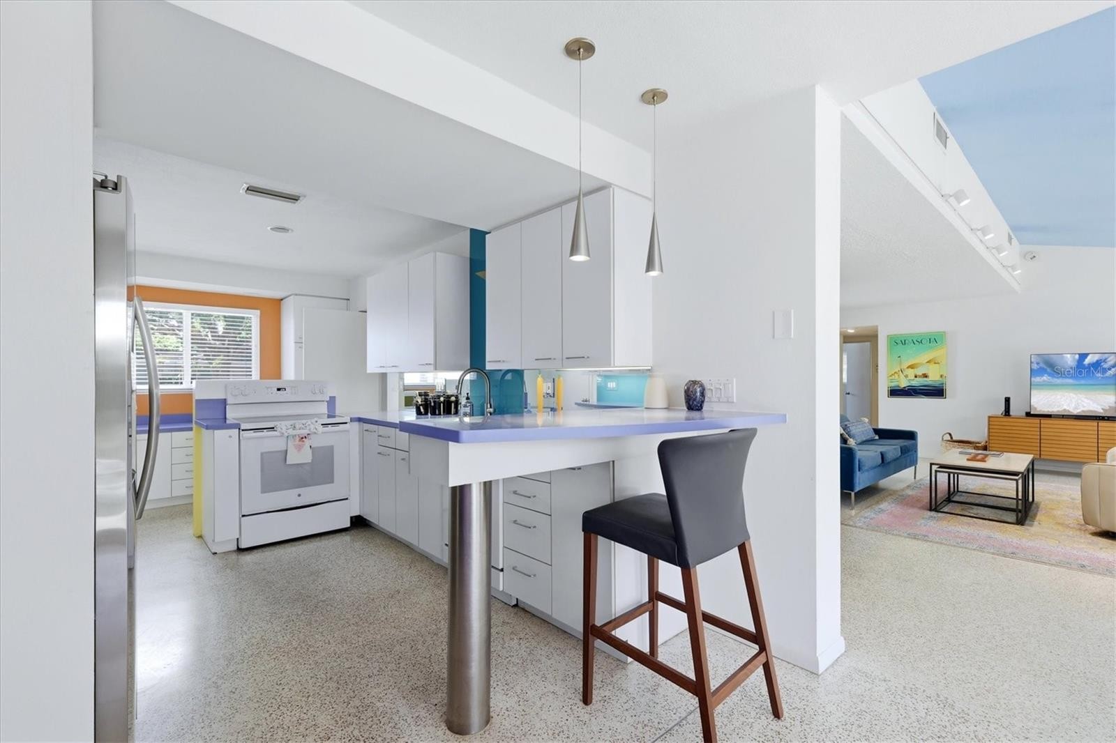 Stunning, mid-century modern home in highly desirable South Gate with views you must see to believe! If you could have picked one of the best lots in South Gate back in the 1960’s this may have been it. The two-bedroom plus office, two bath home sits on a bluff overlooking a wide portion of Philippi Creek including a large aquatic preserve. You’ll be mesmerized by long, unobstructed views in every direction. A nature lovers delight and absolutely intoxicating. But while location is important, there are many more features in this classic home to consider. Entering through the large foyer you’ll immediately notice beautiful terrazzo floors throughout and a great room with vaulted ceilings. There’s an adjacent dining area off the kitchen and all of these spaces look out through what appears to be a “wall of glass” dedicated to the world class view of flora and fauna. The primary bedroom also has views and access to the back yard and the primary bathroom has been upgraded with a separate tub and walk in shower. The den/office can be made more private with sliding pocket doors and function as a guest bedroom. It even has a dedicated, enclosed patio and garden space. There’s an attached, oversized garage with room for your workshop and a double wide driveway with plenty of parking. While this home has been appropriately updated and improved over the years you’ll find it’s all been done with a great sensibility to the original intent, quality and “hipness” so many are learning to appreciate, again.