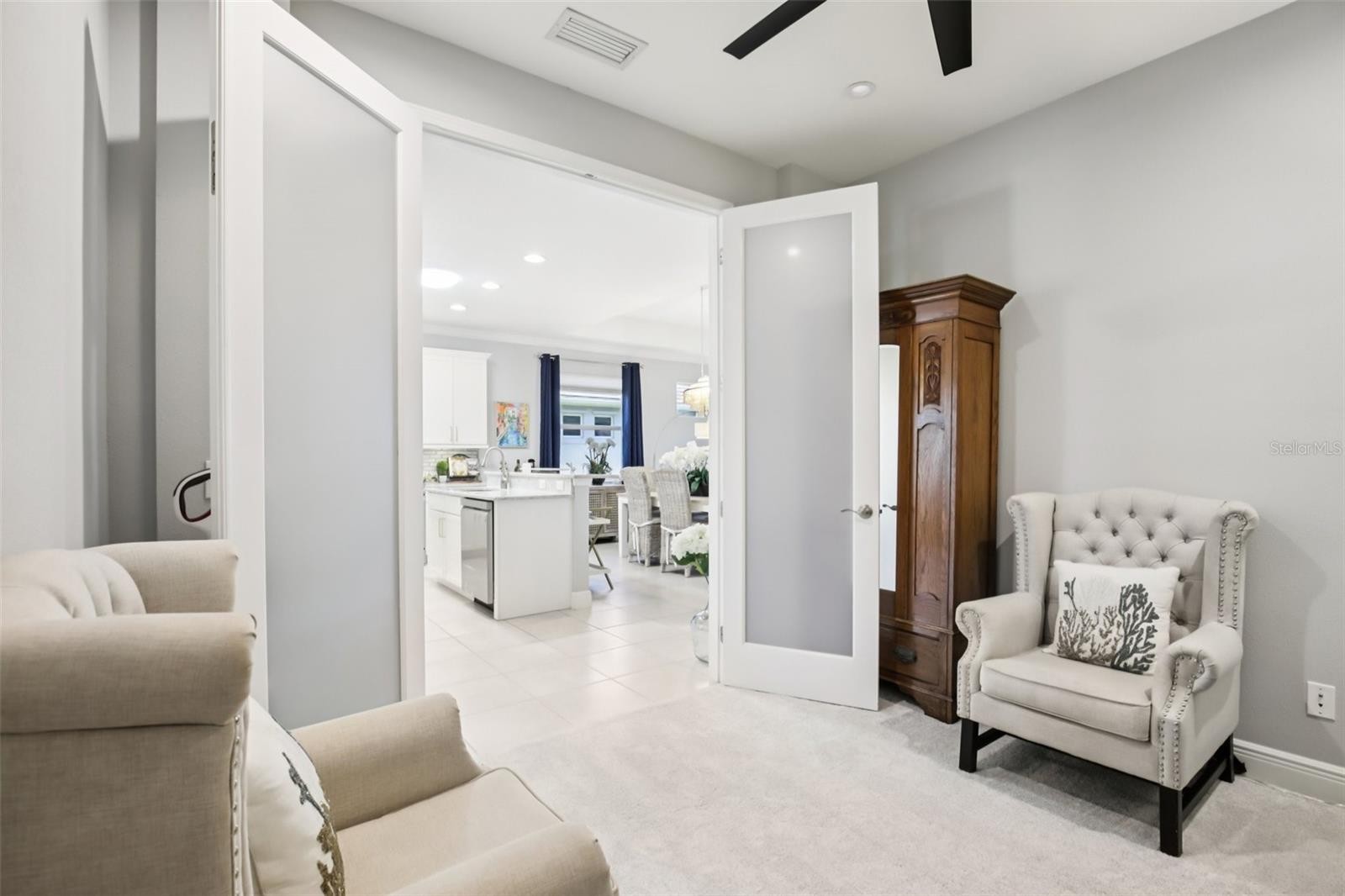 Experience "just another day in paradise" in this stunning Medallion Home, situated on one of the development’s most coveted PREMIUM lots—a $60,000 upgrade that ensures a level of privacy and scenic beauty rarely found in University Village. This isn't your typical "straight-shot" villa; a dedicated foyer welcomes you into a layout that feels like a spacious detached house, featuring 17" tile, Caesarstone counters, and a high-end NEW LG appliance suite, including a brand-new $2,500 refrigerator and gas range. Fresh 4-week-old exterior paint. There are 2 bedrooms and 2 baths, but the real bonus is the den with privacy doors that are perfect for a quiet home office, guest space, or hobbies. Den has a built-in closet. Natural light pours through a kitchen solar tube, while the extended lanai serves as a private, tropical sanctuary where you can watch the sunrise and sunset amidst a butterfly-filled garden. Perfect for those relocating from the North, this location is unbeatable: you are less than 15 minutes from the beach, 4 miles from the bay breezes, and just a short drive to the luxury shopping at UTC, the dining at St. Armands Circle, and the world-famous sands of Siesta Key. Maintenance-free living, all ages, only $925 HOA fee paid quarterly, dog-friendly, active community, and the peace of mind of being on the Sarasota/Manatee power grid make this motivated-seller gem the ultimate Florida retreat.