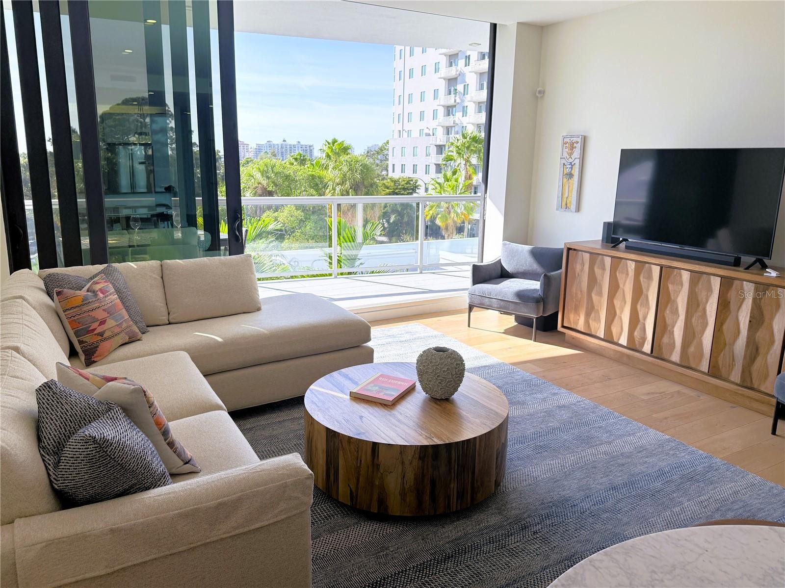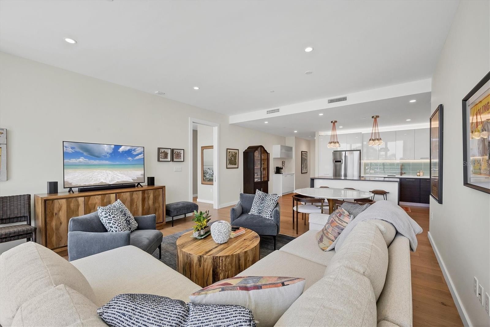 Discover refined downtown living at Sansara, where modern design meets serene, resort-inspired luxury in the heart of Sarasota’s most walkable district. Just steps from the boutiques and cafes of Burns Court and minutes to the waterfront, Residence 302 offers an elevated retreat framed by lush greenery, sparkling pool views, and the soft glow of Sarasota’s city lights. Inside, nearly 2,300 square feet of thoughtfully curated living space unfolds with effortless elegance. Floor-to-ceiling glass filters natural light across wide-plank flooring, custom cabinetry, designer lighting, and motorized shades. The gourmet kitchen blends style and function with European soft-close cabinetry, quartz surfaces, a wine refrigerator, and premium Bosch appliances—an ideal backdrop for intimate dinners or laid-back evenings with friends. A spacious great room opens to a private terrace, inviting you to enjoy quiet morning coffee or sunset breezes above the pool deck. The split layout offers three bedrooms and three baths, each designed for comfort and privacy. The primary suite features a generous custom closet and spa-like bath with dual vanities and a walk-in shower. Two guest suites—one ideally suited as a den or office—provide flexibility for hosting or working from home. Outside your door, Sansara’s boutique amenities create a resort-worthy lifestyle: a heated saltwater pool and spa, cabanas, firepit lounge, outdoor kitchen and grill, plus a well-appointed fitness center—all secured within a private, gated setting. Some furnishings in Residence 302 are available for purchase, allowing you to move in with ease—or begin with a blank canvas and craft your bespoke dream home within one of downtown Sarasota’s most coveted boutique buildings. Experience the rare blend of sophistication, privacy, and walkability that defines life at Sansara. Welcome home to 300 S Pineapple Avenue, Residence 302.