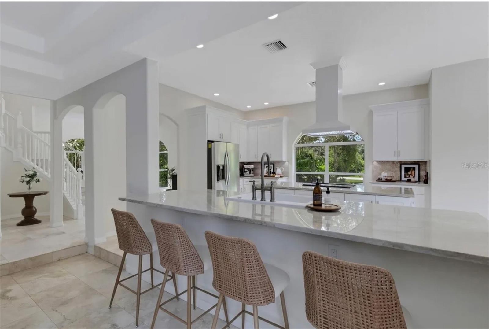 Experience the epitome of luxury with this stunning home that defines coastal elegance. Nestled on a quiet island street, this Florida Coastal masterpiece is set on a large 12,805 square foot lot with 75 ft of private lakefront overlooking the serene waters of Lake Norma, on our famed Siesta Key. Renovated with meticulous attention to detail, this newly updated home features an expansive, light-filled open floor plan with continuous quartzite countertops throughout. It includes two primary suites, one of which flows into its own private kitchenette overlooking the tranquil waterfront. Two lanais and a custom built hot tub and pool complete with a waterfall and color-changing lighting system ensure seamless indoor-outdoor living. Quality and craftsmanship are paramount, and every detail has been thoughtfully considered to ensure superior structural integrity, including the hurricane impact windows and elevated AC condensers. A new roof was installed in 2024, along with new mechanicals, electrical, plumbing, pool surfacing, appliances, and more. This gorgeous island paradise has been fully renovated to both preserve and highlight its architectural elegance. A prime location, this property is ideally situated minutes to the world-famous powdery sands of Siesta Key Beach, less than a mile from charming Siesta Key Village, and near the prestigious Out-of-Door Academy. A quick 5-minute drive over the North Bridge takes you to Sarasota proper and a mere 10 minutes more to the heart of dazzling downtown Sarasota and St. Armands Circle, where you can enjoy a wide selection of fine dining, shopping, and world-class cultural arts and nightlife, making it the ideal home for those seeking the ultimate Florida lifestyle. Schedule your private showing today. Plans and permits for an attached 2 car garage included.