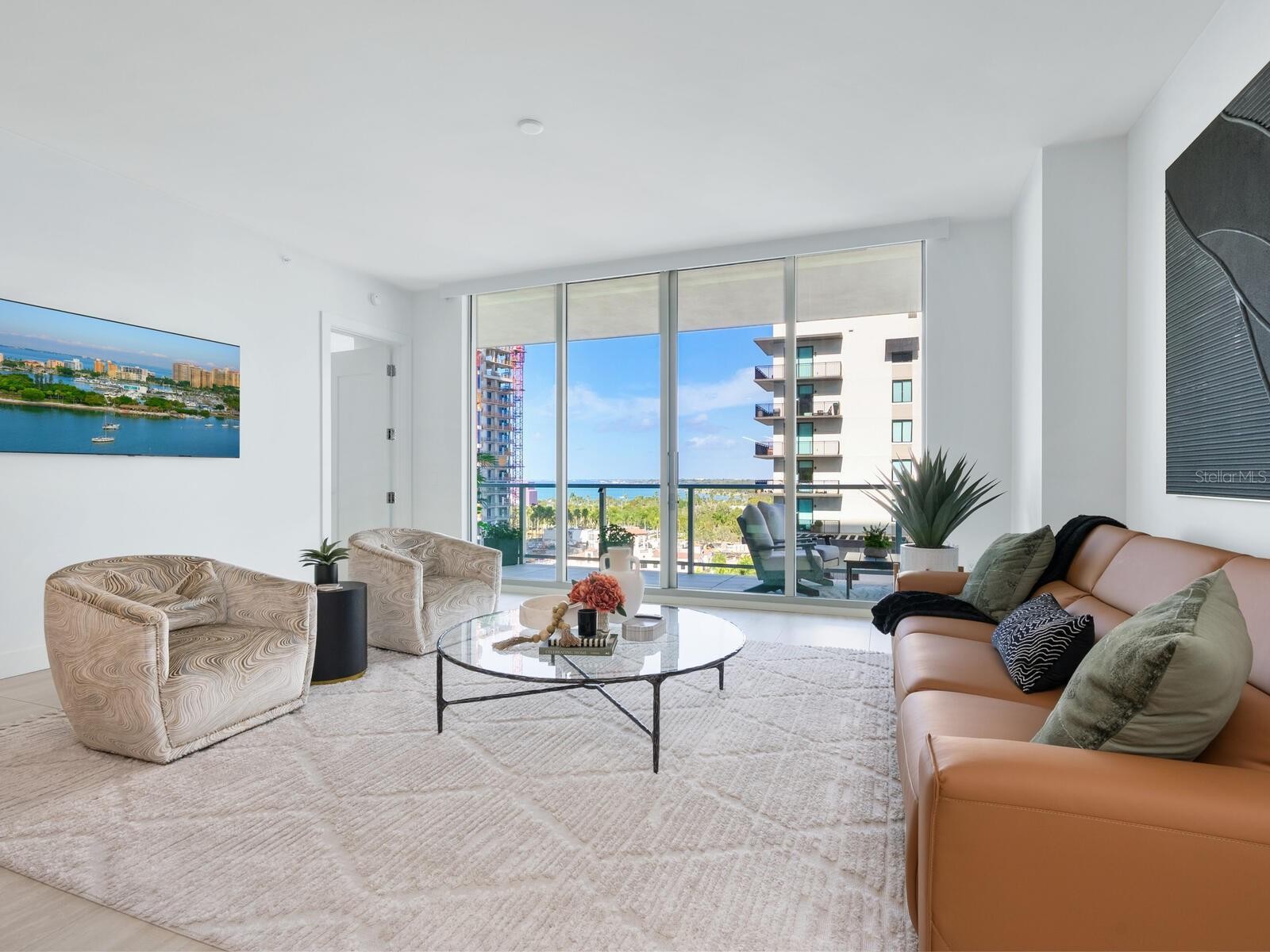 Experience contemporary coastal living in this modern residence at BAYSO, located in downtown Sarasota within the Quay Waterfront District. This 2-bedroom, 3-bath condominium offers 1,678 square feet of open-concept living space, with floor-to-ceiling windows capturing views of Sarasota Bay and the city skyline. Interior features include contemporary finishes throughout, including a new Bosch refrigerator with integrated wine drawer, custom backsplash, and modern cabinetry in the kitchen, providing both functionality and clean design. The owner’s suite includes a custom California Closets system designed to enhance storage and organization. A spacious private balcony extends the living area outdoors, suitable for relaxing or entertaining. BAYSO offers resident access to a range of amenities, including a resort-style pool, fitness center, and multiple indoor and outdoor common spaces, and is a pet-friendly community with a designated dog park area designed for both play and pet relief. Situated in downtown Sarasota, the residence provides convenient access to dining, shopping, and cultural venues such as the Van Wezel Performing Arts Hall, Florida Studio Theatre, and the Sarasota Opera House. The property is also adjacent to the city’s bayfront area and marina, which is undergoing redevelopment. Two assigned parking spaces in a secure garage are included with the residence. Furnishings are available separately.