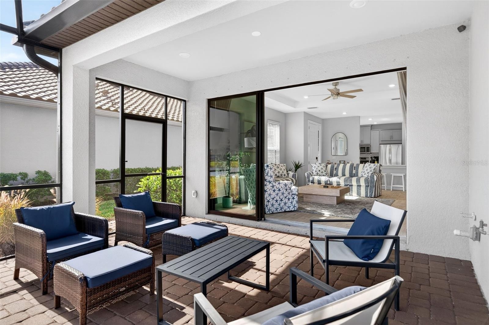 Experience effortless Florida living at 3021 Veneto Ct, a GOLF DEEDED, move-in-ready residence set on a peaceful lakefront homesite within the sought-after Esplanade at Azario. Positioned near the end of a quiet cul-de-sac, this home offers a serene setting where water views, open skies, and low-maintenance living create a true sense of escape. Designed for both comfort and convenience, the home welcomes you with an elongated driveway and garage extension, enhanced by epoxy-coated garage flooring for durability and a polished finish. Both the driveway and lanai have been professionally sealed, adding long-term protection and a clean, well-maintained appearance. Best of all, this is a maintenance-free, resort-style community, where lawn care and exterior maintenance are handled for you—allowing more time to enjoy the lifestyle you moved here for. Inside, light-filled living spaces showcase neutral tile flooring throughout the main areas, tray ceilings, recessed lighting, and a soft, coastal-inspired color palette. The open-concept design flows effortlessly, making everyday living and entertaining feel seamless. The kitchen is both stylish and functional, featuring quartz countertops, stainless steel appliances, ample cabinetry, and a timeless tile backsplash, all overlooking the dining and living areas. Sliding glass doors open to an extended screened-in lanai, where tranquil lake views create a private outdoor retreat. The outdoor living space is pre-plumbed for an outdoor kitchen, offering endless possibilities for alfresco dining, sunset gatherings, or quiet mornings overlooking the water. The split-bedroom layout provides privacy and versatility. The primary suite is a peaceful sanctuary with tray ceiling detail, abundant natural light, plush carpeting, and a spa-inspired ensuite with dual vanities, a walk-in shower, and a generous walk-in closet. A guest bedroom, full bath, and flexible den offer space for visitors, a home office, or a cozy media or reading room. A thoughtfully designed laundry room with custom cabinetry and utility sink adds everyday practicality. Life at Esplanade at Azario extends well beyond your front door. Residents enjoy championship golf, a resort-style pool, full-service spa, fitness and yoga studios, pickleball and tennis courts, and a vibrant social calendar. Dining experiences, wine tastings, cooking classes, and a casual on-site pizzeria complete the resort atmosphere—all set within the heart of Lakewood Ranch. This is more than a home—it’s a lock-and-leave lifestyle designed for relaxation, connection, and enjoying every moment of coastal Florida living.