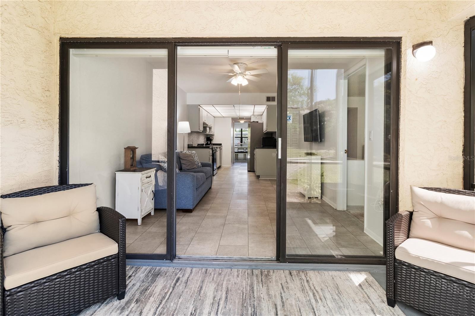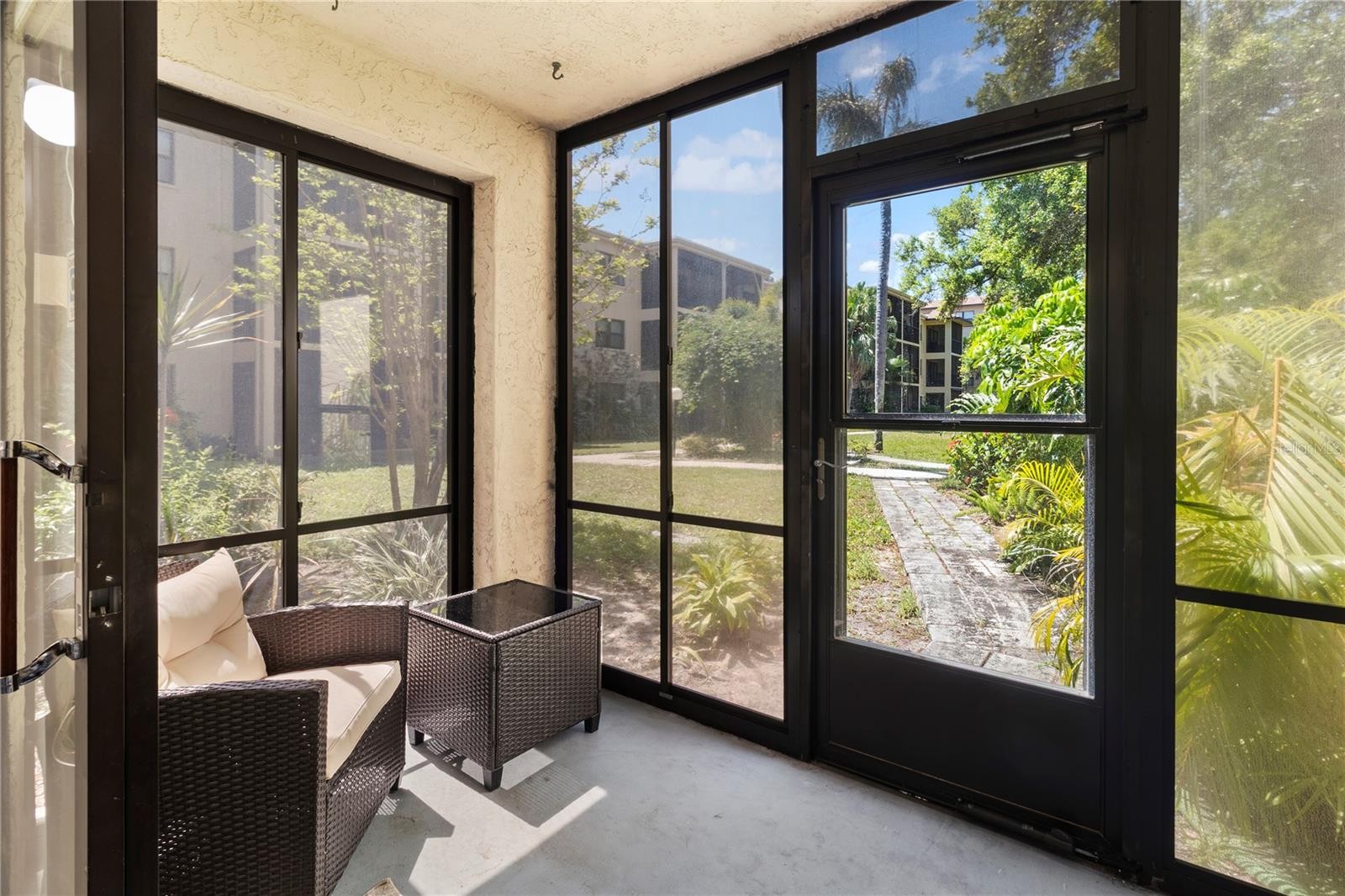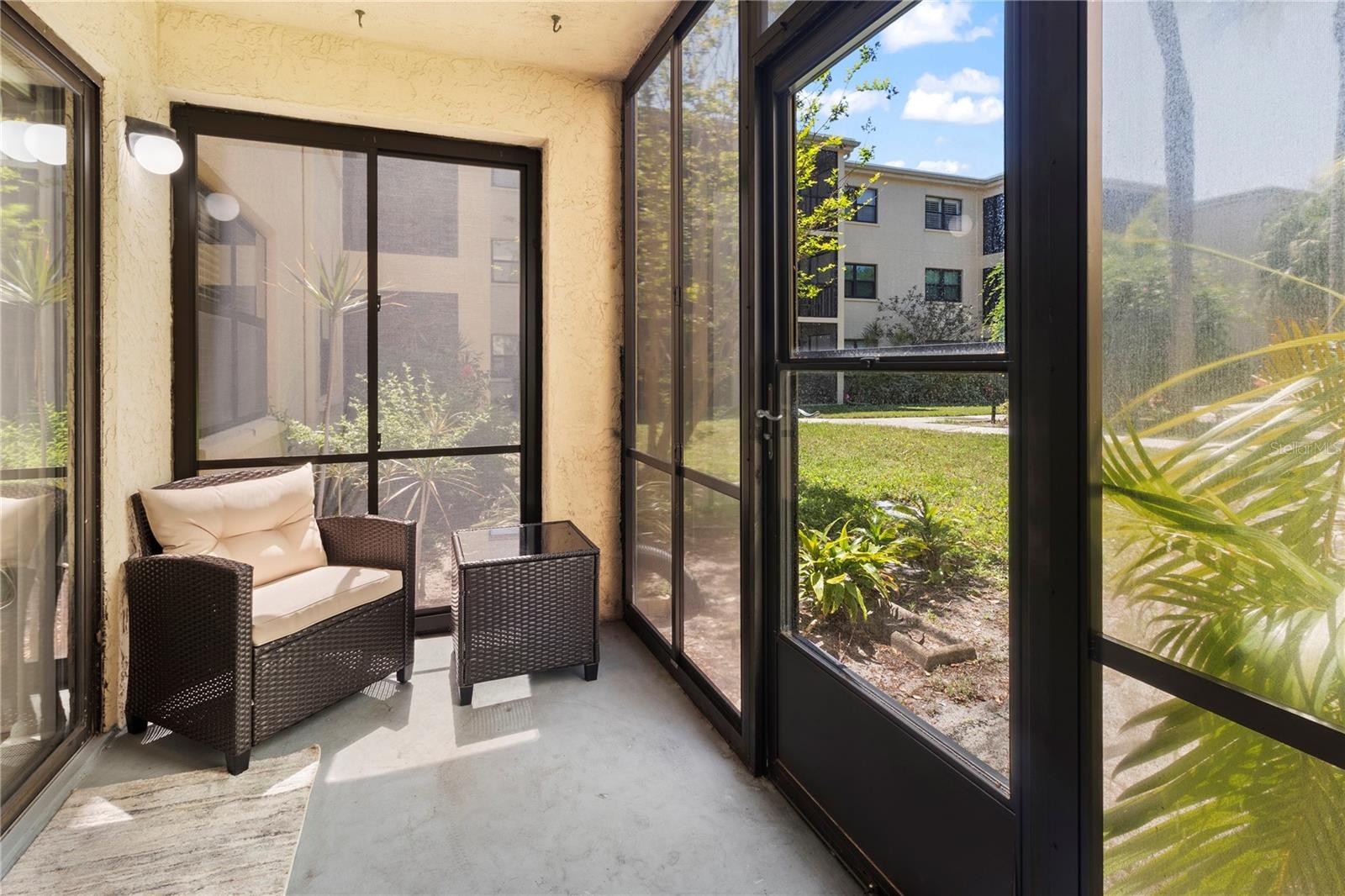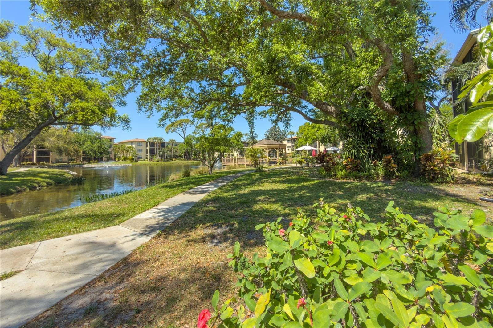 Welcome to easy Florida living in the heart of Bradenton at the gated Desoto Square Villas. Perfectly situated right across from the former Desoto Square Mall and conveniently next to shopping and doctors offices. This beautifully refreshed one-bedroom, one-and-a-half-bath condo offers a secure and affordable lifestyle. This turnkey furnished home is move-in ready and features a brand-new roof for added peace of mind. Spanning 924 square feet, the interior feels exceptionally light and bright with a thoughtful layout. A unique highlight is the custom bed, and barely used couches with comfortable layout beds and automatic blinds that adds the perfect touch. The open kitchen and dining area flow effortlessly toward your private patio, providing a tranquil sanctuary where you can enjoy peaceful views of lush gardens with a pond just around the corner, including a beautiful fountain, and plenty of seating for relaxing. Practicality meets comfort with smart storage solutions found throughout, including two linen closets, a kitchen pantry, and a private exterior storage for your beach gear or seasonal items. Your dedicated parking space is located right outside your door, making grocery trips a breeze. Life at Desoto Square Villas is designed for a true lock-and-leave experience, or stay and enjoy, with low-maintenance fees that include cable, internet, pest control, and all exterior care. Residents enjoy a wealth of resort-style amenities, including a heated pool, clubhouse, fitness center, tennis, and shuffleboard. Whether you are looking for a seasonal retreat or a permanent home, this condo blends modern convenience with the very best of the Sunshine State.