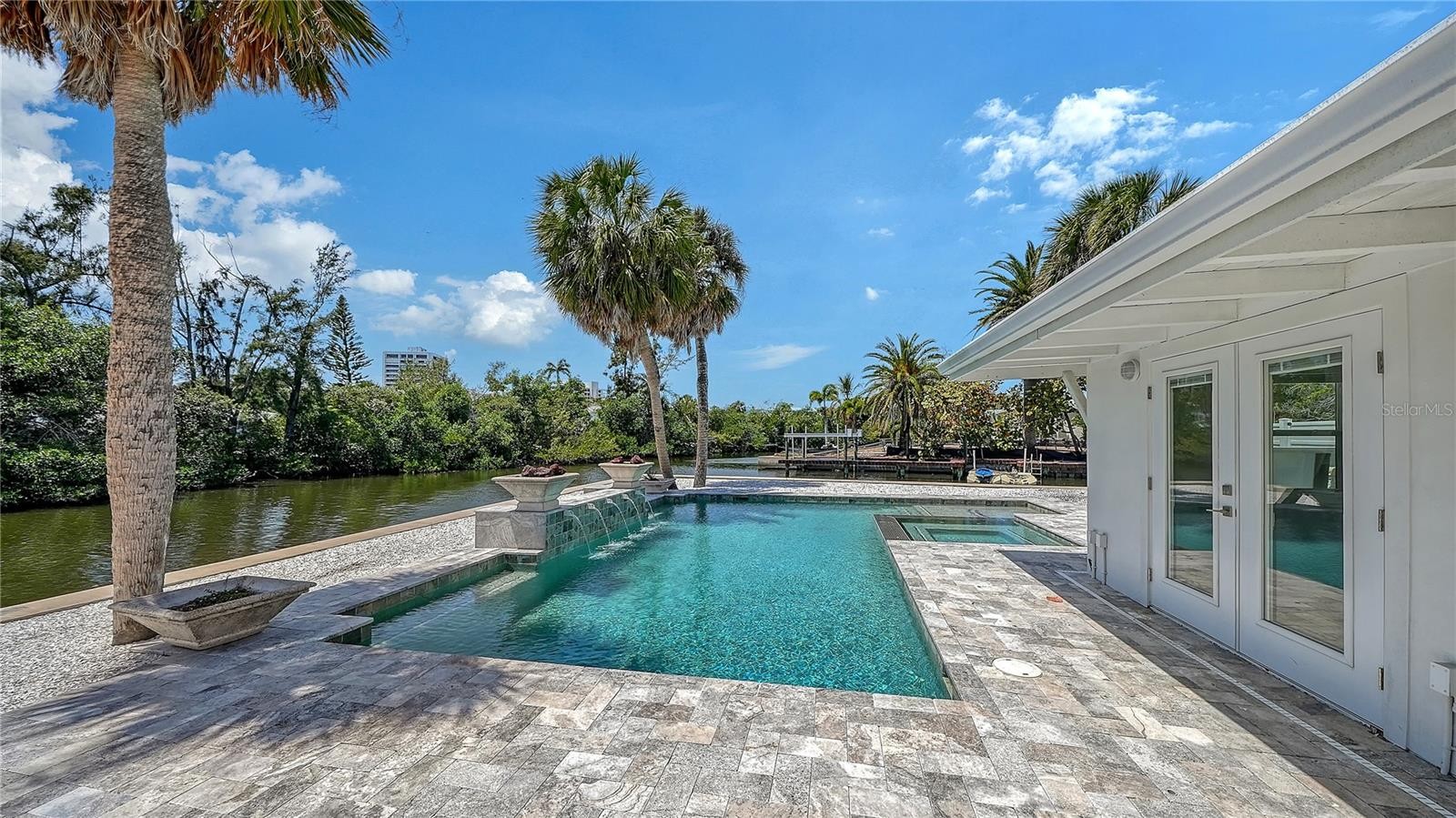 A truly rare offering, this waterfront residence is uniquely positioned with 133 feet of water frontage on two sides, creating an unparalleled sense of privacy and serenity. Nestled on prestigious Palm Island, in the heart of Siesta Key, this property embodies the ultimate coastal lifestyle. This spacious four-bedroom, three-bathroom home is thoughtfully designed, featuring two en-suite bedrooms alongside two additional generously sized guest rooms. Expansive windows invite in natural light while framing tranquil water views throughout the home. Boating enthusiasts will appreciate the private dock and boat lift at the rear of the property, with additional capacity to add a second dock and lift along the side canal—an extraordinary advantage rarely found. Ideally located, the home offers effortless access to world-renowned Siesta Key Beach and the vibrant Siesta Key Village, placing dining, shopping, and entertainment just a leisurely stroll away. Recently renovated, the residence showcases a large resort-style pool with spa, low-maintenance tropical landscaping, and updated finishes including new appliances, cabinetry, and more—creating a move-in-ready retreat. The peaceful wrap around canal provides a private sanctuary where nature and waterfront living converge. Set on an expansive ~14,000 square foot lot, this property is also offered at a compelling value at just above land pricing, presenting a remarkable opportunity for a custom luxury estate. Building plans are available and this lot is build to suit.