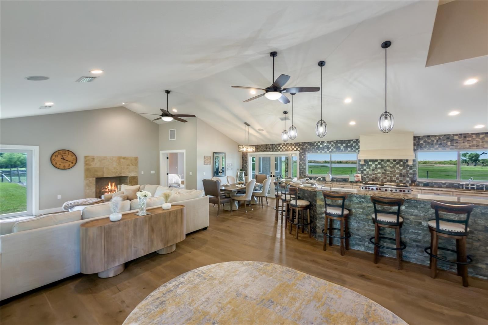 Welcome to an extraordinary private estate set on 80 pristine acres in the heart of Myakka City, just moments from the exclusive Soleta Golf Club. Framed by a grand canopy of mature oak trees, this custom-built residence offers a rare blend of refined luxury and serene countryside living. Spanning an impressive footprint, the home features five generously appointed bedrooms and six elegant bathrooms, thoughtfully designed for both elevated comfort and effortless entertaining. The primary suite serves as a true retreat, complete with a spa-inspired ensuite showcasing dual vanities, separate water closets, and expansive dual walk-in closets. A dedicated media lounge—ideal as a private theatre, game room, or fitness studio—enhances the home’s lifestyle appeal. Crafted with enduring block construction and crowned by a sophisticated metal roof, the residence exudes both timeless beauty and lasting quality. At the heart of the home, the gourmet kitchen is a chef’s showpiece, featuring granite surfaces, an oversized island with dual sinks, a farmhouse apron sink, and a professional-grade six-burner Wolf gas range with griddle and hood. The open-concept design flows seamlessly into the dining and living spaces, where engineered hardwood floors and a gas fireplace with designer tile surround create an inviting yet upscale ambiance. Outdoors, a resort-style oasis awaits. The striking 50' x 24' custom pool is perfectly positioned to capture sweeping views of the surrounding landscape and is complemented by integrated outdoor audio and a gas connection for al fresco entertaining. Beyond, the estate reveals a picturesque four-acre pond and a private 300-yard shooting range, offering a unique blend of recreation and tranquility. Designed with versatility in mind, each bedroom enjoys its own ensuite bath and ceiling fan for ultimate privacy. The property also includes a private interior studio apartment, as well as a full guest residence above the garage—complete with its own kitchen, living area, and a newly upgraded Trex deck overlooking the pool. With no deed restrictions or HOA, this exceptional property offers complete freedom to embrace a luxury rural lifestyle, whether accommodating livestock or simply enjoying the expansive grounds. A gated entrance ensures both privacy and security, while convenient access to Interstate 75 and Lakewood Ranch places world-class amenities within easy reach. This is more than a home—it’s a legacy estate where elegance, space, and lifestyle converge.