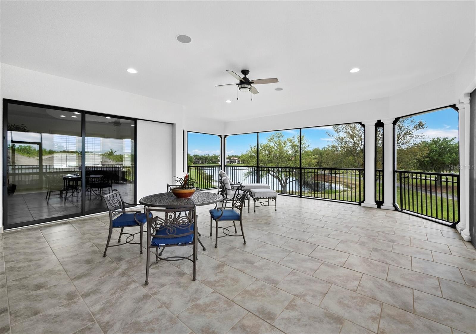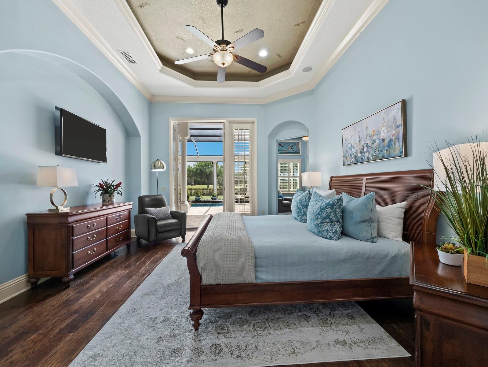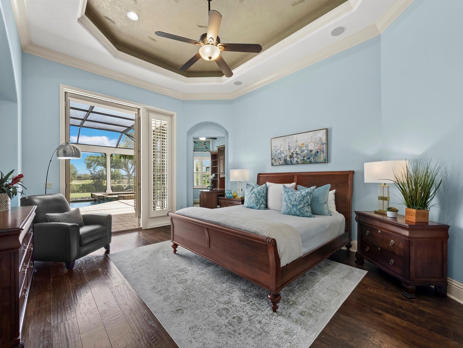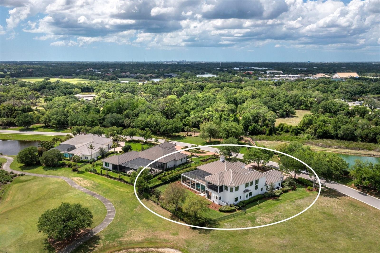 Set along the 11th green within the private, guard-gated Founders Club, this custom residence by John Cannon Homes captures sweeping golf course, lake, and preserve views across a beautifully positioned 0.69-acre homesite. Spanning over 5,700 square feet, the two-level design is both elegant and highly livable, with soaring ceilings, detailed millwork and a natural flow that supports both everyday comfort and large-scale entertaining. A gracious foyer introduces formal living and dining spaces, while the heart of the home opens to a spacious family room and chef’s kitchen featuring premium appliances, a Wolf gas cooktop, oversized island, walk-in pantry and a sunlit breakfast area framed by aquarium glass overlooking the water and fairways. Walls of French doors create a seamless transition to the expansive screened lanai, where the pool and spa, outdoor kitchen and covered living areas are surrounded by tranquil views, an ideal setting for quiet mornings or evening gatherings. The primary suite is thoughtfully designed as a private retreat, complete with a sitting area, custom office, dual boutique-style closets and a spa-inspired bath with hydrotherapy tub, oversized shower and dual water closets. Two additional guest suites are positioned in a separate wing for privacy. Upstairs, accessible by elevator or stairs, is a generous bonus room with a wet bar, fireplace and a full bath that opens to a terrace with long, open views across the course, easily adaptable as a fourth bedroom or private guest quarters. Additional highlights include a wine cellar, butler’s pantry, travertine and hickory flooring, coffered ceilings, impact-rated openings and a four-car garage. The Founders Club spans 700 acres of preserved natural beauty, offering a refined yet relaxed lifestyle with optional membership to its Robert Trent Jones Jr.-designed championship golf course, clubhouse, dining, fitness center and tennis and pickleball amenities. This home is defined by scale, setting and architectural integrity, positioned within one of Sarasota’s most established private communities.