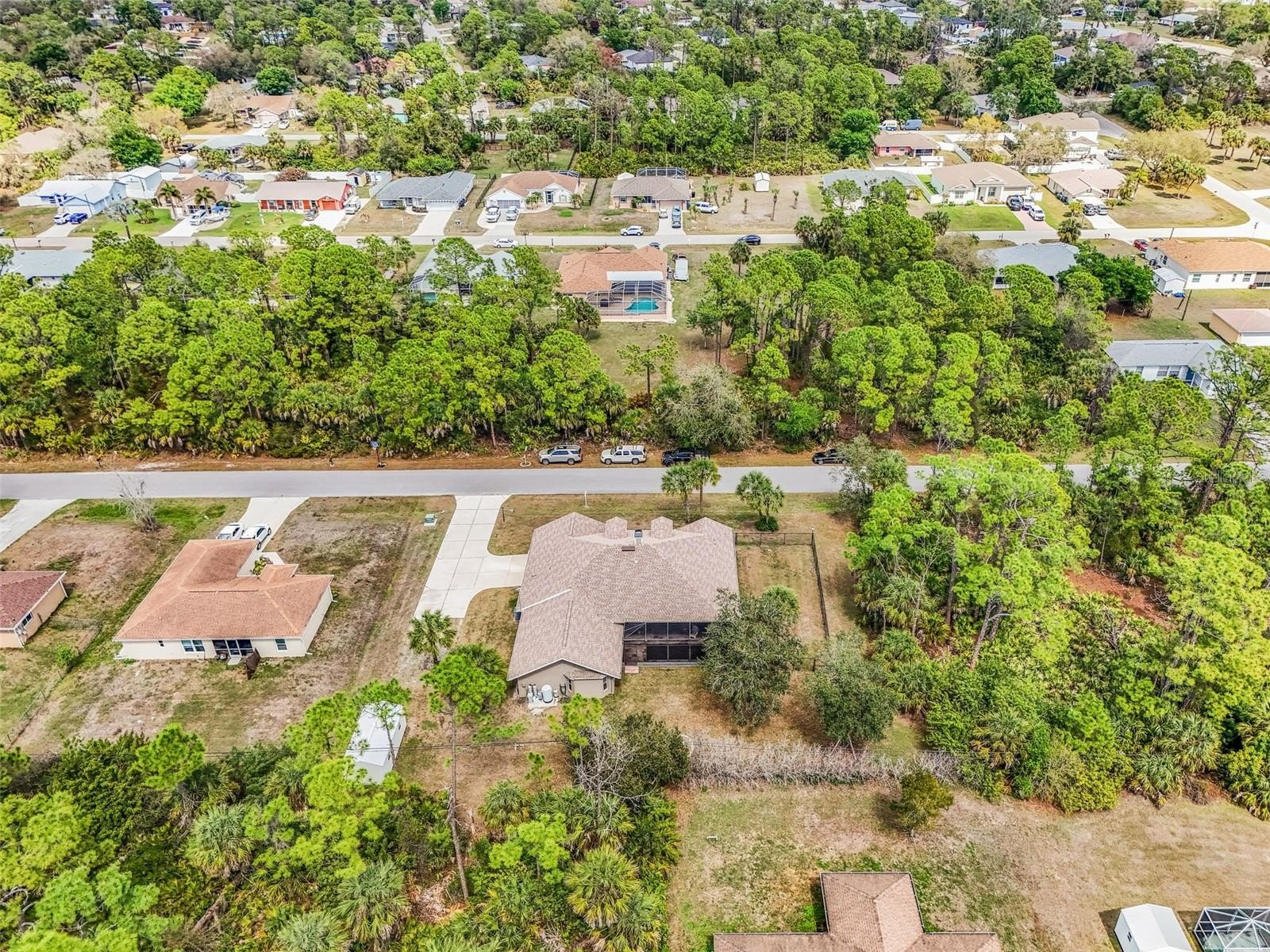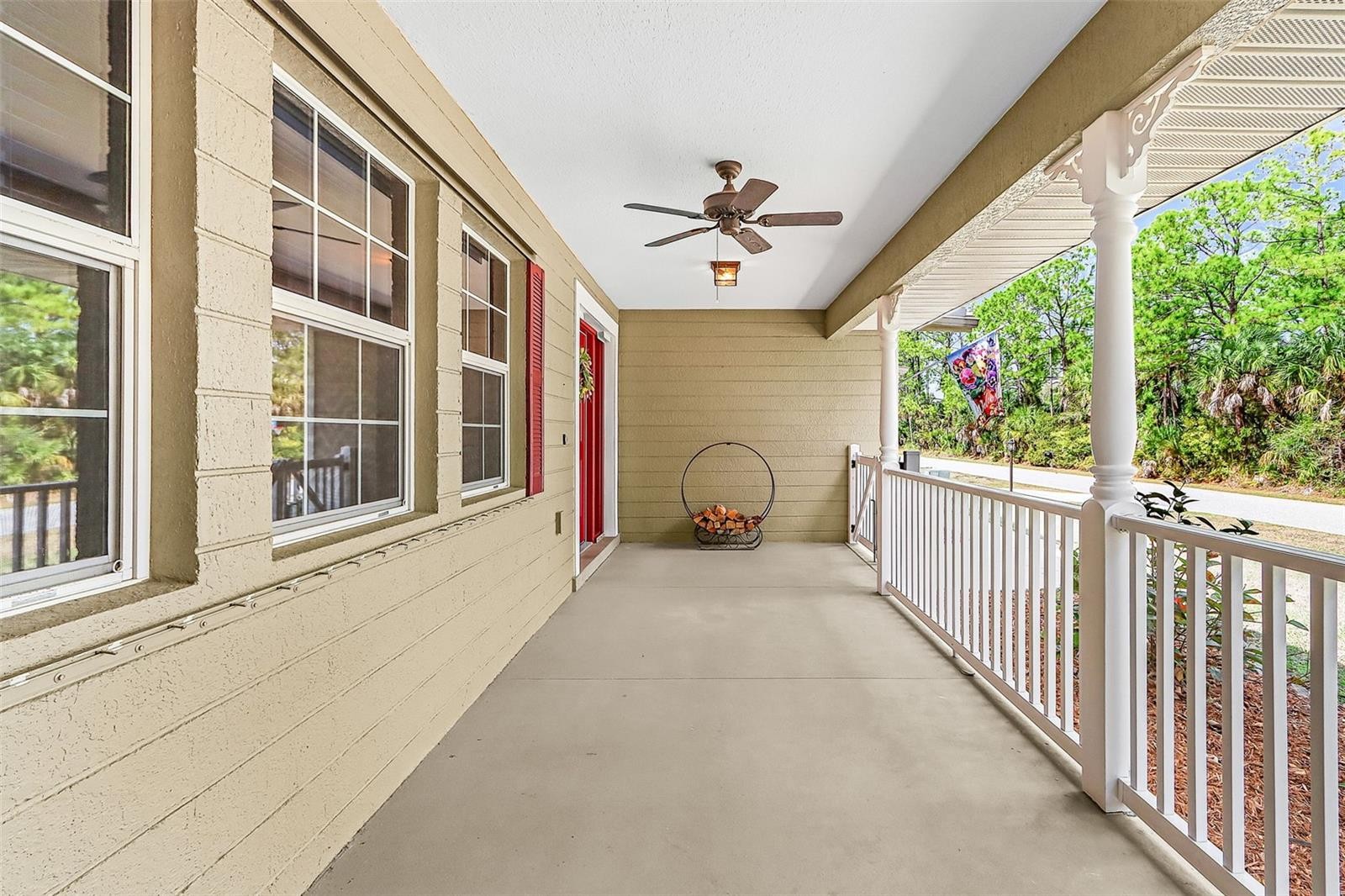 One or more photo(s) has been virtually staged. Imagine yourself enjoying FLORIDA COUNTRY LIVING with space to relax, entertain, and unwind. This exceptional home features a 2023 ROOF, HURRICANE SHUTTERS, NEW GARAGE DOOR, ALL NEW 20x20 SCREENS, and FRESHLY PAINTED PORCH CEILINGS WITH NEW LIGHT FIXTURES. Built for durability with a SOLID CONCRETE HEADER AROUND THE ENTIRE HOME and energy efficiency from R30 INSULATION WITH SILOTEX FOAM BOARDS. Step inside to PORCELAIN TILE AND CORTEC LVT FLOORING, a cozy WOOD-BURNING FIREPLACE UPDATED IN 2023, SURROUND SOUND, and a WHOLE-HOUSE SPEAKER SYSTEM, with TEL/CABLE/TV/INTERNET IN EVERY ROOM. Outdoor living is where this home truly shines—enjoy morning coffee or evening gatherings on the 200 FT FRONT PORCH or host unforgettable get-togethers on the massive 400 FT SCREENED-IN PATIO. The property is also ready for projects and hobbies with 400 FT OF GARAGE DECKING, COMPRESSOR HOOKUP, BACKUP GENERATOR, and a 10x20 SHED WIRED FOR ELECTRIC. Additional highlights include OUTDOOR KITCHEN SPACE WITH HOOKUPS, 60 AMP HOT TUB HOOKUP, NEWER APPLIANCES, and FRENCH DRAINS ON ALL GUTTERS. A rare opportunity to own a home that combines SPACE, STRENGTH, COMFORT, AND TRUE FLORIDA LIFESTYLE LIVING. ***(Some Images have been virtually staged)