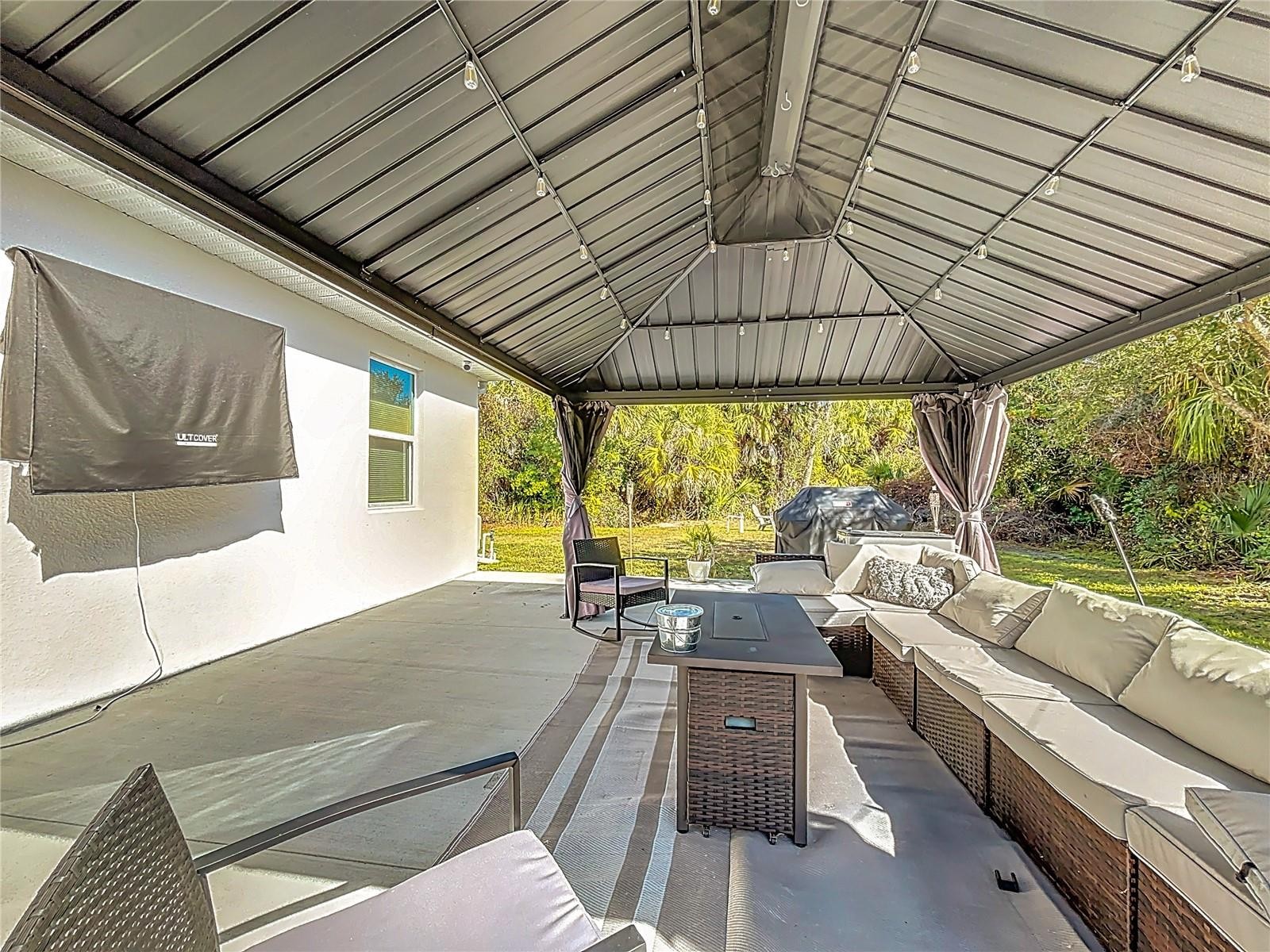 Welcome to this pristine, like-new residence built in 2023 and enhanced with meaningful owner-added upgrades that surpass standard builder specifications. Located in a private North Port neighborhood, this home offers generous space and outstanding flexibility across approximately 2,604 square feet—making it an excellent fit for large families who need room to grow or for those who frequently host multiple guests and extended family members.The open-concept layout creates a smooth flow between the living, dining, and kitchen areas, with the expansive kitchen positioned as the true heart of the home. It features stone grey 42" upper cabinets accented with crown moulding, a large walk-in pantry for ample organized storage, and naturally serves as the central gathering place for meals and everyday interactions.The front elevation impresses with sophisticated Nappanee ledge stone, adding timeless curb appeal and architectural distinction.The split-bedroom design delivers excellent privacy and versatility, featuring four true bedrooms plus a dedicated den/office located off the foyer for quiet work, study, or relaxation. The luxurious primary suite stands out as a private retreat, complete with a spacious walk-in tiled shower and an oversized walk-in closet. Bedrooms two and three are conveniently situated near the kitchen, while the fourth bedroom functions as a private guest suite with its own adjacent full bathroom—ideal for overnight visitors, in-laws, or multi-generational living. Three full bathrooms in total provide comfort and convenience for the entire household.This home is elevated by a collection of premium, owner-installed upgrades, including high-end hardware throughout, an insulated garage door for better energy efficiency, a 50-amp whole-house generator hookup for reliable backup power, high-end ceiling fans, a Nest thermostat for intelligent climate control, whole-house gutters, and a professionally installed irrigation system.The outdoor area is designed for effortless entertaining, featuring a covered lanai that extends indoor living outdoors, a spacious 35x15 concrete pad perfect for gatherings, a 12x16 hard-top gazebo for shaded year-round use, and a high-end 12x24 above-ground pool equipped with in-ground piping, a true pool filter system, and timer for low-maintenance, resort-style enjoyment.Additional features include a welcoming covered front porch that enhances curb appeal and a convenient two-car garage.Move-in ready and thoughtfully upgraded, this exceptional property is perfectly suited for large families or avid hosts who appreciate four bedrooms, a dedicated den, three full baths, and a wide array of practical enhancements. Don’t miss your chance—schedule a private showing today, as homes of this caliber sell quickly!