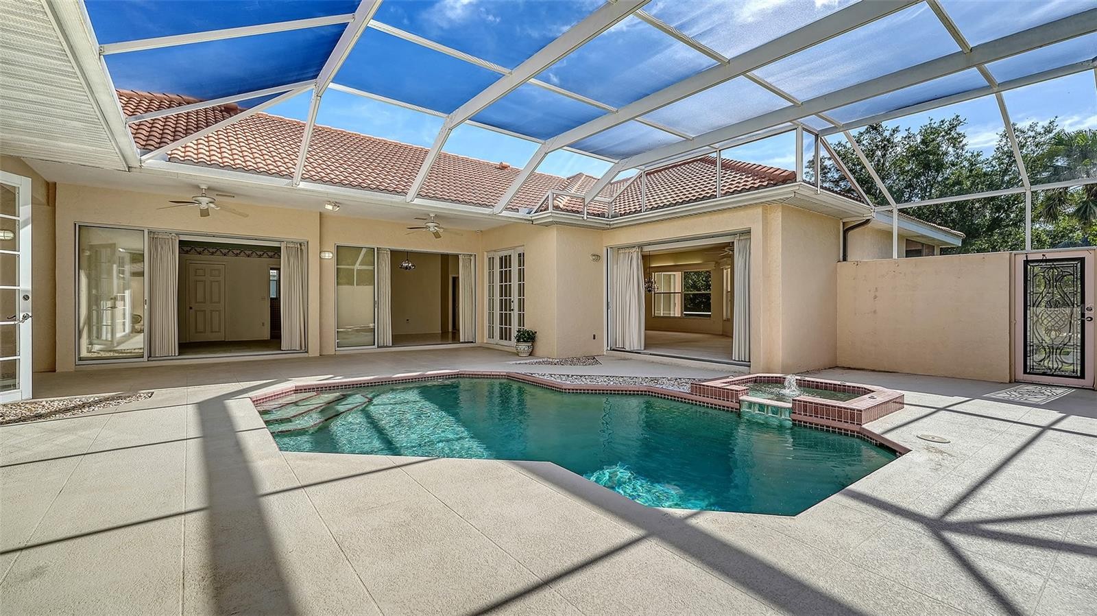 Perfectly positioned on a spacious corner homesite of just over half an acre, this well maintained three-bedroom, three-bath courtyard pool home in Laurel Oak Estates offers the ideal blend of privacy, flexibility, and classic Florida living. Double glass door entry welcomes you into the expansive courtyard, where a sparkling pool and spa create a private outdoor oasis ideal for entertaining or relaxing in the sunshine. The main residence is complemented by a detached one-bedroom one-bath casita - perfect for guests, a home office, or multigenerational living - offering both comfort and independence. Inside, multiple sets of disappearing sliding glass doors seamlessly connect indoor and outdoor spaces, filling the home with natural light thanks to its desirable southeastern exposure. The spacious garage provides ample room for two vehicles plus a golf cart and extra storage space. The mechanical systems and roof have been diligently maintained. With its thoughtful layout, bright and airy feel, and prime location within one of Sarasota's most sought-after gated communities, this home captures the essence of relaxed Florida living. Located within the guard-gated community of Laurel Oak Estates, residents enjoy a well-maintained environment with mature landscaping and optional membership to Laurel Oak Country Club, offering two championship golf courses, tennis, pickleball, dining, and an active social calendar. Conveniently positioned near I-75, the home is just a short drive from Waterside Place, UTC’s shopping and dining district, downtown Sarasota’s cultural amenities, and the Gulf beaches—bringing together privacy, accessibility, and the best of Sarasota living.