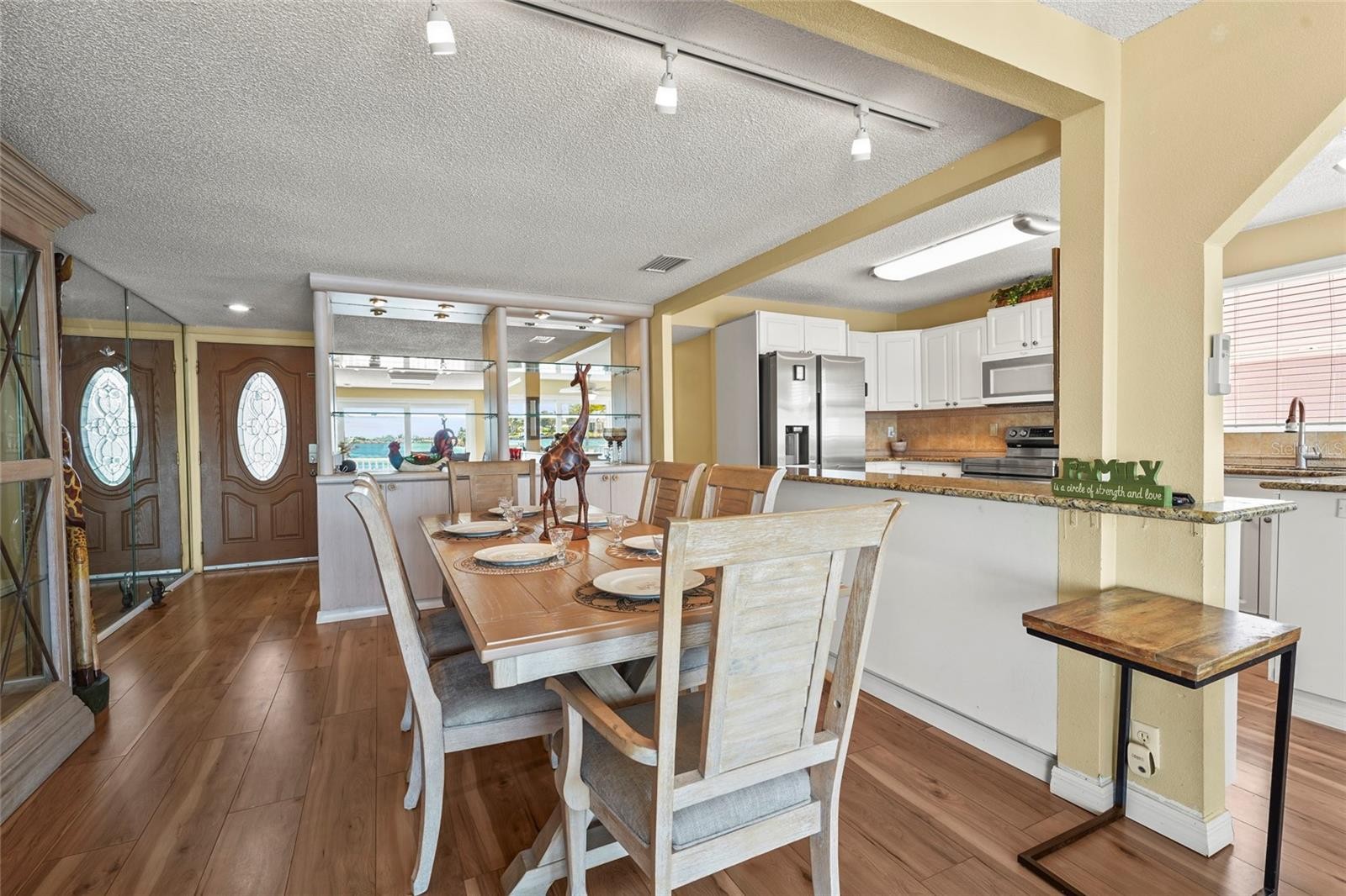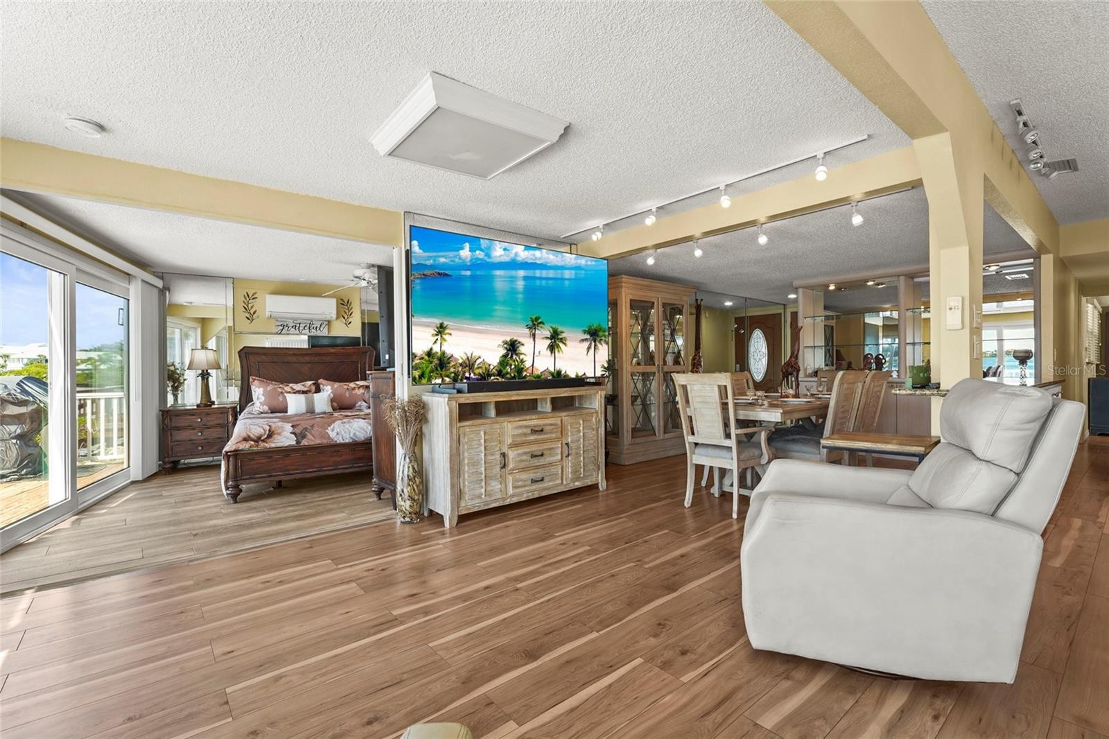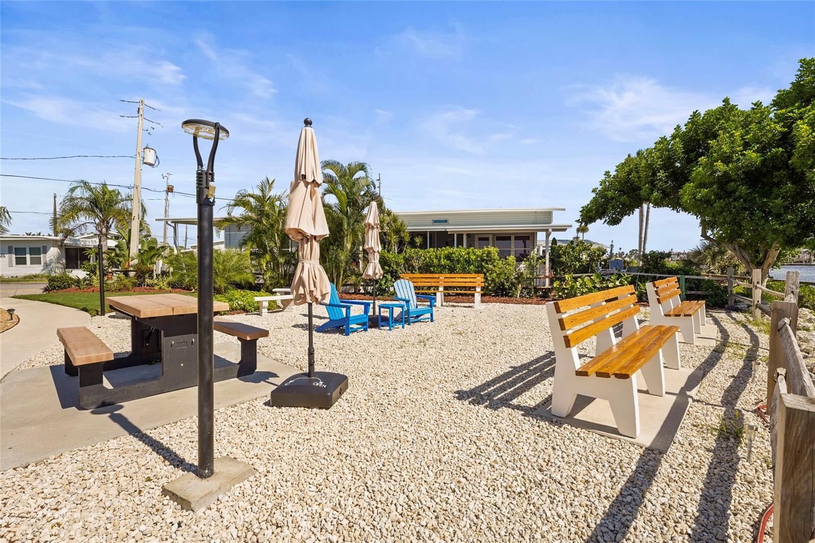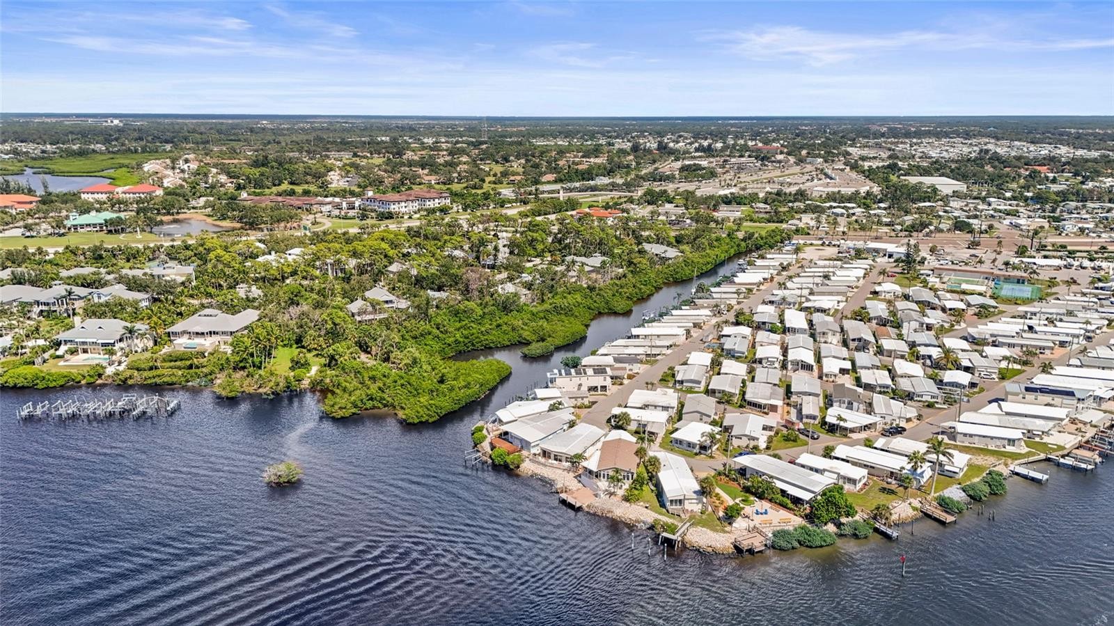 Enjoy stunning panoramic views of Roberts Bay from three hurricane-rated sliding doors. Watch dolphins, manatees, and seabirds from your own backyard! Opportunity to add a boat lift or dock in this sailboat water access and take a 5-minute ride to the Gulf of Mexico — no bridges! This home features a large deck for dining, entertaining, and relaxing while overlooking the bay. Electric retractable Sunbrella awnings provide shade, and the sunsets are nothing short of spectacular. Inside you’ll find 1,400 sq. ft. of open living space, 2 bedrooms, 2 full baths, and brand-new porcelain tile. The kitchen boasts granite countertops, newer appliances, and a great flow into the dining and living room. The guest room doubles as an office with a Murphy bed. The home also includes a full-size laundry room, mirrored walls to reflect water views, and a built-in wet bar. Additional upgrades include newer A/C, track lighting, and a large covered carport with paver driveway, tool/work room, and storage. Located in a vibrant 55+ waterfront community with low HOA fees, resort-style pool, tennis, clubhouse, and daily activities. Move-in ready, meticulously maintained, and perfect for entertaining — watch fireworks from your deck. Enjoy and easy walk across the Venice Bridge and stroll through Downtown Venice Ave. Pets are welcome!