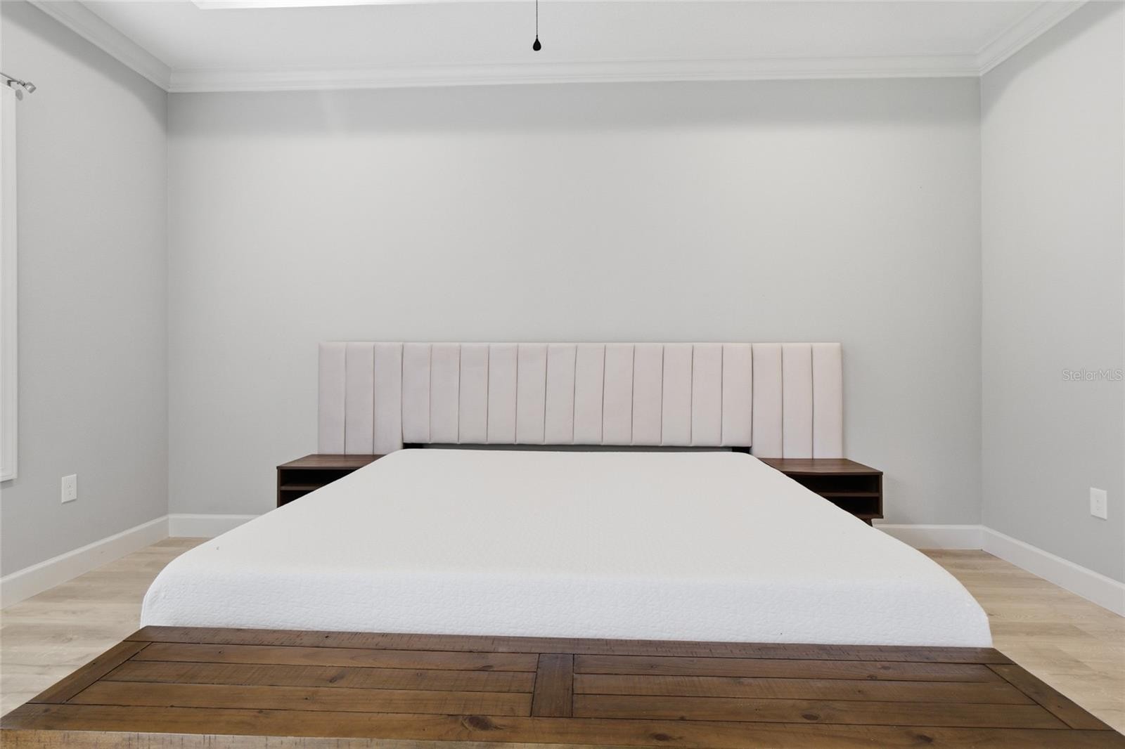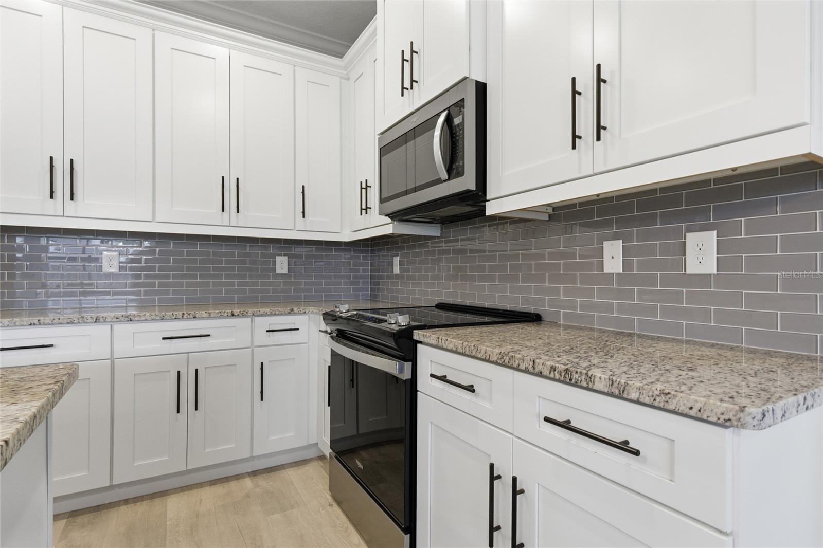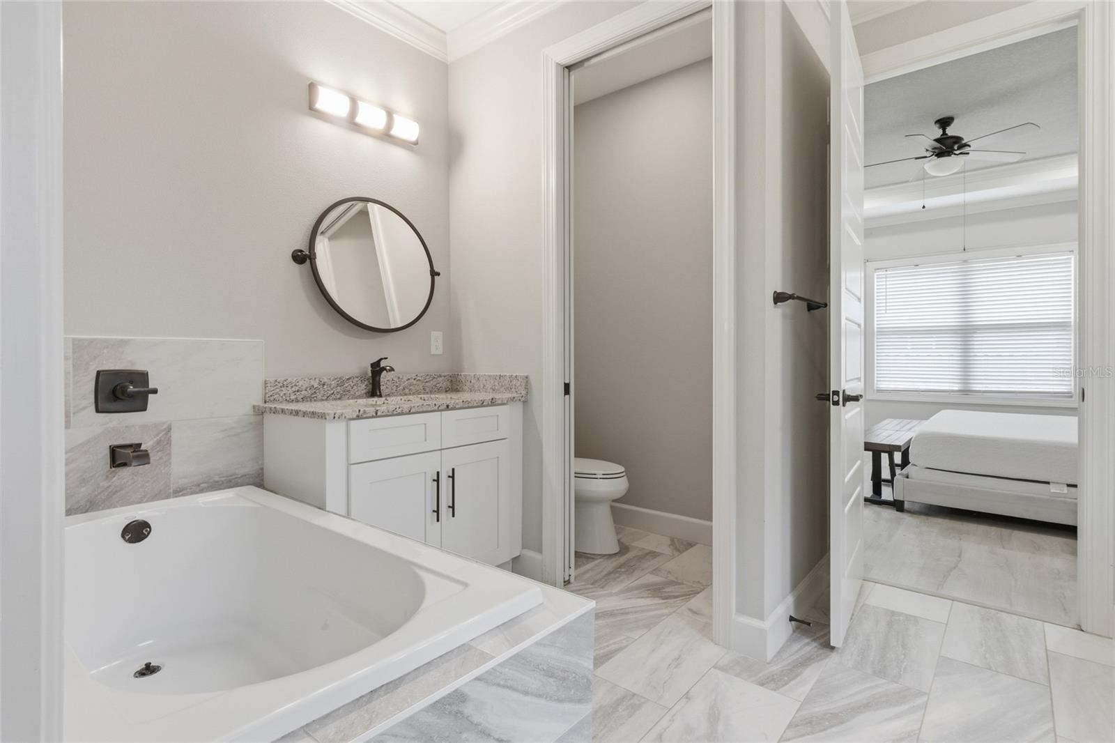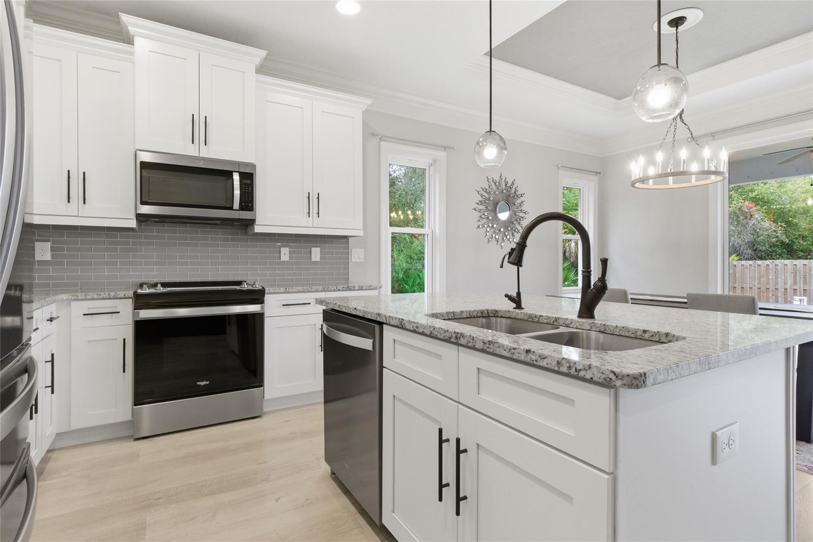 Beautifully built in 2021, this 3-bedroom, 2-bath home offers a spacious and well-designed layout with high ceilings, 8-foot interior doors, and a combination of wood-look laminate flooring in the main living areas and tile flooring in the wet areas. The open living and dining spaces are highlighted by tray ceilings and abundant crown molding, creating a bright, welcoming atmosphere that works well for both everyday living and entertaining. Some furniture is already included, what you see is what you get. The eat-in kitchen is thoughtfully designed with stainless steel appliances, granite countertops, a tile backsplash, and a large center island with breakfast bar seating. Tall cabinetry with crown molding, soft-close doors and drawers, and a generous pantry provide excellent storage and functionality. The adjacent dining area overlooks the backyard, offering a comfortable setting for meals and gatherings. Sliding glass doors from the living area lead to the patio and backyard, extending the living space outdoors. The primary suite serves as a private retreat, featuring tray ceilings, direct patio access, a large walk-in closet, and an ensuite bathroom with custom tilework, dual sink vanities, a soaking tub, and a glass-enclosed walk-in shower. The guest bedrooms are well-sized with ample closet space, and the secondary bathroom also features custom tile with a tub/shower combination. Additional highlights include no HOA, no CDD fees, and the property is not located in a flood zone. Conveniently located with easy access to major roadways, shopping, schools, parks, and local amenities, this well-maintained home offers modern finishes, thoughtful upgrades, and a practical layout in a desirable location.