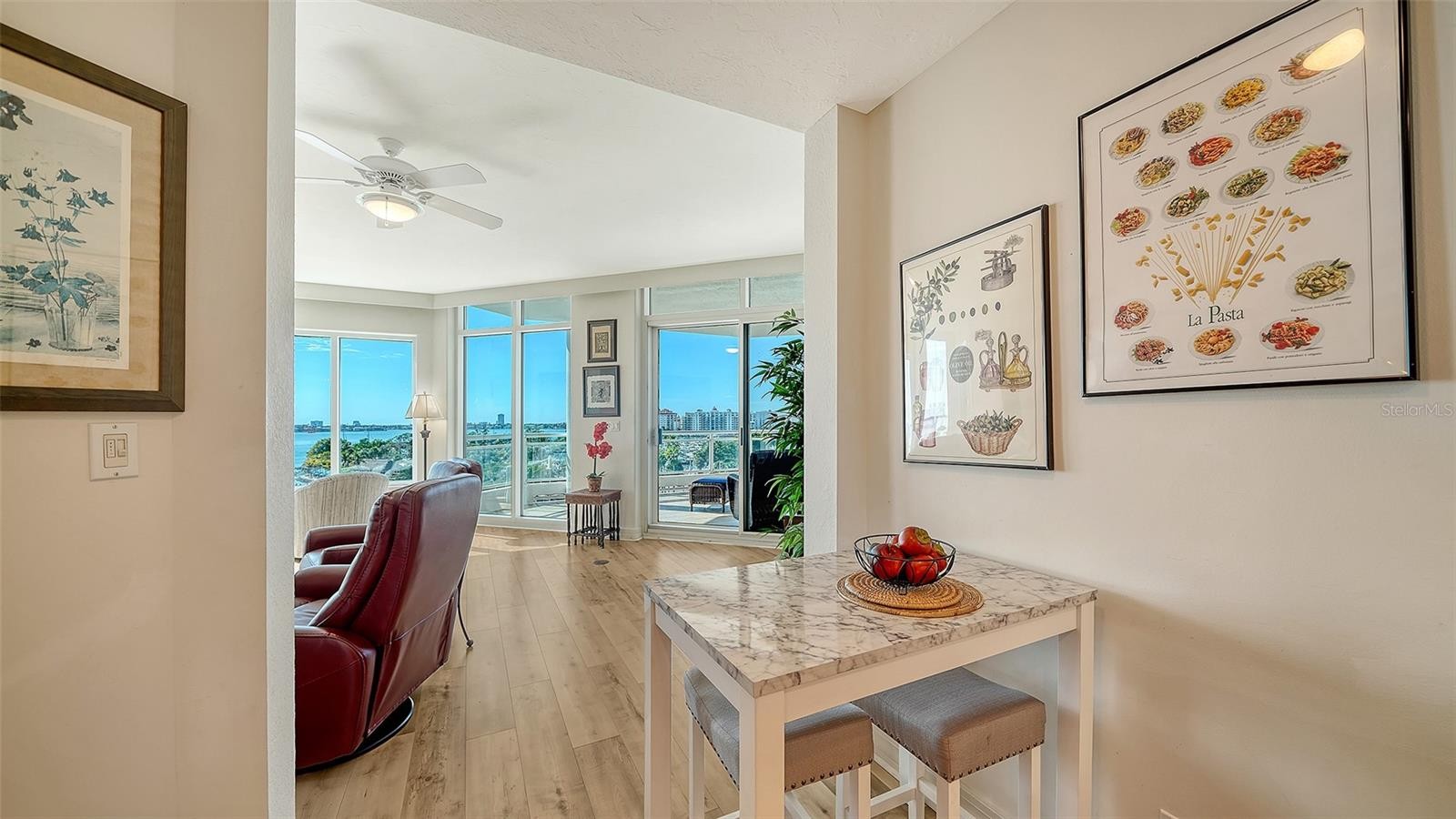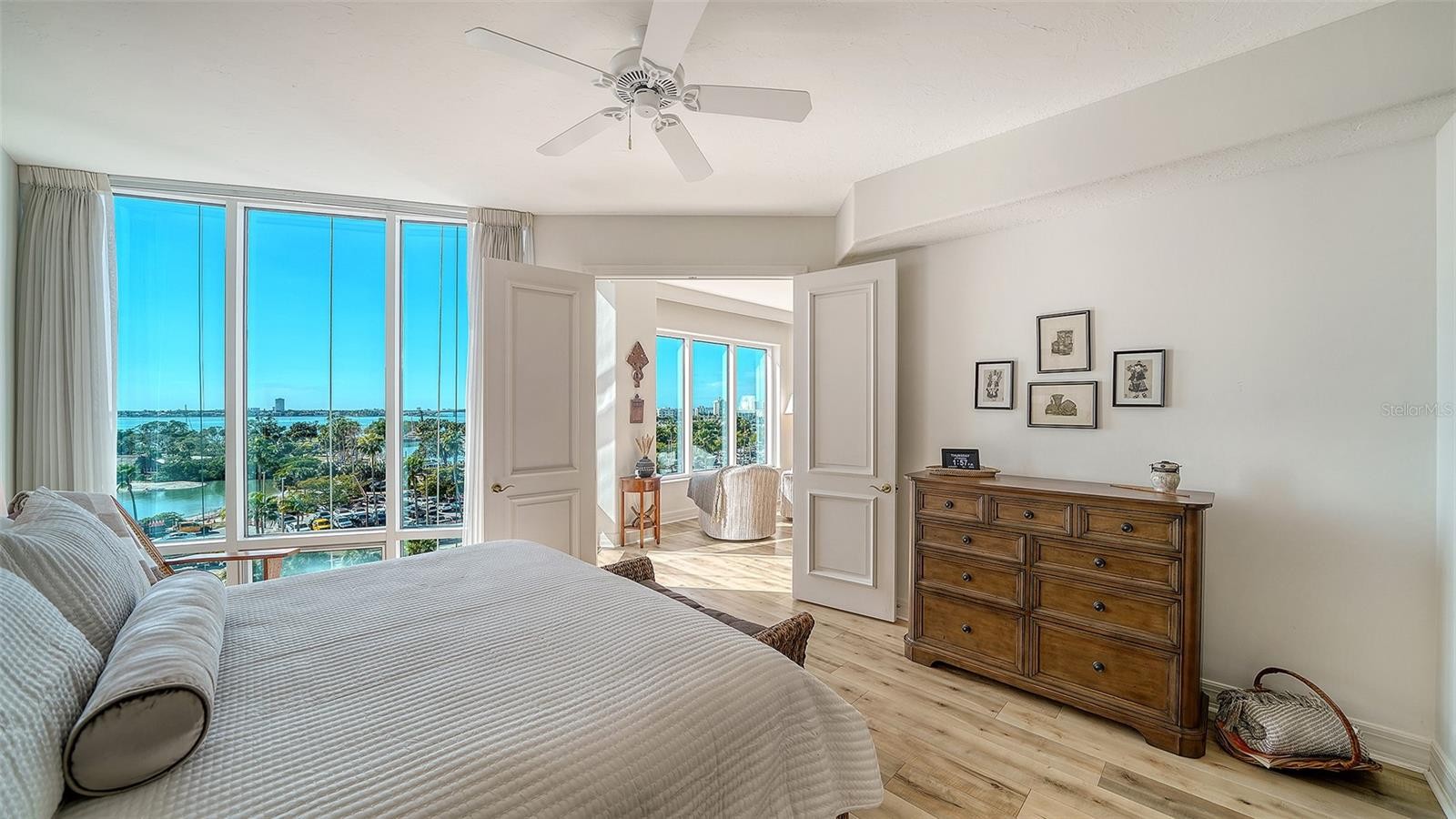 Breathtaking, panoramic views of Sarasota Bay define this residence within Sarabande, one of Sarasota’s most esteemed bayfront addresses. A private elevator shared by just 2 residences opens directly to your residence, creating an impressive and convenient arrival. The interior is light and neutral, featuring solid-core 8' doors, luxury vinyl plank (2023) and tile flooring throughout. New A/C system (2024), water heater (2021), updated kitchen (2023) and remote window shades (2024). A spacious open great room layout is designed to capture sweeping bay views and spectacular sunsets. Floor-to-ceiling windows and two sliding glass doors open to a large private terrace, seamlessly blending indoor and outdoor living. Gracious dining space perfectly proportioned feels both private and intimate. The kitchen features updated cabinetry and hardware, quartzite countertops, glass subway tile backsplash, and an eat-in area. Double doors lead to the primary suite, where floor-to-ceiling windows frame stunning water views. The primary bathroom offers dual vanities and a spacious walk-in shower with floor-to-ceiling tile, built-in bench, and glass enclosure. A secondary bedroom and full bath, along with a versatile den and an interior laundry room, complete the residence. The split-bedroom floor plan provides privacy for owners and guests alike. Two assigned covered and gated parking spaces and a dedicated private storage room are included. Sarabande is a pet-friendly, full-service community offering concierge and security, on-site management, state-of-the-art fitness center, spa amenities, wine cellar, guest suites, renovated clubroom, and two pools, including a heated lap pool and spa. Ideally located just steps from downtown Sarasota’s dining, shopping, cultural venues, art galleries, and Marie Selby Botanical Gardens. This residence presents an exceptional opportunity to enjoy refined bayfront living with a front-row seat to Sarasota’s most unforgettable water views.