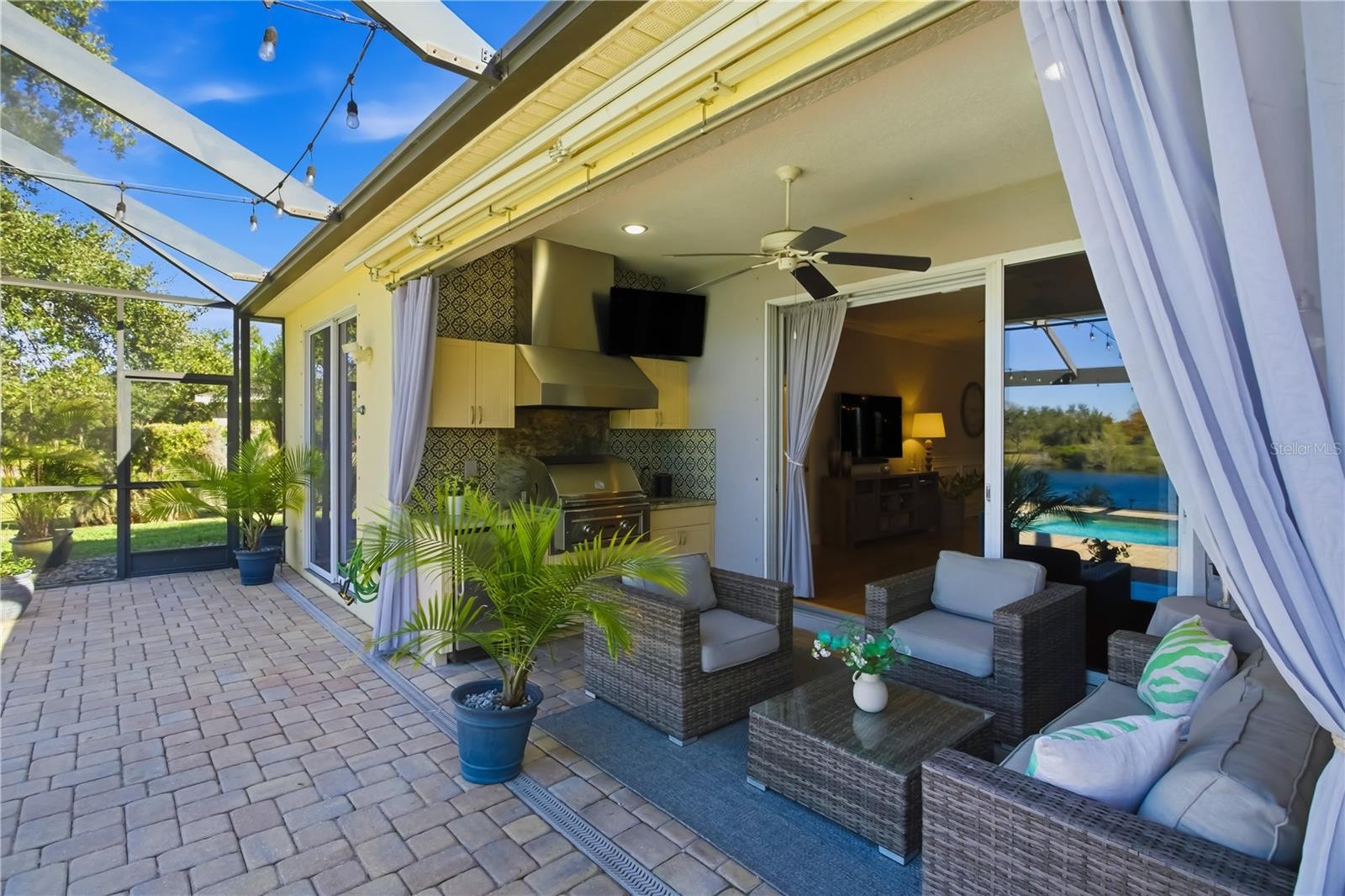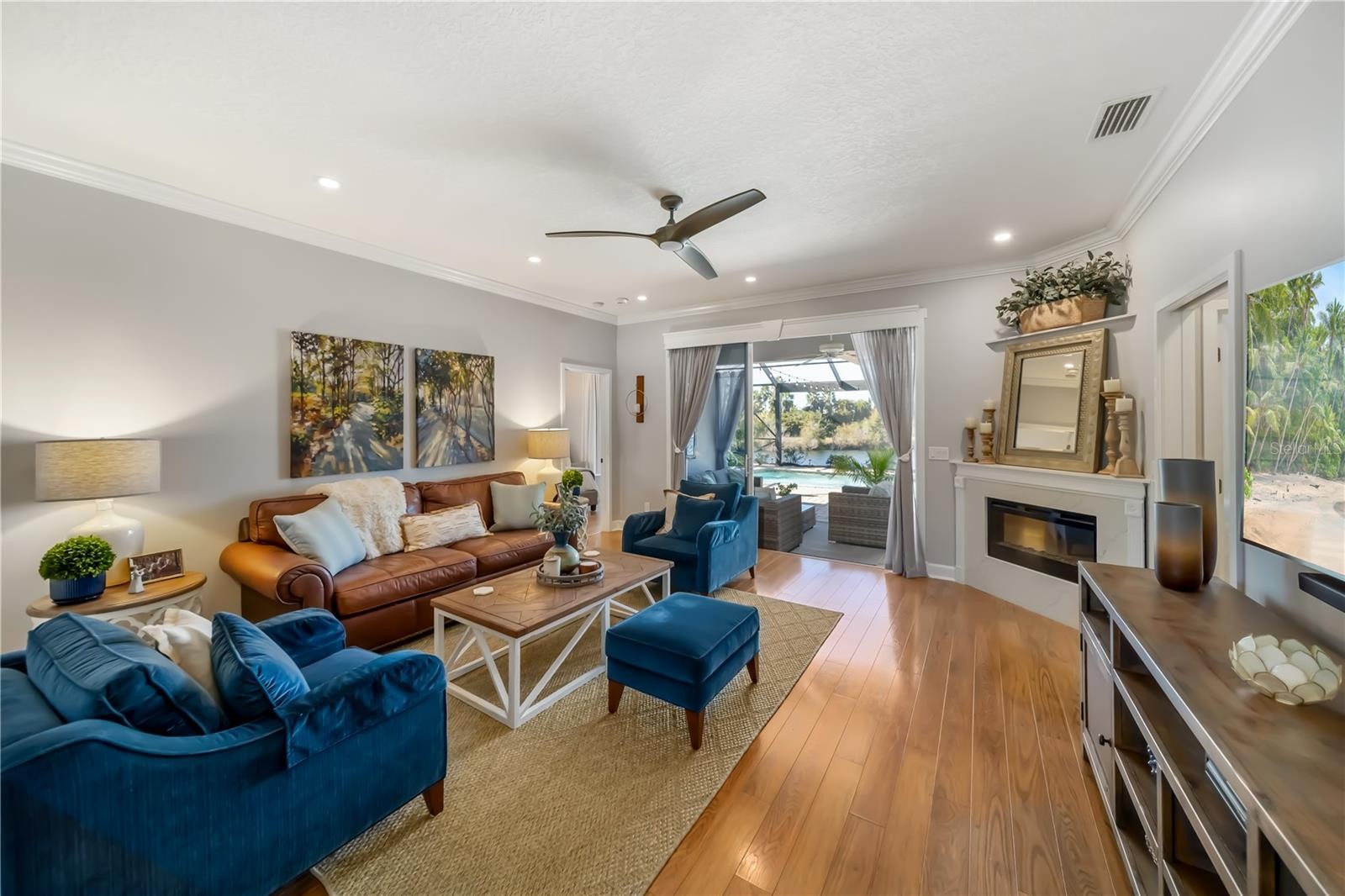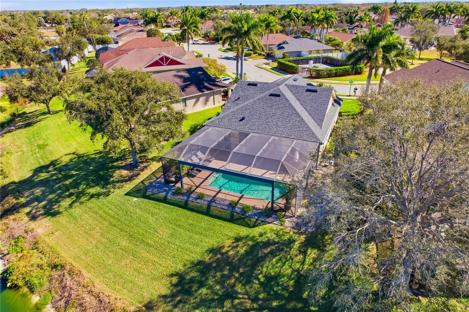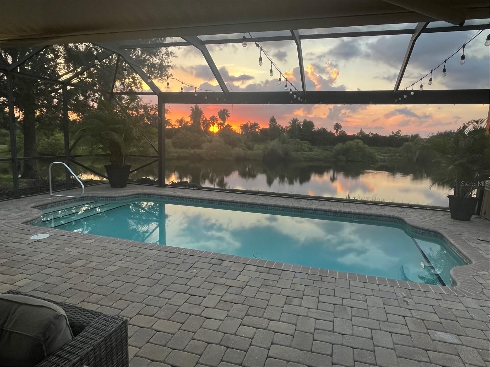 Enjoy PRIVATE Breathtaking Views and Stunning Florida Sunsets Right from Your Backyard in this 3 Bedroom, 2 Full Bath, model-like Home on the Water, with NEW ROOF! NO CDD fees and low HOA dues, this exceptional Lakefront Home offers outstanding value. The expansive lanai features a 28’ x 40’ seamless illusion screen blending indoor and outdoor living, with a heated saltwater pool, covered sitting area with a 10’ x 18’ motorized retractable awning, TV, outdoor kitchen with Lynx BBQ grill, updated burner and briquette tray, refrigerator, vent hood, and sink—perfect for outdoor entertaining! There's also a playground right across from your front door as well! Inside, the beautiful look of hardwood flooring with the convenience and durability of laminate flows throughout the house, complemented by updated light fixtures and a palette of natural, neutral hues. The kitchen offers stainless steel appliances, granite countertops, decorative backsplash, and large porcelain farmhouse-style sink. The primary suite is separate from guest bedrooms and includes dual vanities, updated countertops, a walk-in shower, and lanai access. (Reinhardt Home) Beautiful landscaping enhances both the front and rear yards, supported by an efficient irrigation system. A new roof adds peace of mind. Additional highlights include hurricane shutters, a garage with hanging storage racks and attic pull-down access. Ideally located near UTC Mall, the airport, great dining options, & more! this home offers Florida living at its finest.