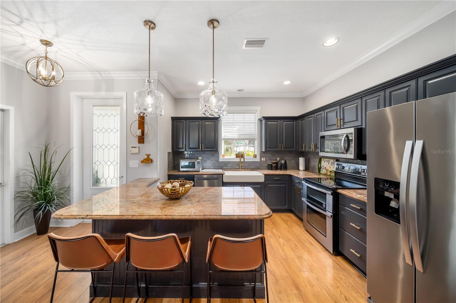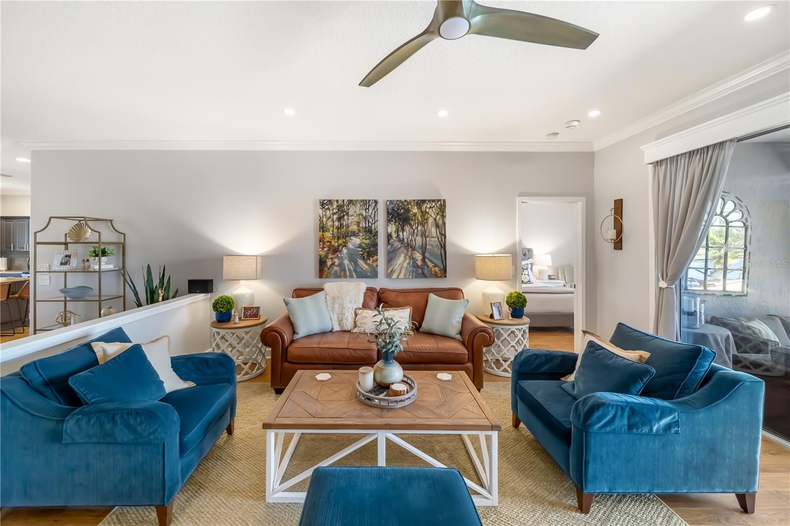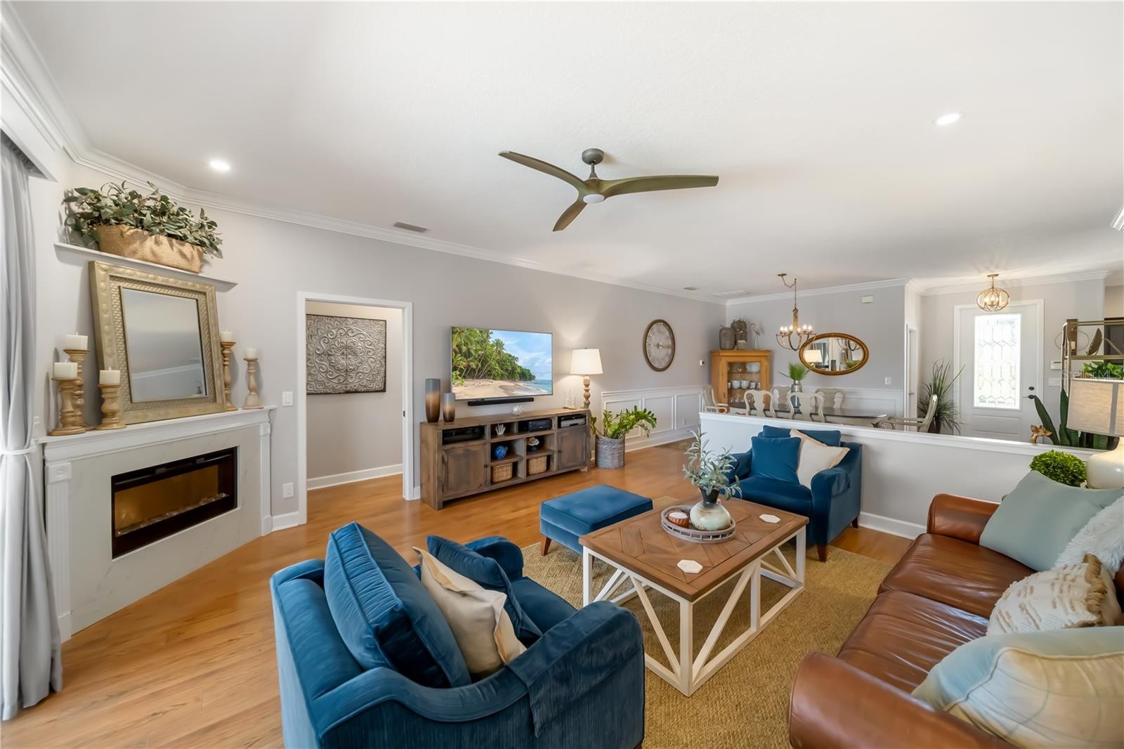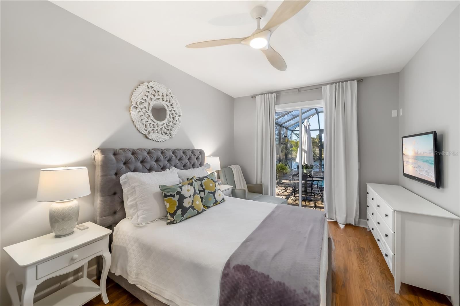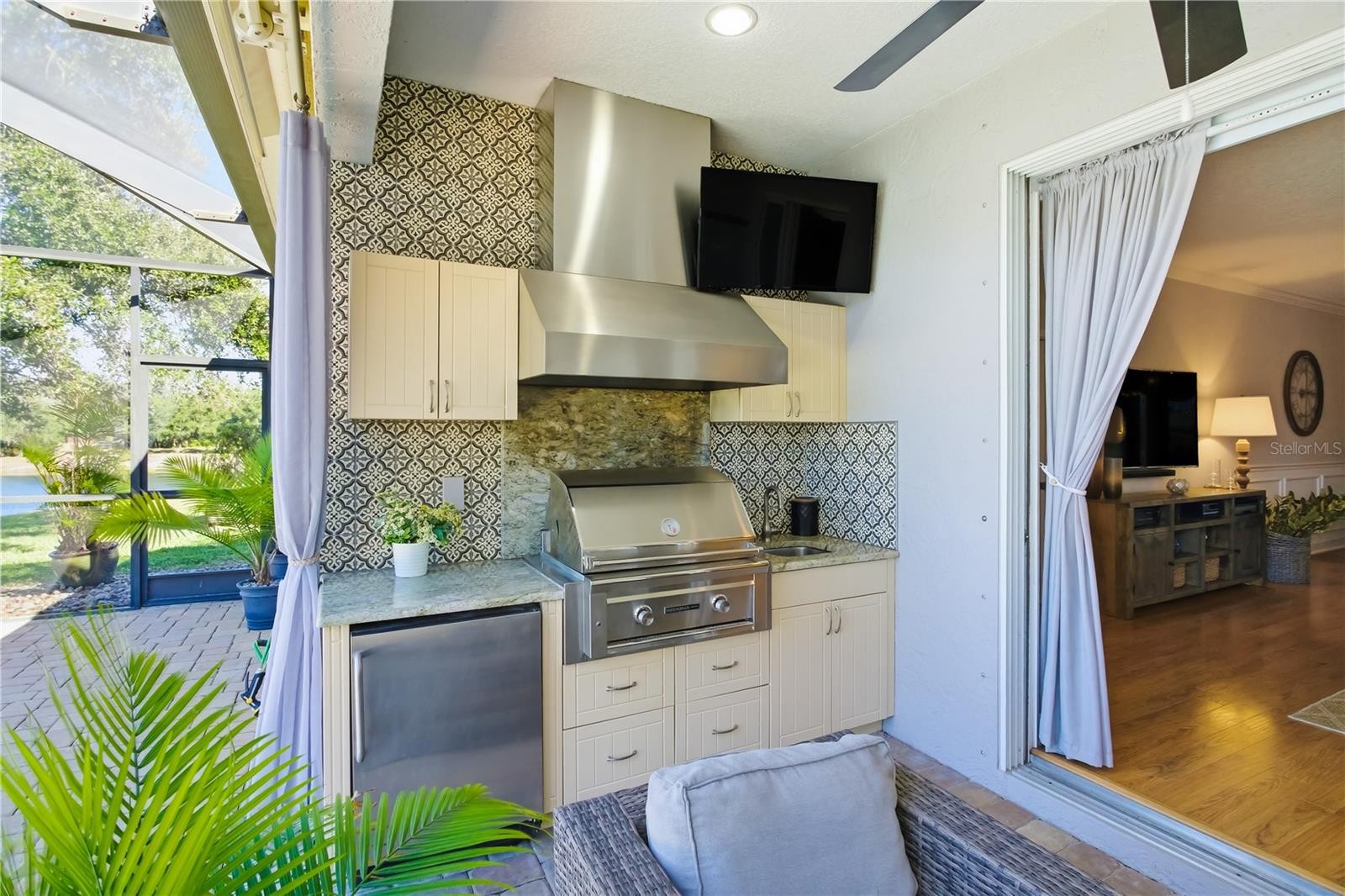 Enjoy PRIVATE Breathtaking Views and Stunning Florida Sunsets Right from Your Backyard in this 3 Bedroom, 2 Full Bath, model-like Home on the Water, with NEW ROOF! NO CDD fees and low HOA dues, this exceptional Lakefront Home offers outstanding value. The expansive lanai features a 28’ x 40’ seamless illusion screen blending indoor and outdoor living, with a heated saltwater pool, covered sitting area with a 10’ x 18’ motorized retractable awning, TV, outdoor kitchen with Lynx BBQ grill, updated burner and briquette tray, refrigerator, vent hood, and sink—perfect for outdoor entertaining! There's also a playground right across from your front door as well! Inside, the beautiful look of hardwood flooring with the convenience and durability of laminate flows throughout the house, complemented by updated light fixtures and a palette of natural, neutral hues. The kitchen offers stainless steel appliances, granite countertops, decorative backsplash, and large porcelain farmhouse-style sink. The primary suite is separate from guest bedrooms and includes dual vanities, updated countertops, a walk-in shower, and lanai access. (Reinhardt Home) Beautiful landscaping enhances both the front and rear yards, supported by an efficient irrigation system. A new roof adds peace of mind. Additional highlights include hurricane shutters, a garage with hanging storage racks and attic pull-down access. Ideally located near UTC Mall, the airport, great dining options, & more! this home offers Florida living at its finest.