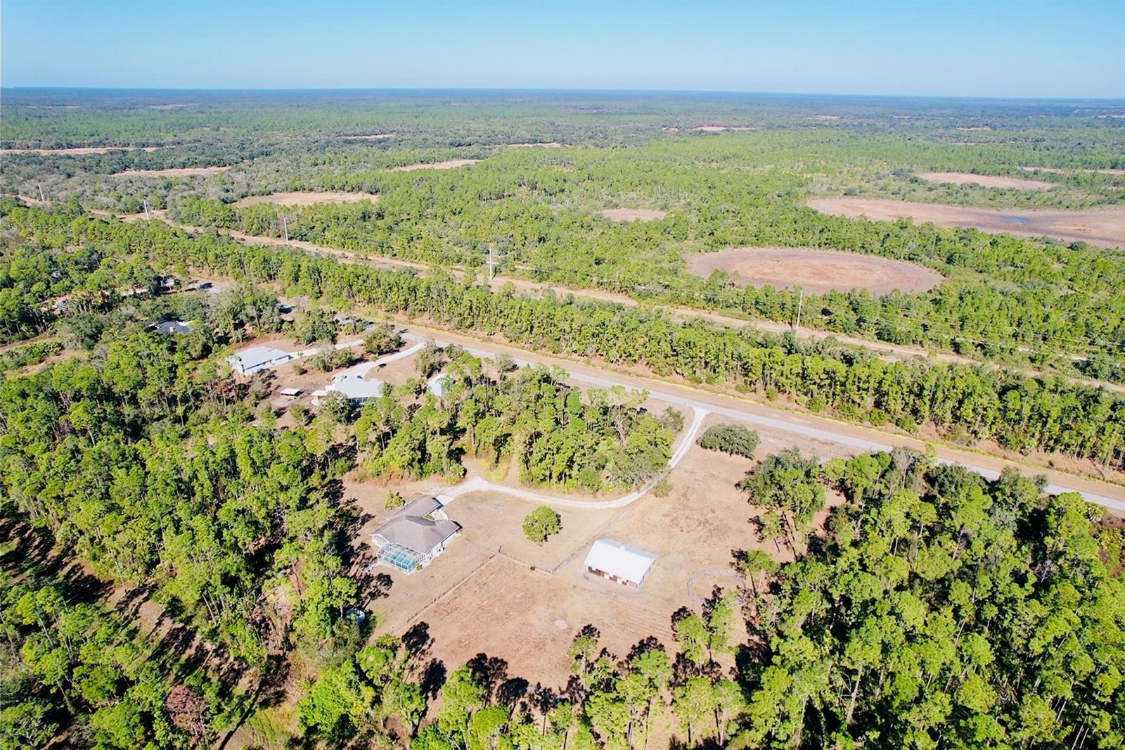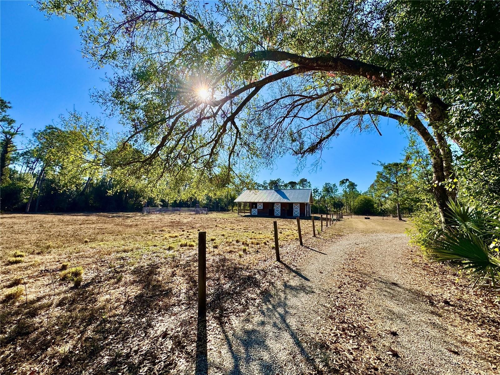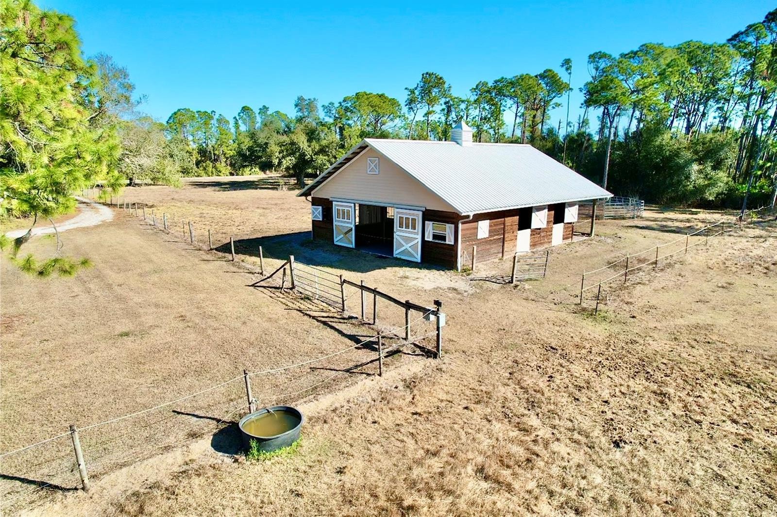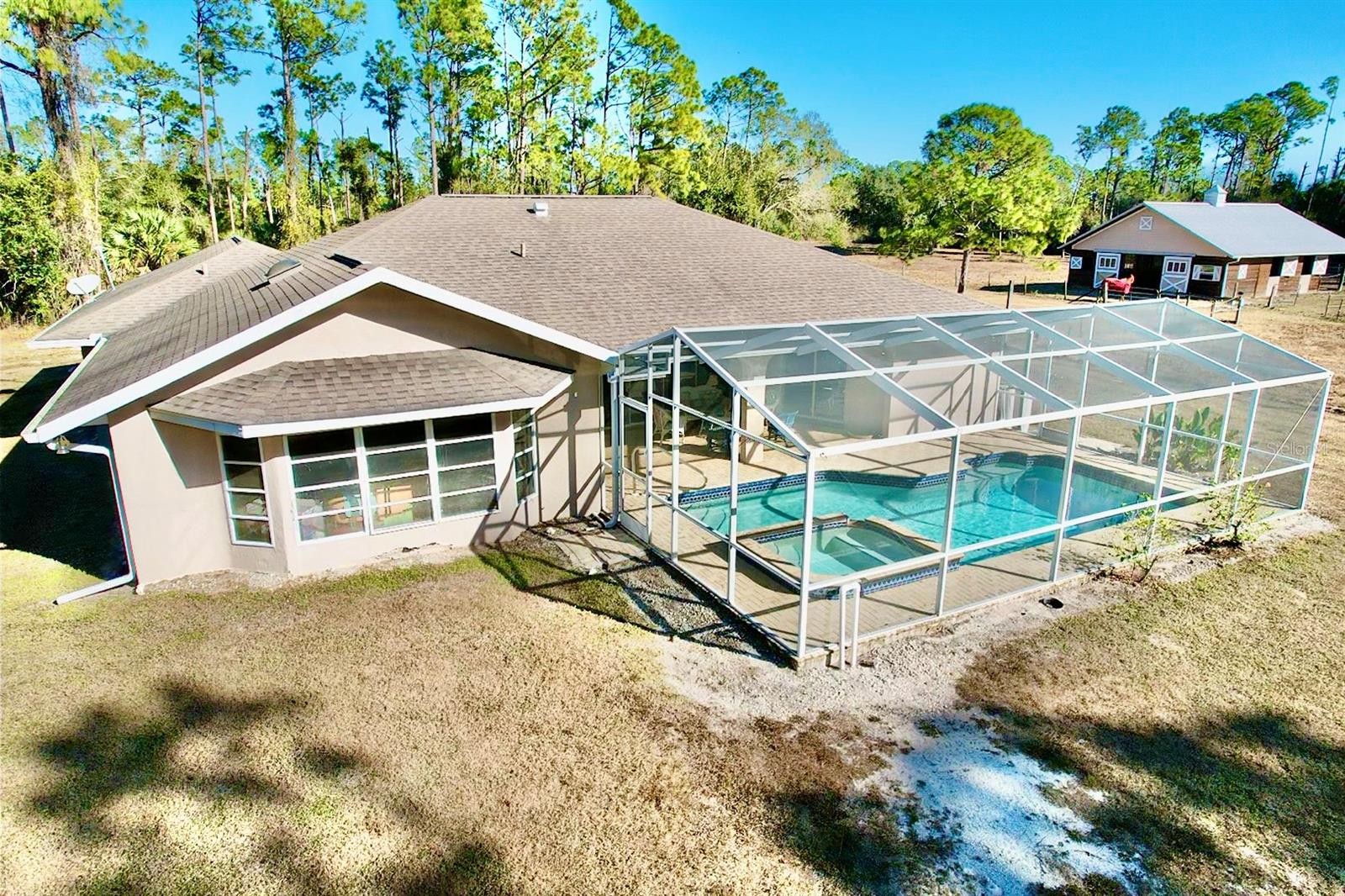 Set on 6.02 acres, partially fenced in North Port Estates, this private, high-and-dry equestrian estate is truly a horse lover’s paradise. Tucked far back from the road with a private entrance, the property offers unmatched peace, privacy, and natural beauty—complete with visiting deer and turkeys. The five-stall barn (NEW 2020) is thoughtfully designed with a wash area, sitting back porch, 12x12 tack and feed room, automatic waterers in each stall, and expensive specialty mats to keep stalls exceptionally clean. Elevated construction, cross-ventilation, and a high-pitched roof keep the barn 10° cooler in summer! The 3-acre horse pasture provides plenty of room to roam with riding trails nearby. The 4-bedroom, 2-bath home (2,258 sq. ft under air) features rich Brazilian mahogany wood floors, fluffy carpet in three bedrooms and a beautifully remodeled kitchen with all-wood soft-close cabinetry, pull-out shelves, a large center island, farm sink, quartz countertops, reverse osmosis under kitchen sink and stainless steel appliances. Entertain effortlessly in the formal living and dining rooms or the spacious family room with a bay window and three pocketing sliders that open fully to the outdoor living space. Outside, enjoy a 15x30 heated saltwater pool, 5-person spa added in 2020 with color-changing LED lights, expansive pool deck, and a pavered lanai—perfect for relaxing while watching your horses graze. Additional highlights include a two-car garage with epoxy flooring, PEX plumbing throughout, updated and maintained well equipment, excellent insulation, and an ADT security system with outdoor cameras and monitor. Not in a flood zone and surrounded by serene nature. This exceptional property blends luxury living with premier equestrian amenities.